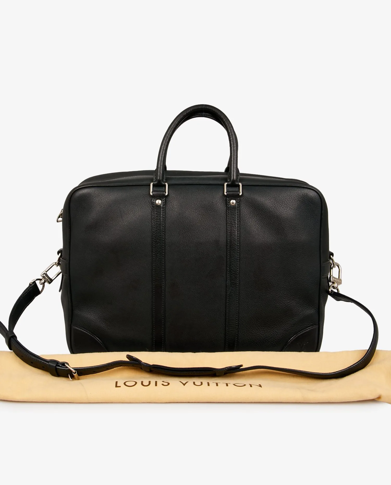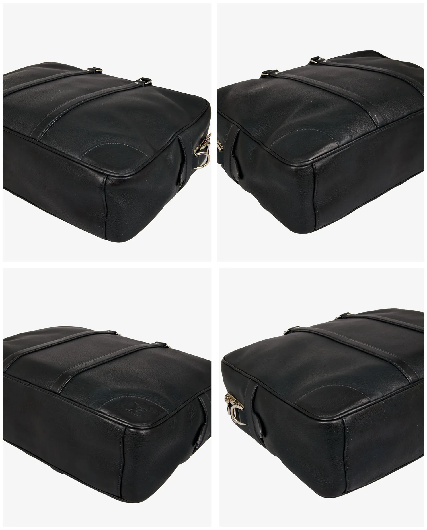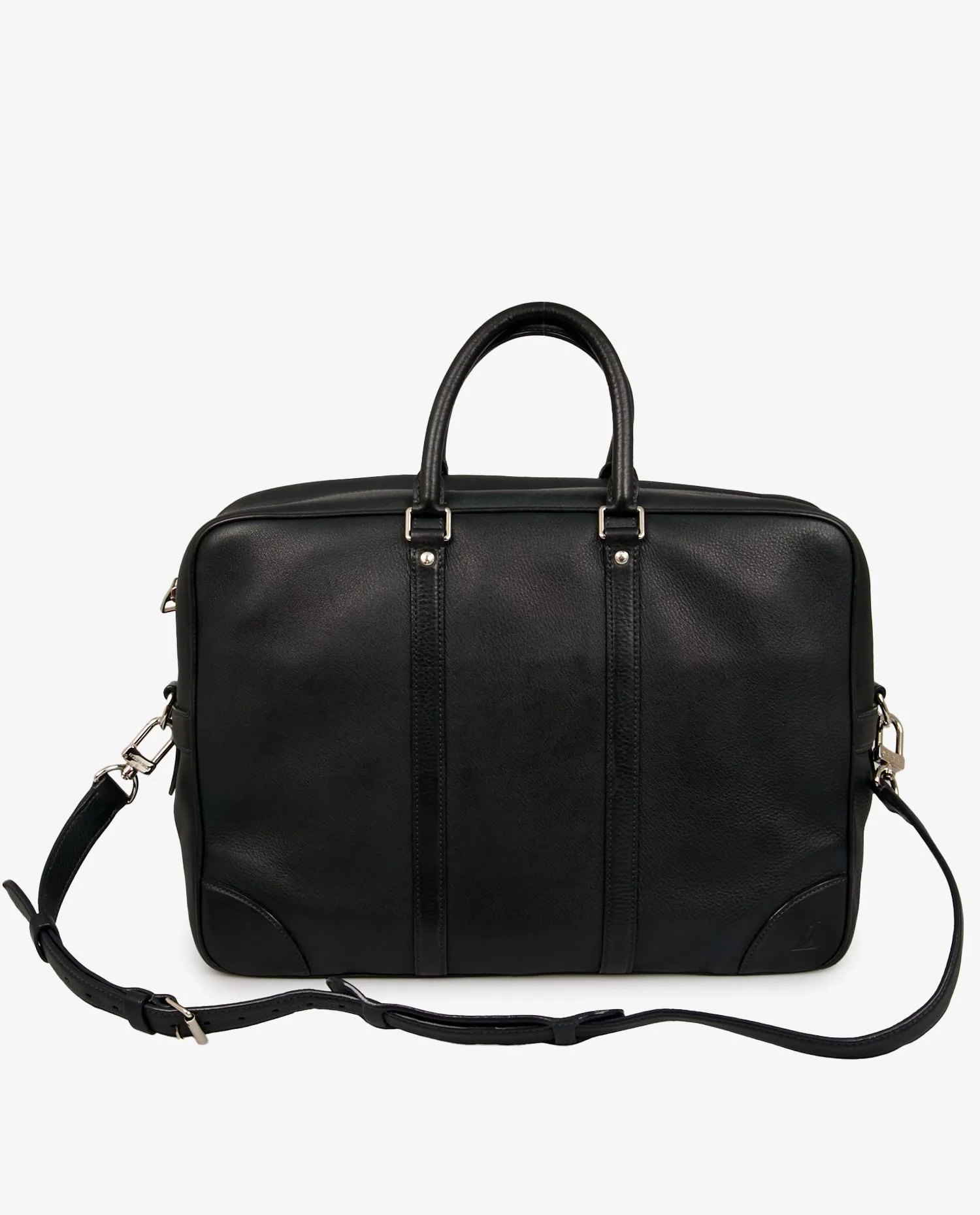 Louis Vuitton satchel in navy blue grained leather. The jewelry is in silver-plated metal. Zipper closure. Carried by hand or on the shoulder with an adjustable, removable shoulder strap. The interior is in gray checkerboard fabric. It features a large zipped pocket and a dedicated slot for your laptop. In very good condition. It will be delivered in its original dustbag.
