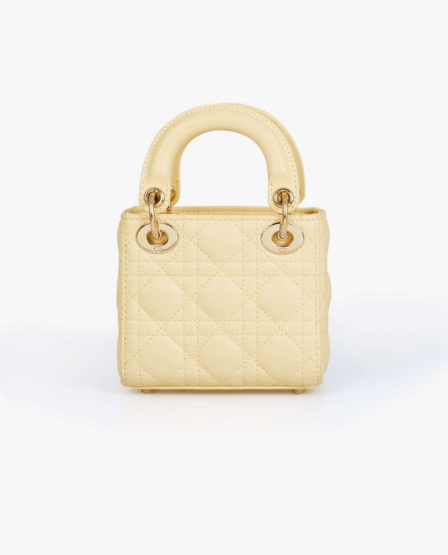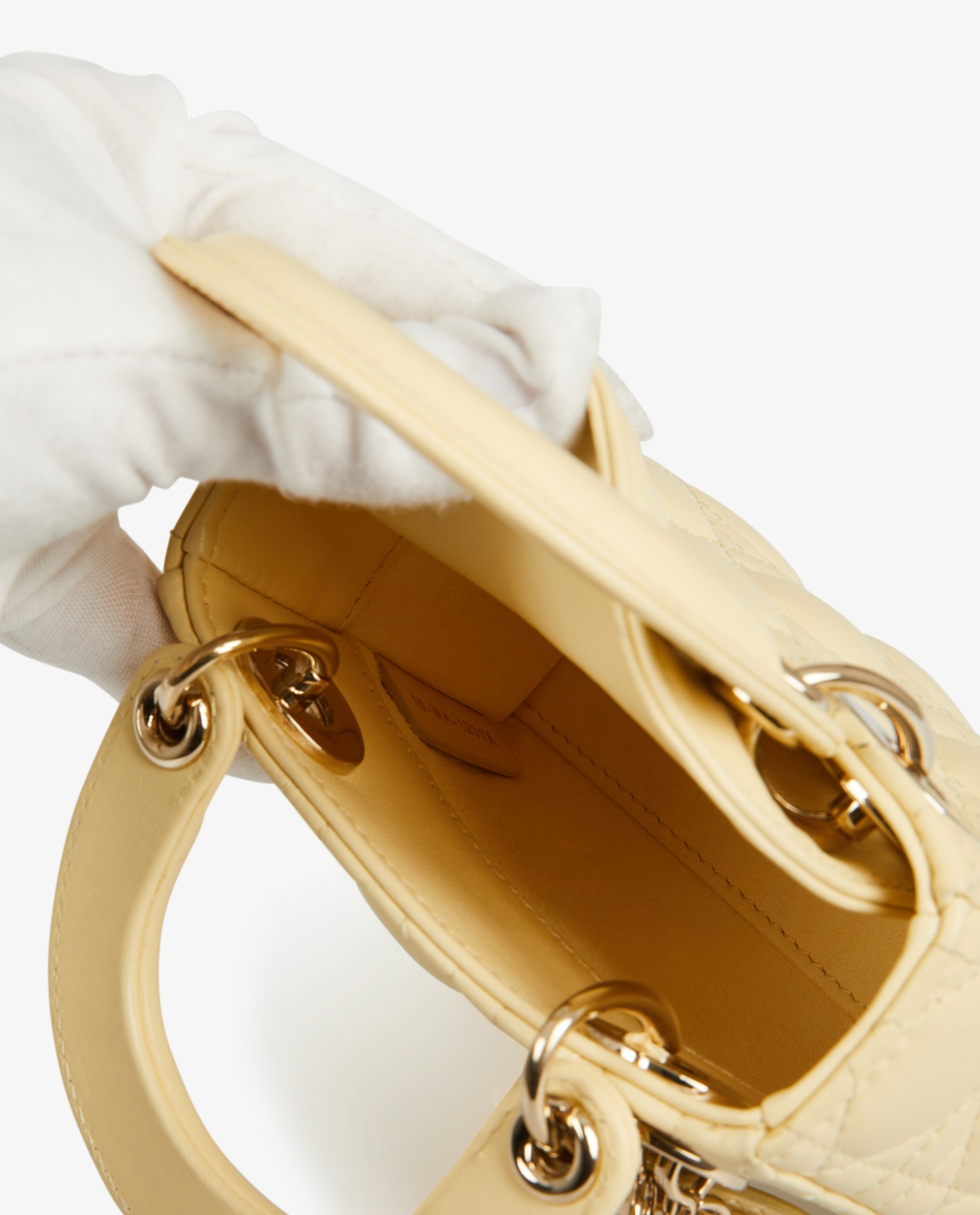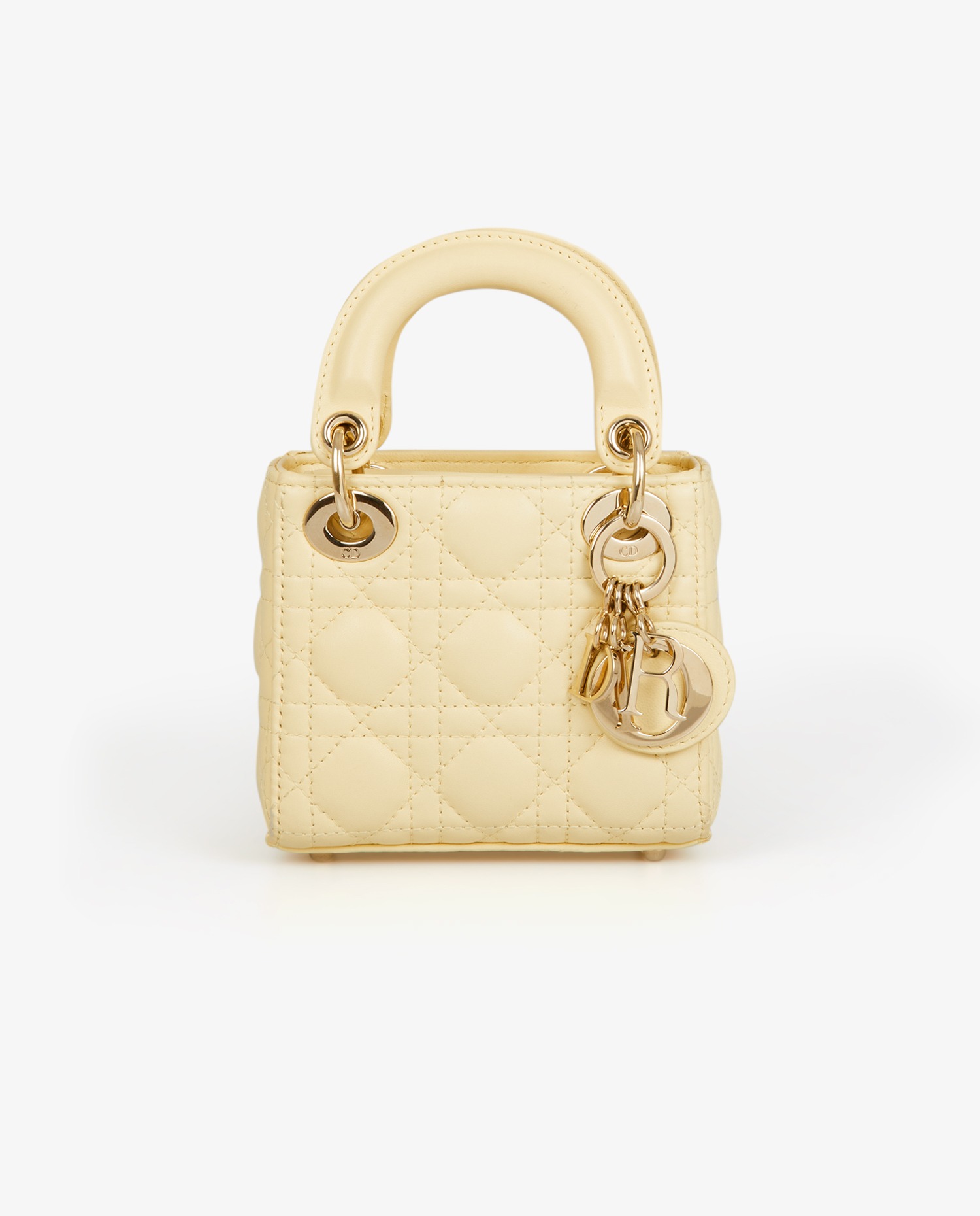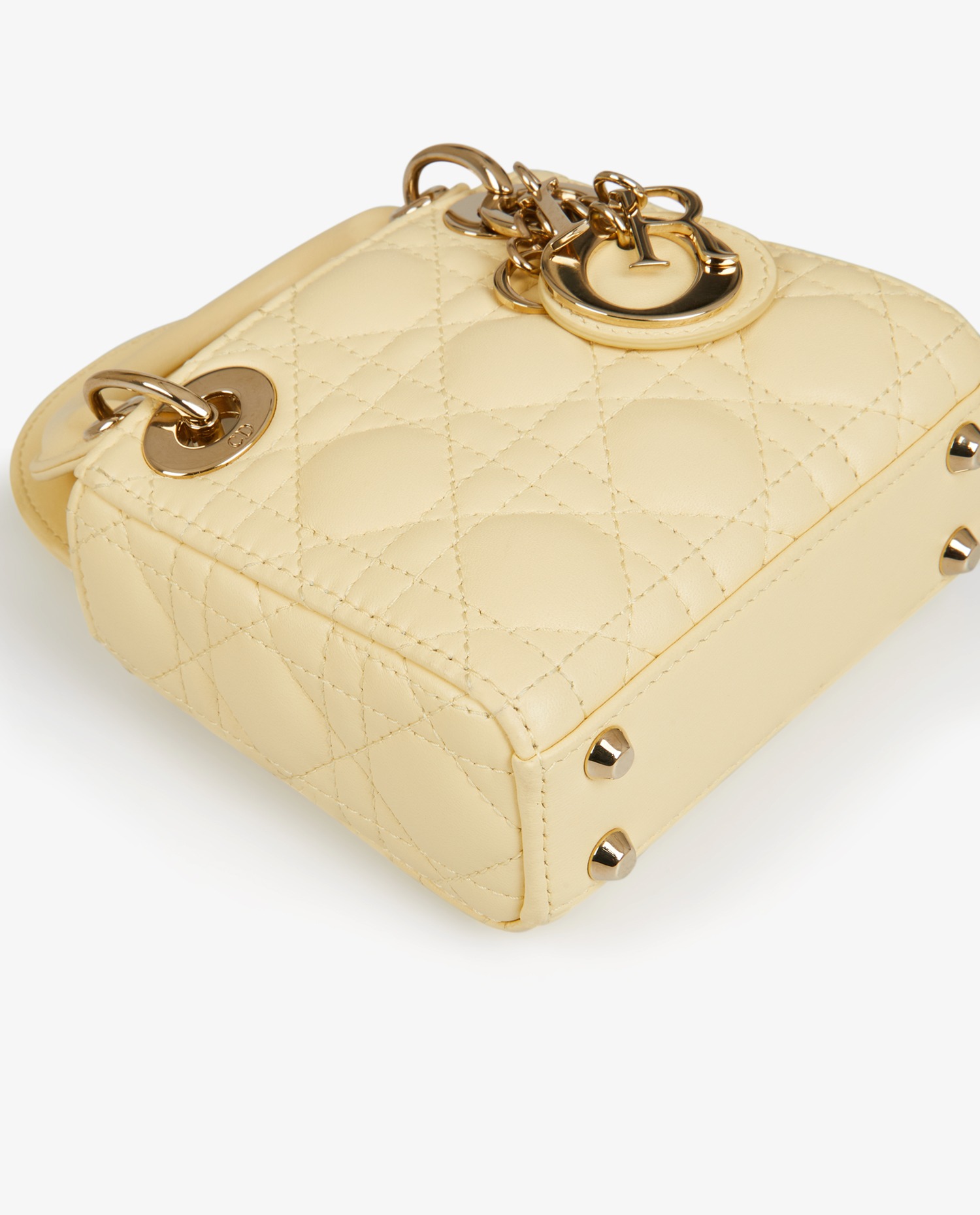 Micro Lady Dior bag in yellow lambskin with Cannage stitching. It can be worn by hand, on the shoulder or as a crossbody with an adjustable, removable shoulder strap measuring 95cm. Public price 3100e. In very good condition.