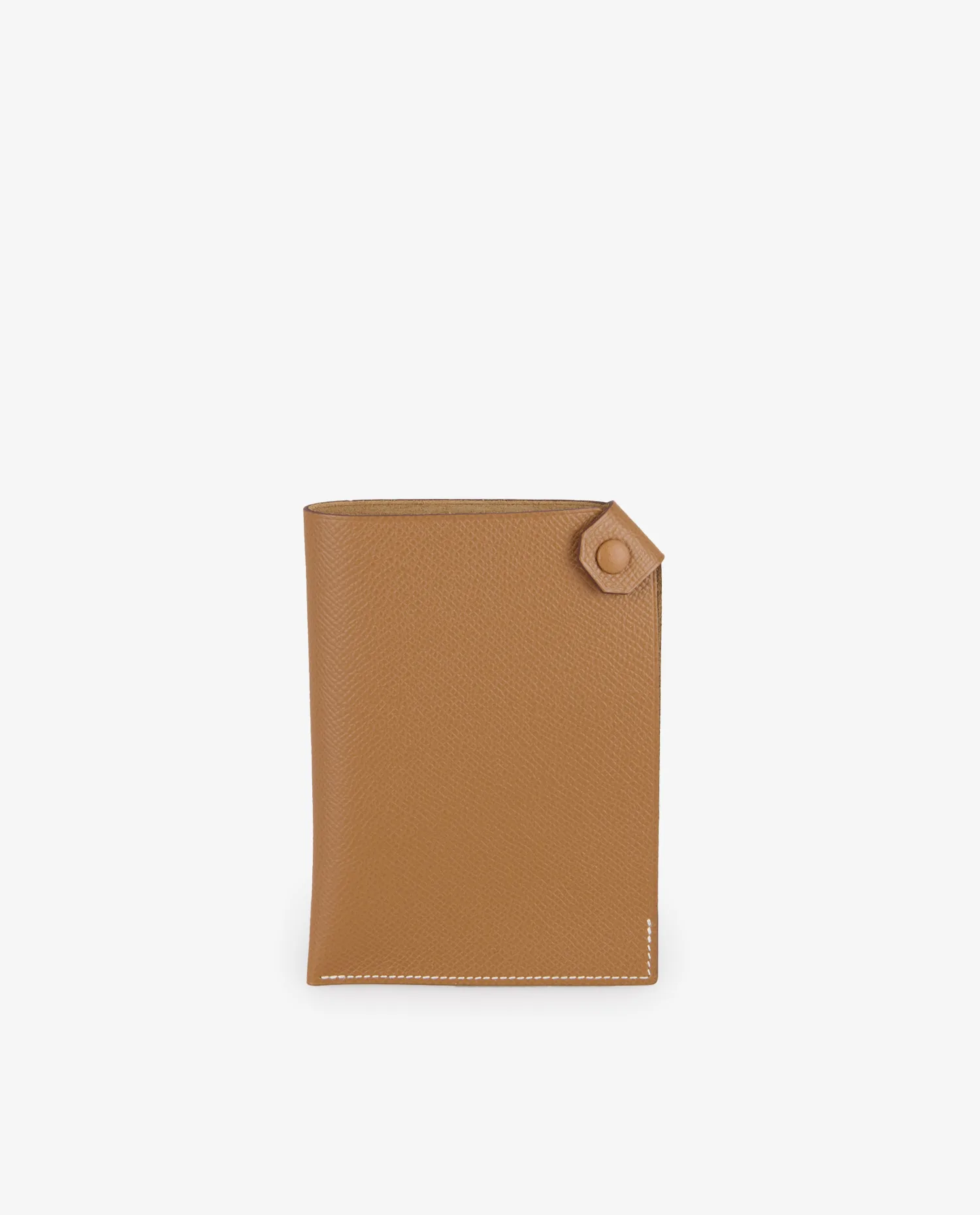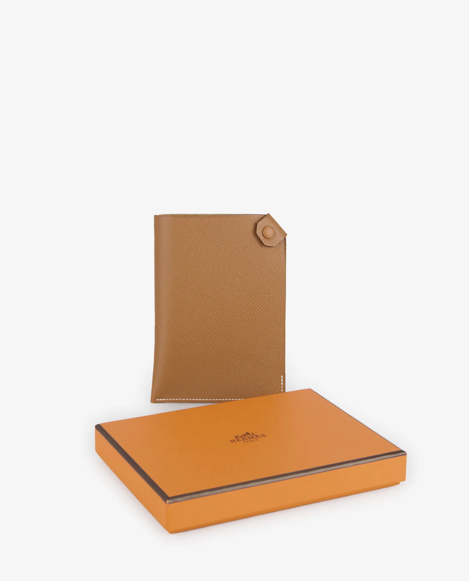 Epsom gold leather features a regular pressed grain that is more resistant to scratches and the marks of time. Its warm camel hue, highlighted by contrasting white stitching, evokes the emblematic codes of the house. The case adopts a simple rectangular shape with slightly rounded corners and a flap secured by a matching sheathed snap fastener. The Hermès Paris logo is discreetly embossed on the back.