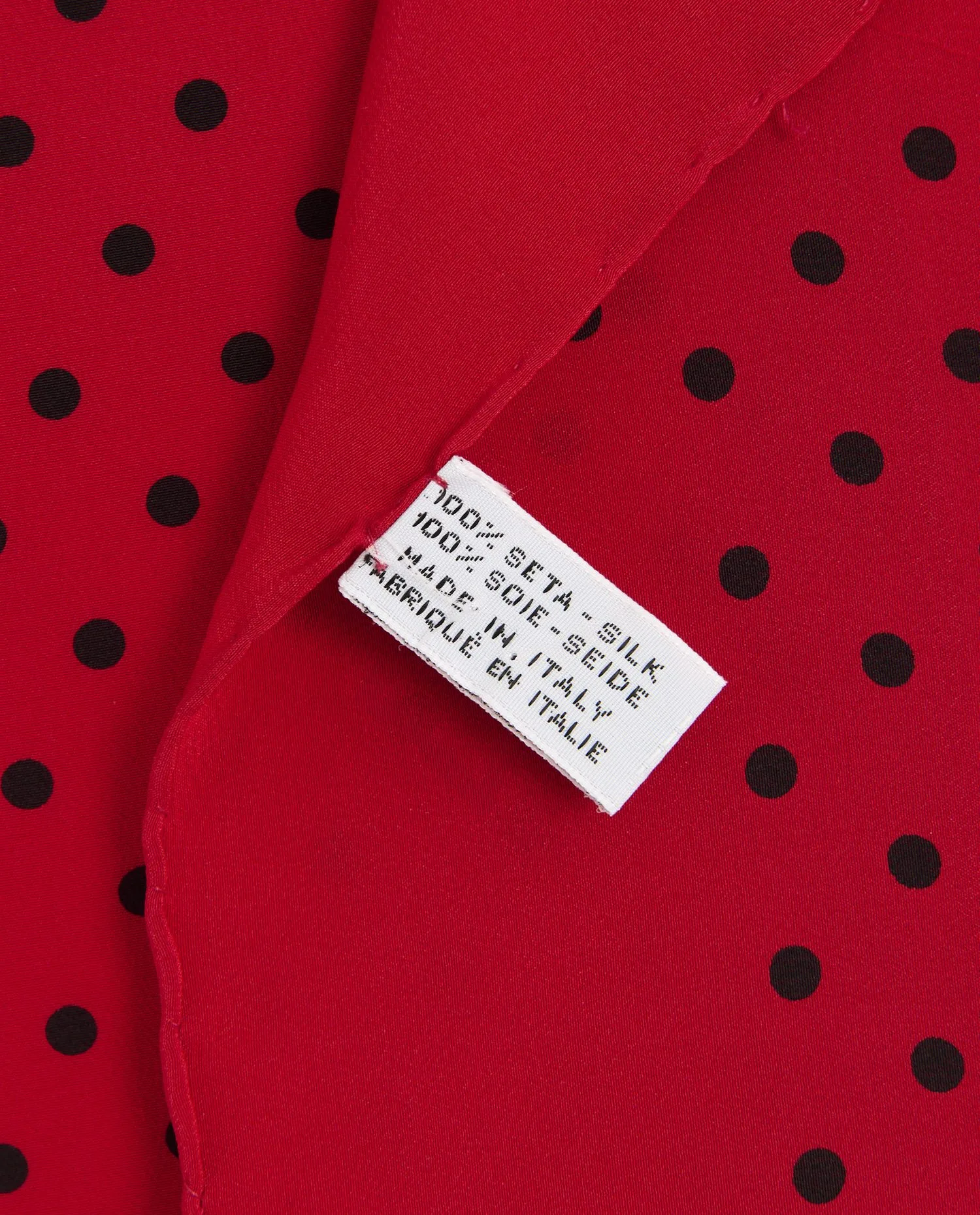 Details: Format 42 x 42 cm, ideal for versatile wearing. Deep red background, homogeneous and perfectly saturated. Pattern of black polka dots distributed evenly across the entire surface, creating a balanced visual rhythm. Double black C integrated into a corner of the square, structuring the composition without overloading. Chanel signature discreetly printed. 100% silk with a soft and supple touch, with a fine and regular weave offering a beautiful hold while maintaining fluidity and lightness. Interior label mentioning the composition and manufacturing Made in Italy. Clean finishes and neat hems. This format lends itself particularly well to being worn folded in a bandana-style triangle, tied near the neck, but can also be worn as a headband, attached to the handle of a bag or wrapped around the wrist.