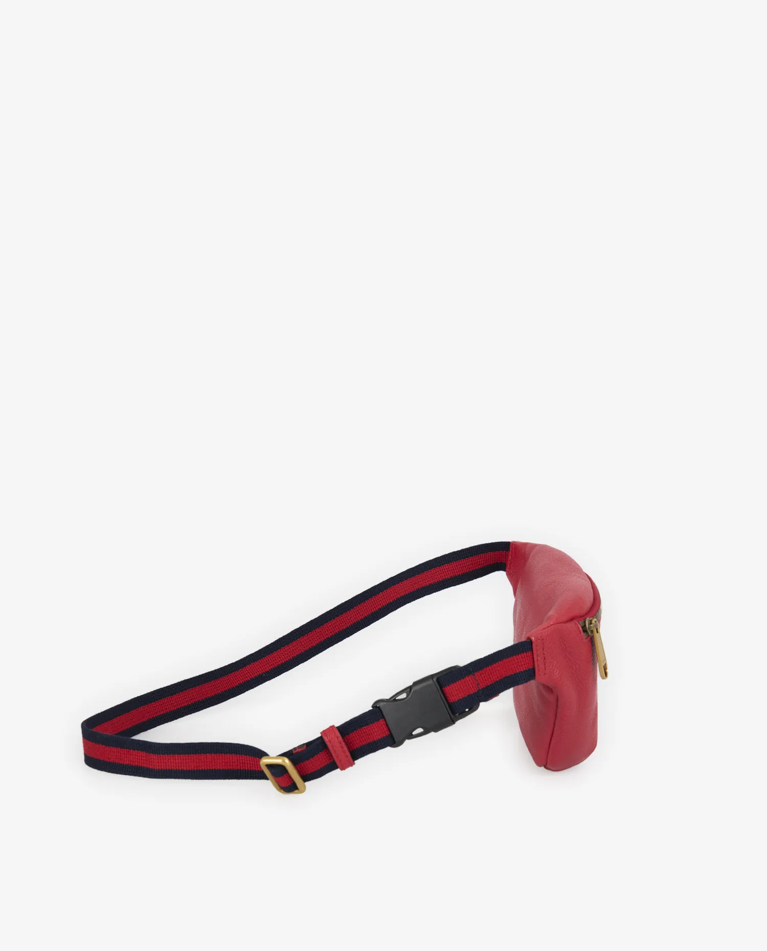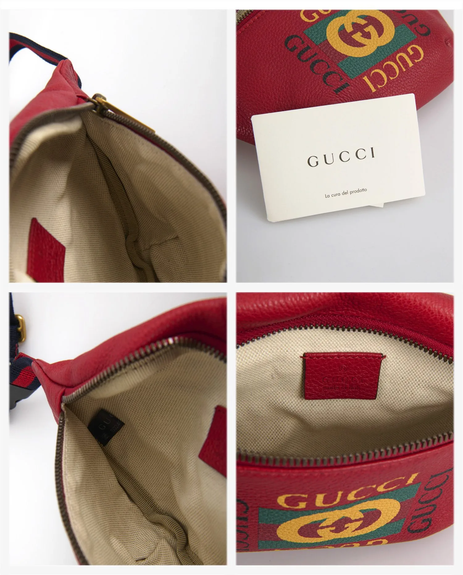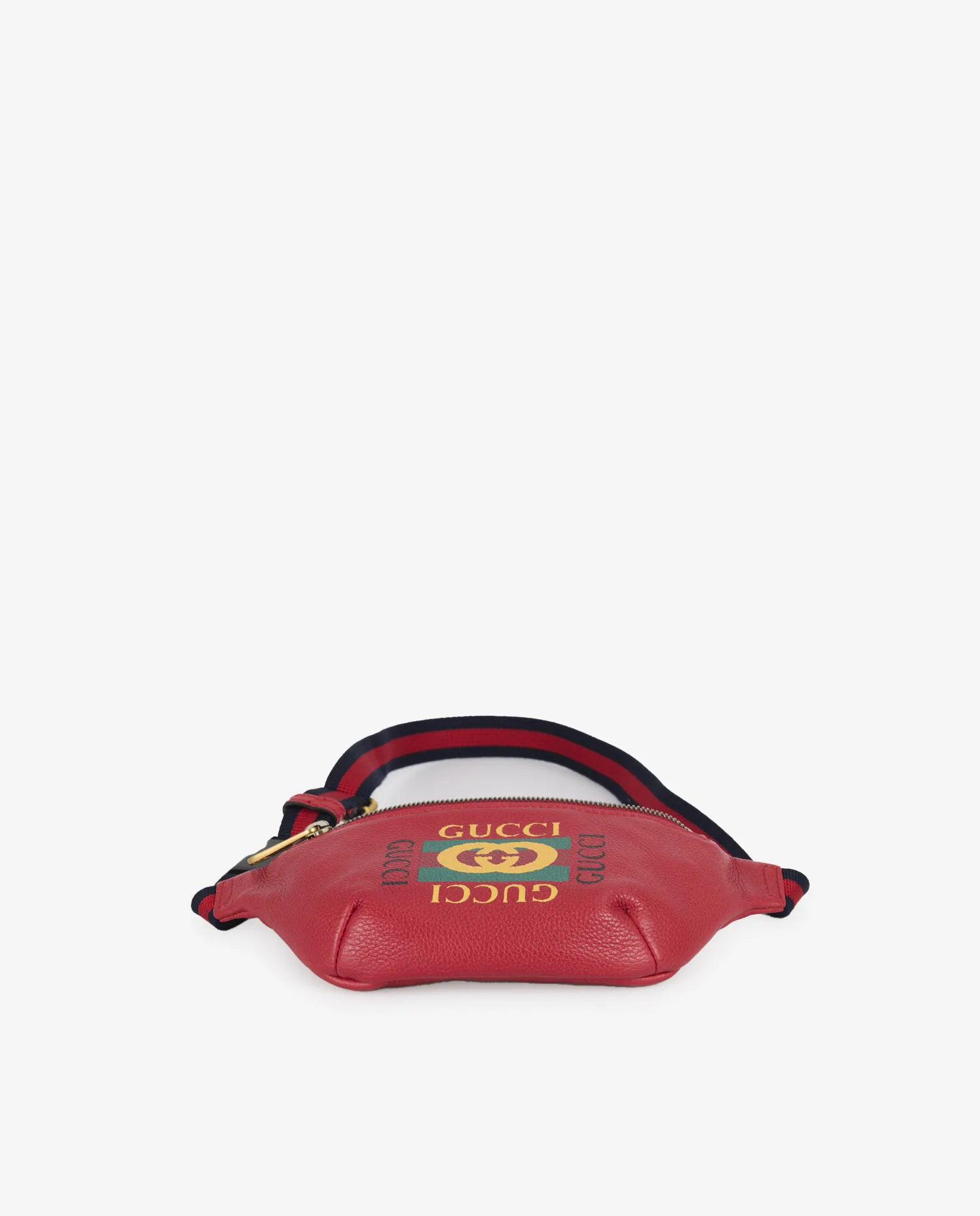 Red grained leather features a distinctive texture, both supple and durable, with a matte finish. Visible stitching reinforces the corners and ensures lasting strength. The GUCCI logo is printed four times around the interlaced central GG emblem, in a symmetrical design typical of the ’80s. The gold zipper is accompanied by a sturdy metal zip. The navy blue and red striped canvas shoulder strap features a brass buckle adjustment and a black clip clasp for a secure hold.