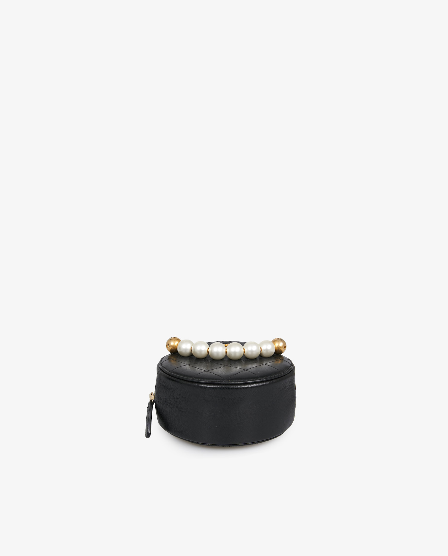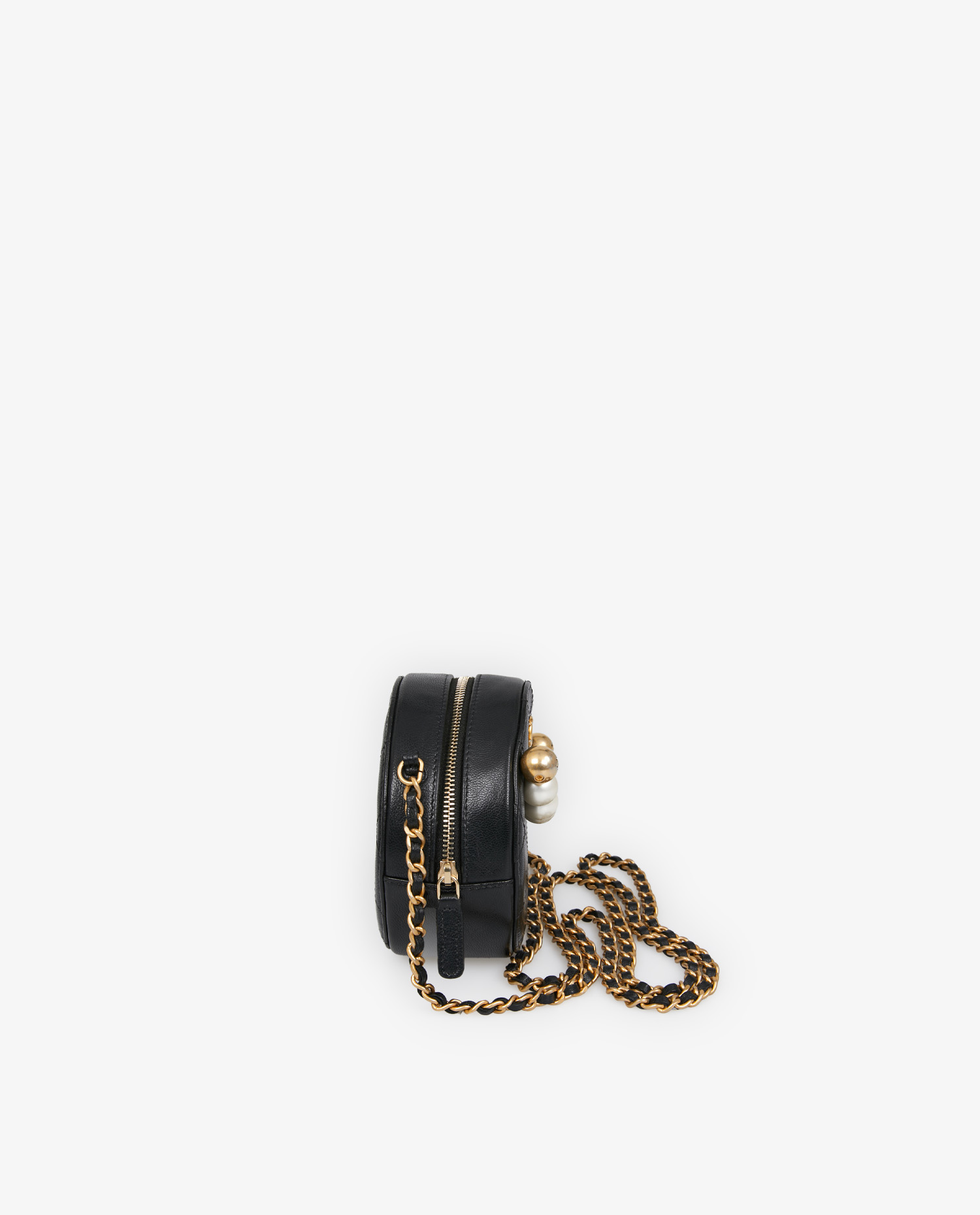 Quilted black fine-grain leather is enhanced by a play of topstitching forming the traditional diamond pattern. On the front, a line of white synthetic pearls, framed by two gold spheres engraved with the Chanel logo, adds a jewel-like accent. The golden metal zip fastener encircles the bag. The gold chain shoulder strap interlaced with leather allows for adjustable carrying. The back of the bag features classic quilting without additional embellishment.