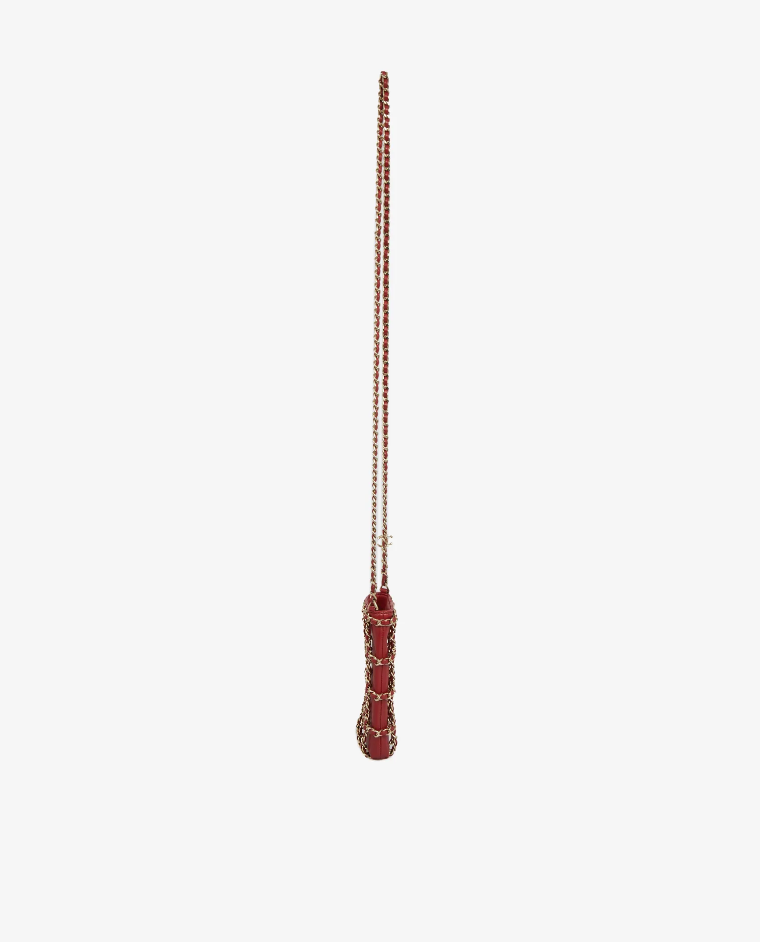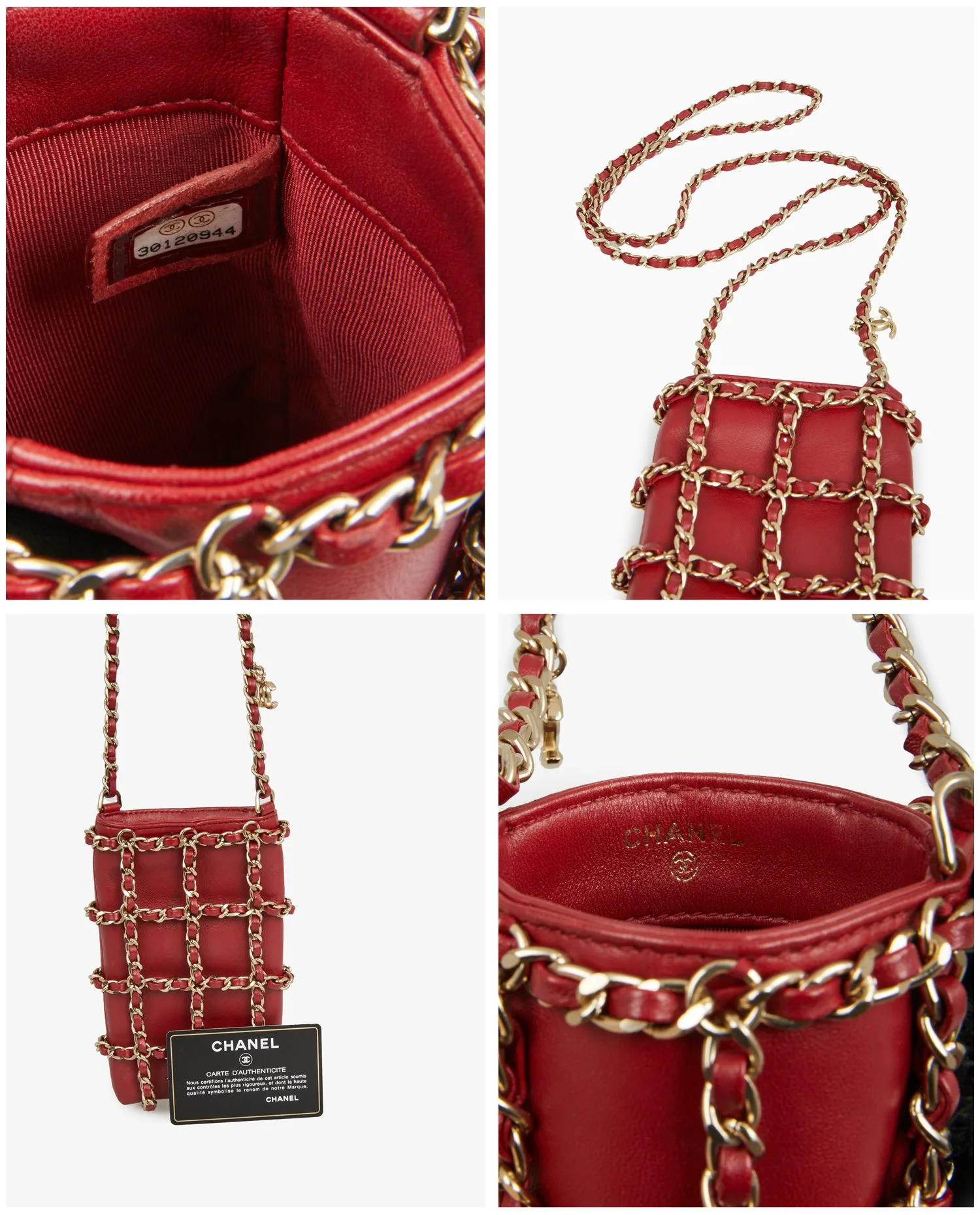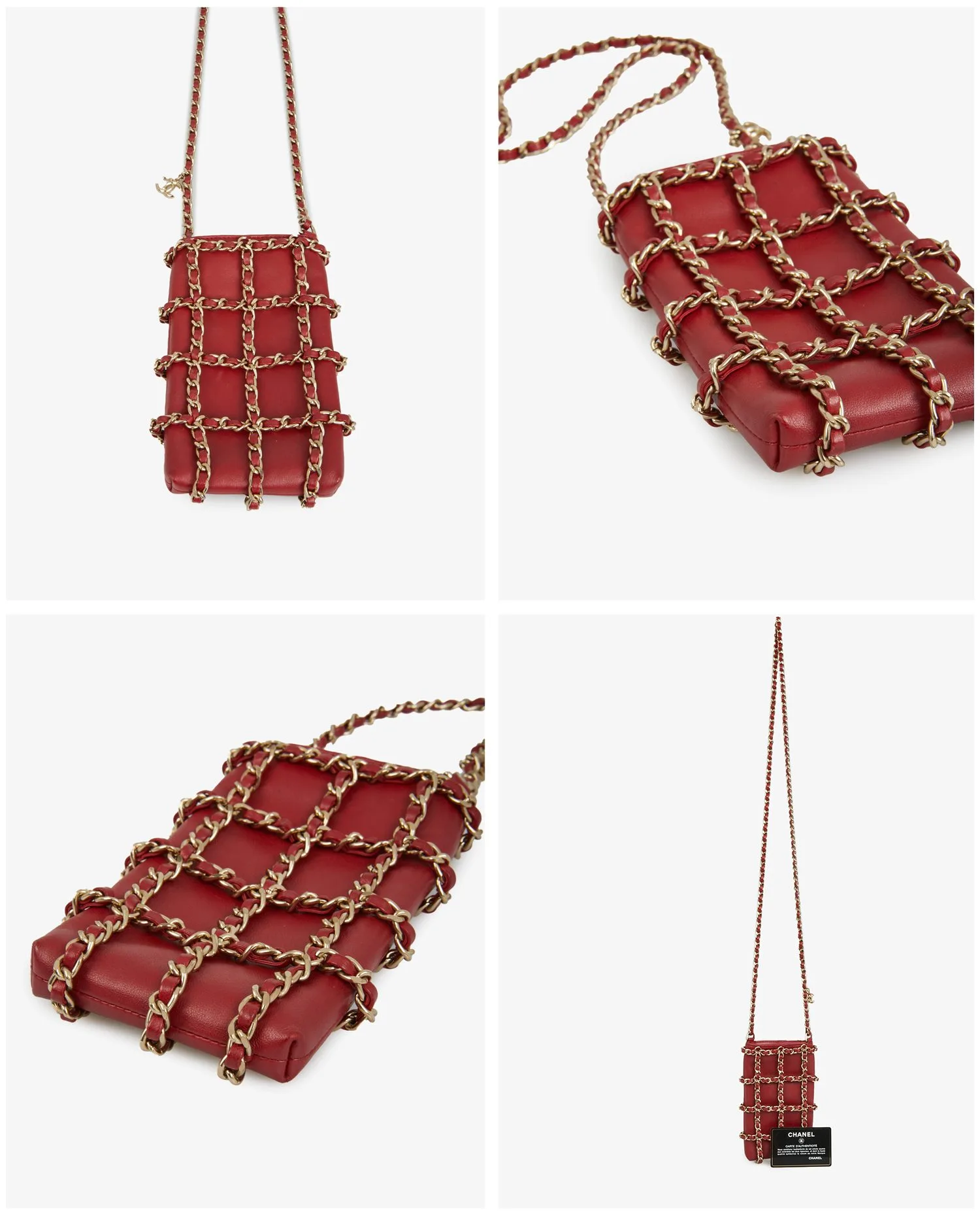 History of the Model: This type of mini bag is part of a trend that appeared at Chanel in the 2010s, responding to changing uses and the rise of luxury functional accessories. Combining the elegance of Chanel quilting and the practical aspect of the phone bag, this model embodies the house’s adaptation to new mobility codes, while retaining its visual signatures – interwoven chain, precious leather and careful finishing. Exterior Details: The structure of the bag is sheathed in smooth red leather, with a semi-shiny and supple finish. A decorative grid is formed by silver chains intertwined with red leather, which cover the entire surface of the bag. The braided chain shoulder strap, emblematic of Chanel, allows it to be worn long on the shoulder or crossbody. The bag measures approximately 10 cm wide by 17 cm high, with a depth of 4 cm, enough for a smartphone and some personal effects. Interior Details: The interior is lined in matching red fabric, with a main open pocket and a small sewn-in label bearing the serial number 30…. The interior space, although small, is designed to hold a phone, cards and fine items. The interior finish remains true to the quality of the house, with crisp stitching and hot-stamped Chanel branding. Product Condition: The bag is in very good condition. The leather has no noticeable scratches or marks. The silver chains retain their shine without oxidation. The interior is clean, with no visible wear. The set has obviously been little worn and has been carefully preserved. Maintenance Tips: It is recommended to keep the bag in its dustbag when not in use to avoid friction on the chains. Lambskin can be occasionally nourished with a specific care product for delicate leathers. Avoid prolonged exposure to sunlight or humidity to preserve the shine of leather and metallic finishes. Why Choose this Product: This 2020/21 vintage Chanel bag combines the contemporary functionality of a phone case and the timeless aesthetic codes of the house. Compact, graphic and elegant, it represents a hybrid piece, both practical and very recognizable. Its rarity on the second-hand market, combined with its excellent condition and its complete provenance (box, dustbag, card), makes it a relevant choice for lovers of current Chanel pieces with a collector’s spirit.