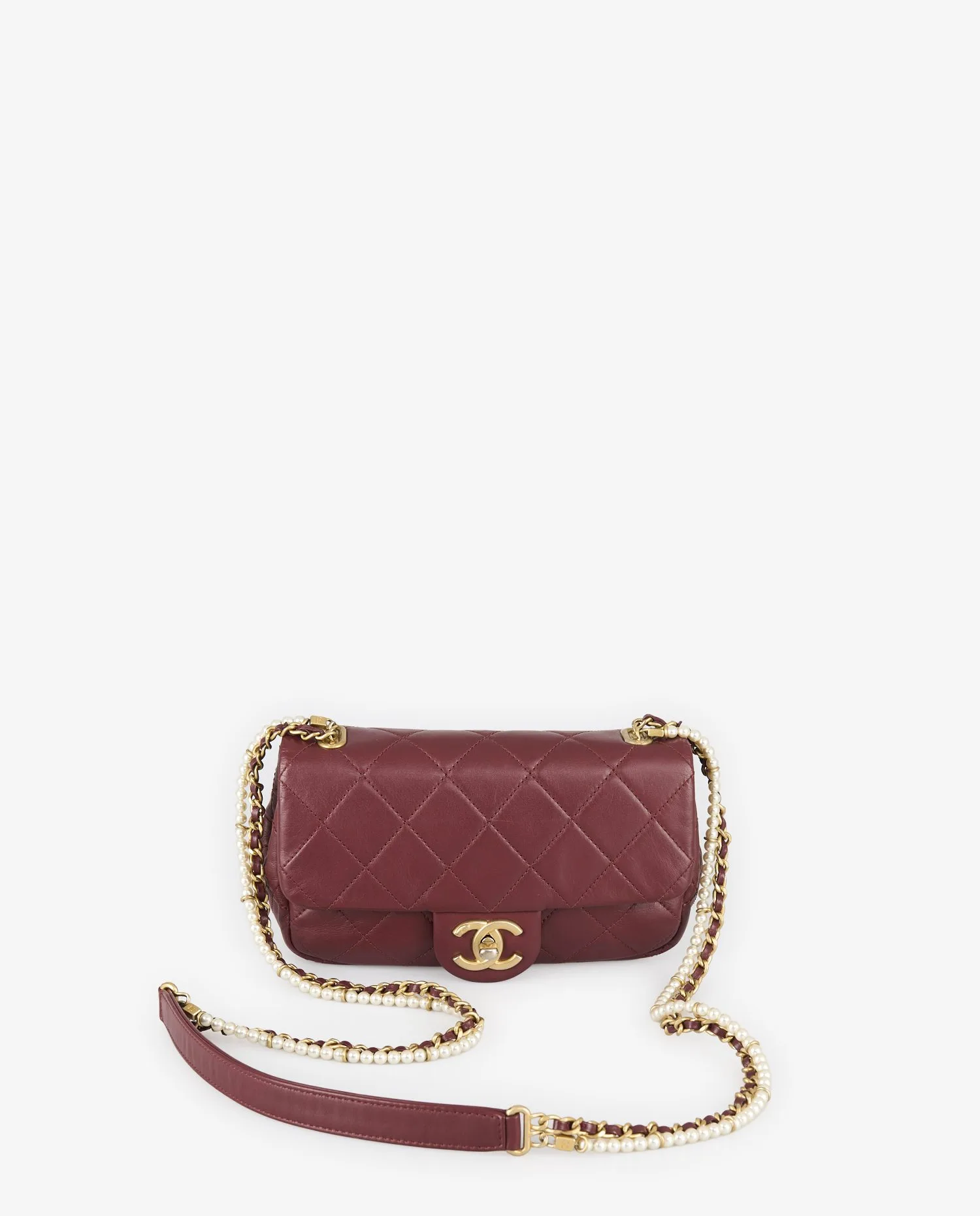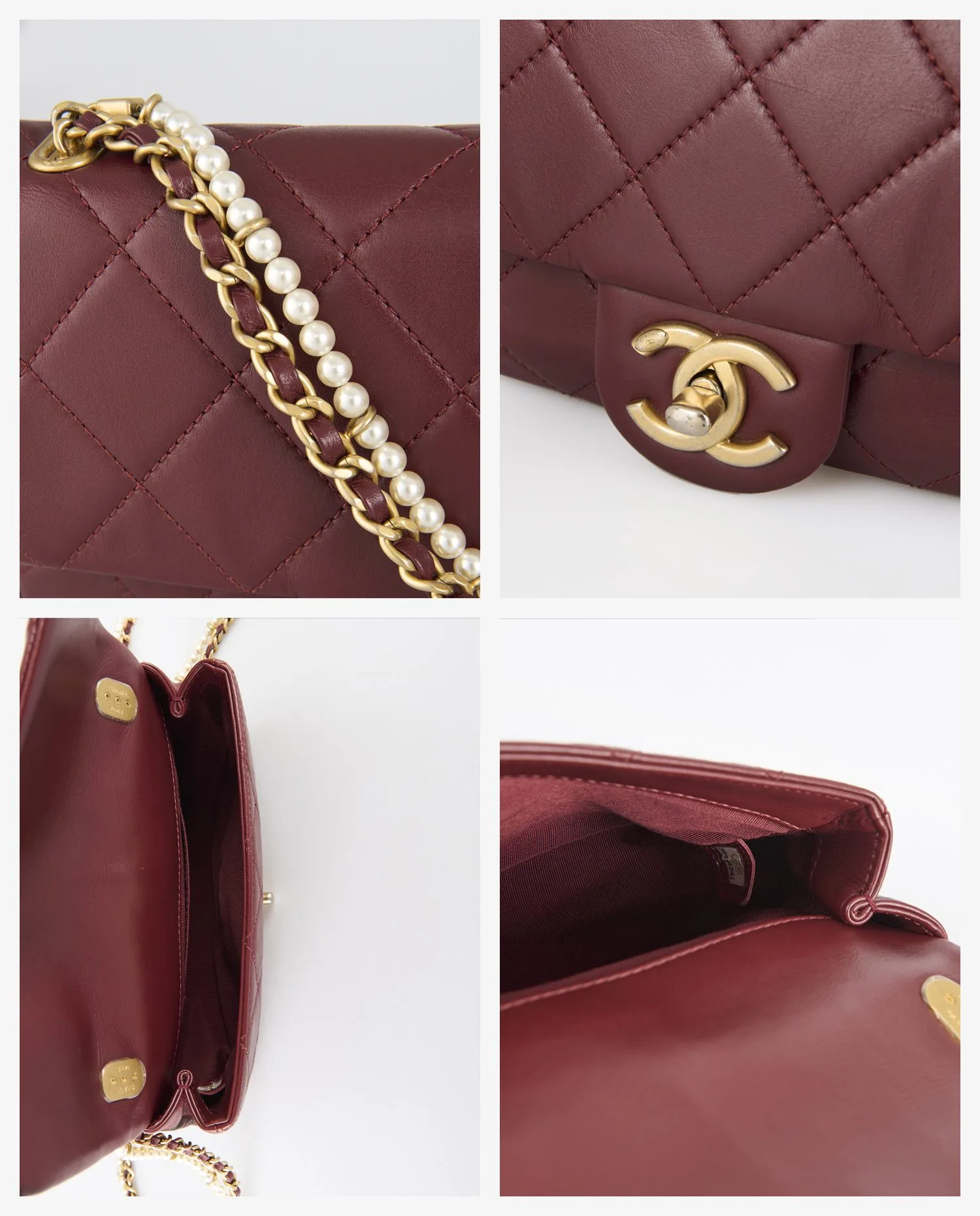 The supple lambskin has a smooth grain and a slightly shiny appearance, enhanced by regular diamond quilting. The deep burgundy hue gives the bag an understated sophistication that’s easy to coordinate. The shoulder strap consists of a gold chain interwoven with matching leather, enriched with white pearls running the entire length. The golden clasp, adorned with the double C, completes the ensemble with a dazzling finish. Dimensions: 20 cm wide, 12 cm high, 5 cm deep.