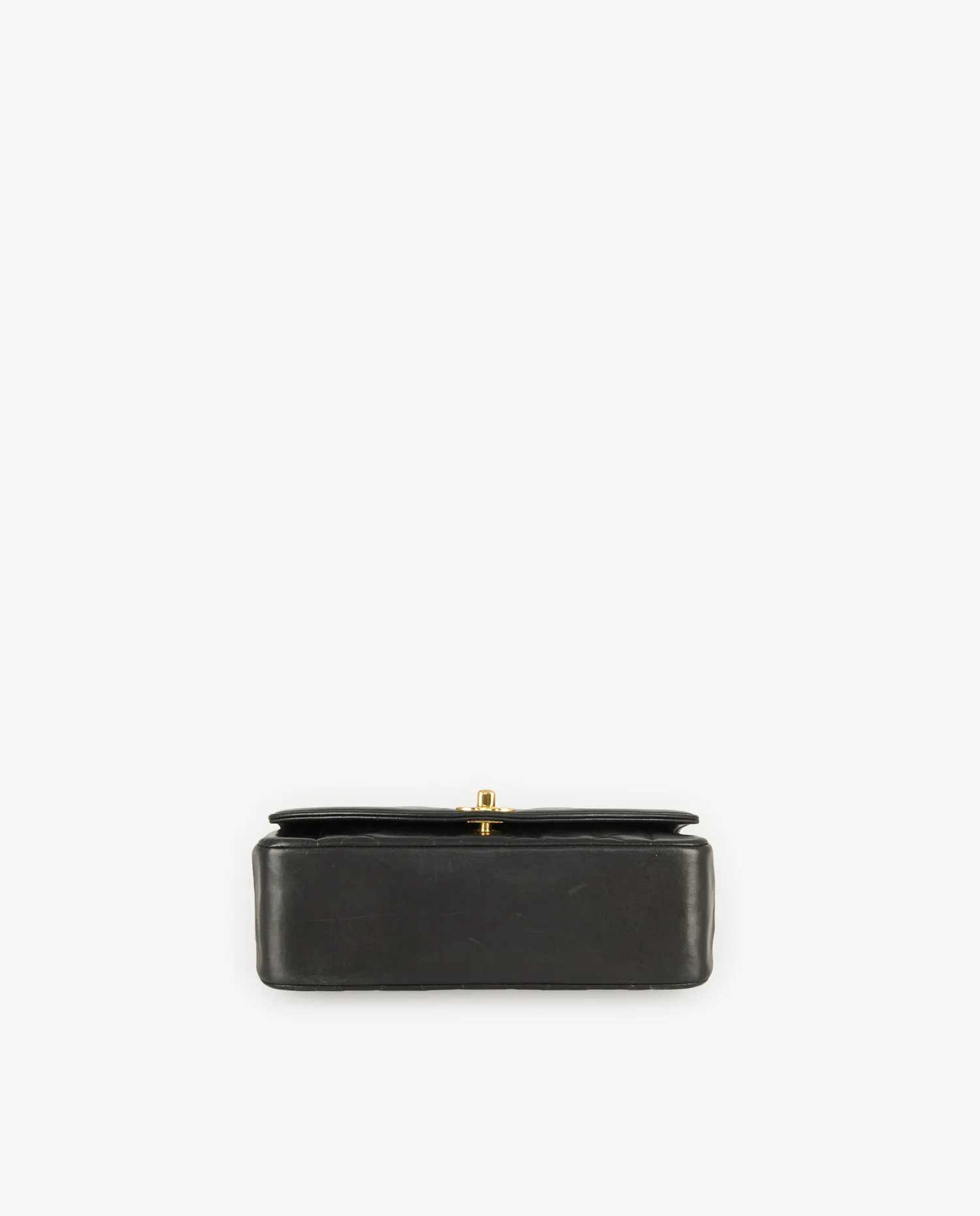 The bag is made of black lambskin, supple and smooth, with diamond quilting characteristic of Chanel creations. The rigid base and slightly rounded contours provide good support to the structure. The gold chain strap woven with leather allows it to be worn on the shoulder or across the body. The iconic gold “CC” clasp highlights the luxurious finish of the bag. Approximate dimensions are 22cm in length, 14cm in height and 6.5cm in depth, ideal for light everyday use or dressy outings.