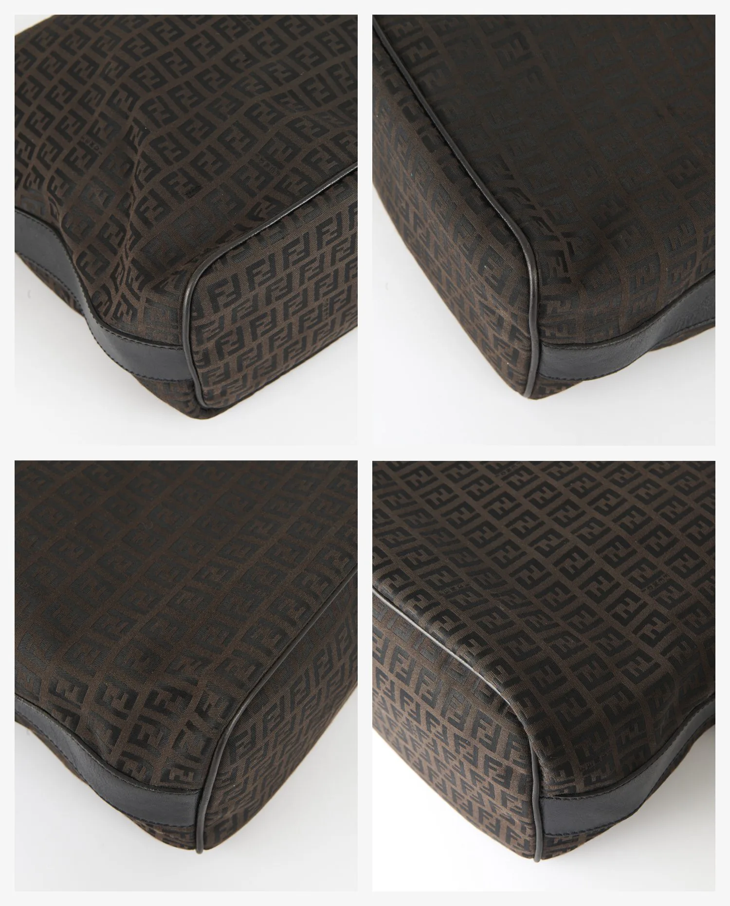 The thick canvas is flexible but resistant, with a very clear and regular FF print. There are no signs of tearing or discoloration to report. The black leather finishes, placed at the ends and at the strap attachments, are in good condition. The thick canvas strap allows for comfortable shoulder carrying. The ruthenium metal jewelry, present on the clips and hooks, is clean, without oxidation, and functional.