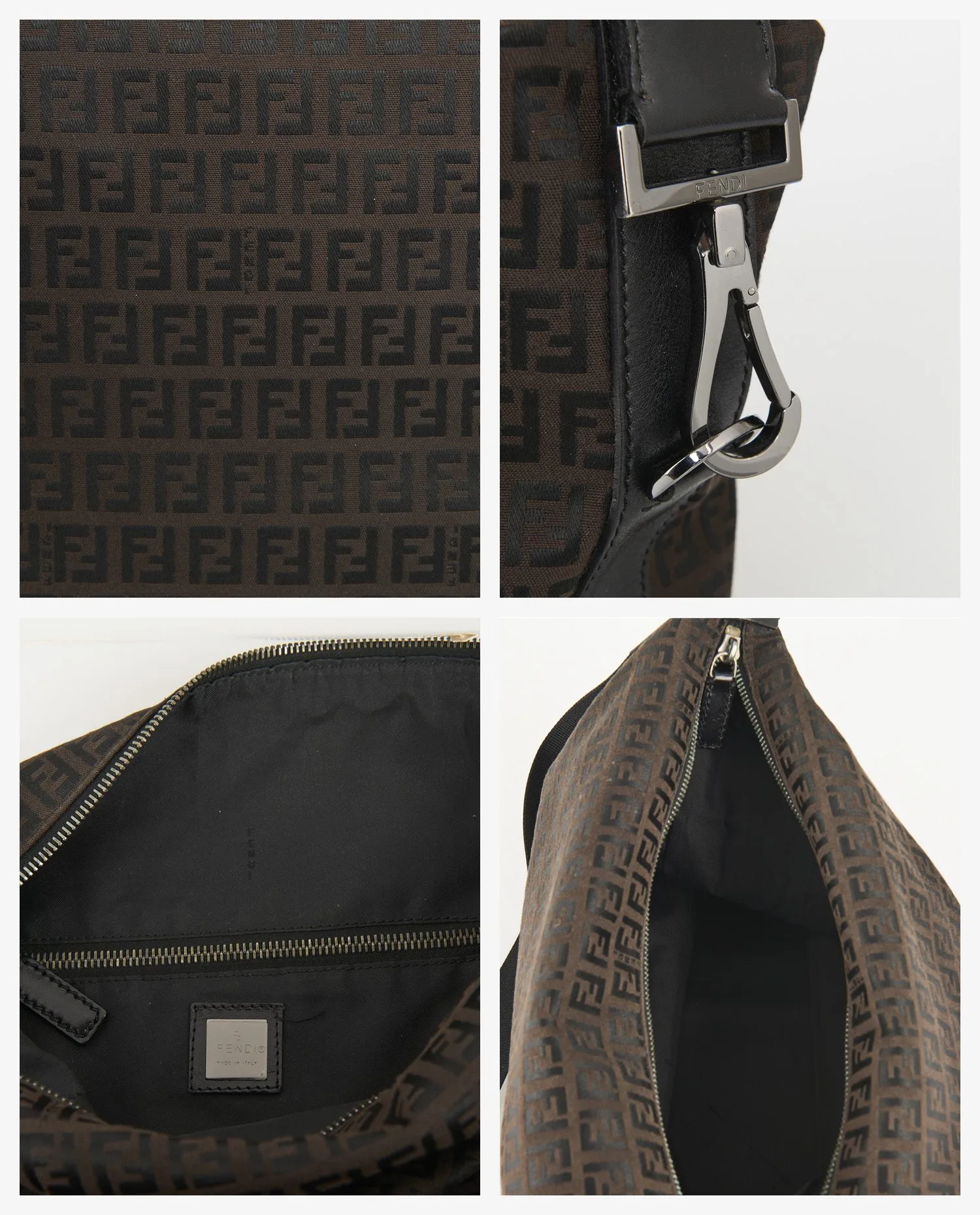 The interior is fully lined with black textile, clean and without noticeable wear. An interior zipped pocket allows for secure storage. There is a black leather label stamped “Fendi – Made in Italy” as well as the marking of the serial number. The main zipper works without snags.