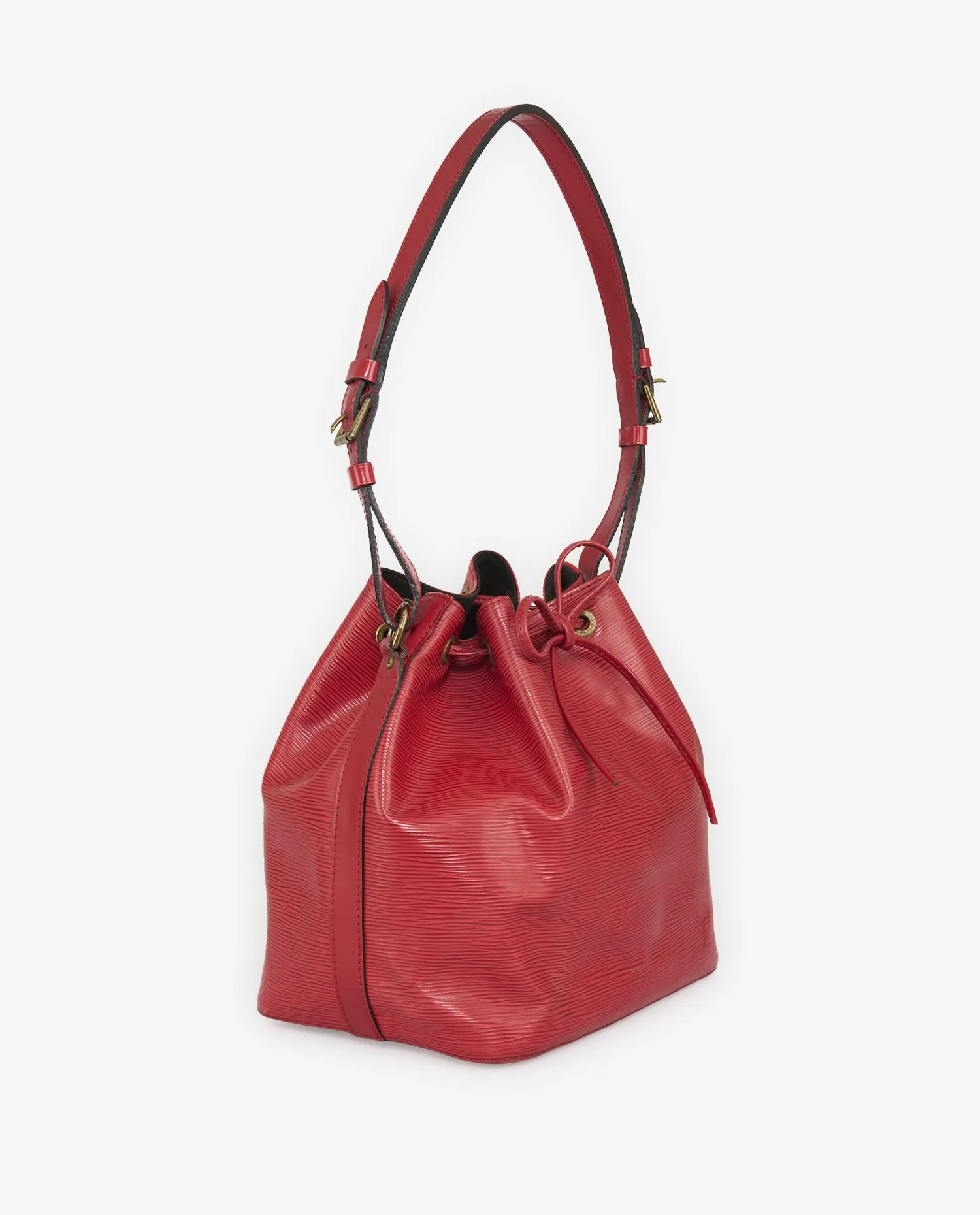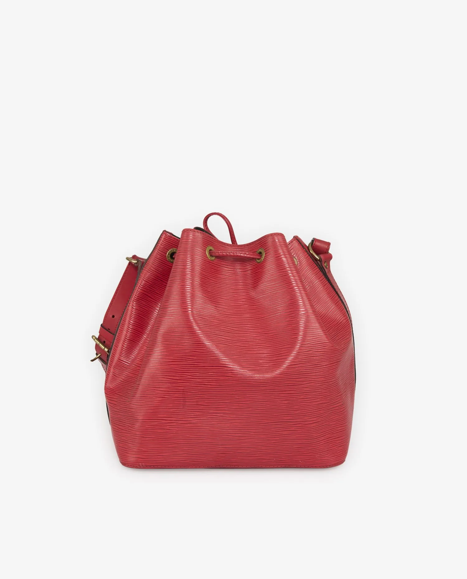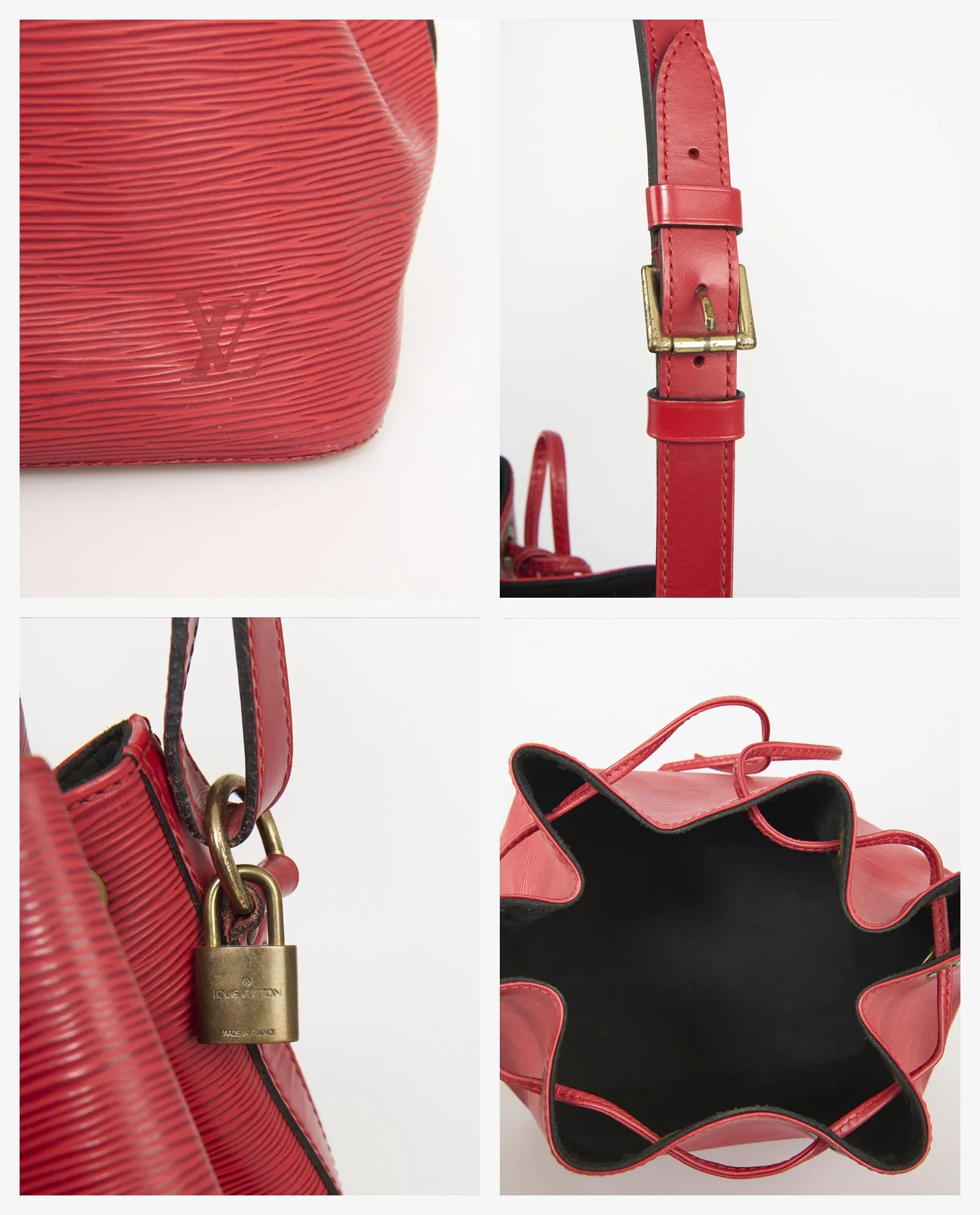 History of the Model: The “Noé” bucket bag was created in 1932 by Gaston-Louis Vuitton to carry bottles of champagne, becoming one of the house’s most versatile models. Its version in Epi leather, introduced in the 1980s, marks an aesthetic turning point by bringing color and texture to classic lines. This mass-dyed embossed leather is designed to resist time and use. The model presented here is part of this tradition, combining functionality and a strong visual identity, typical of vintage Louis Vuitton accessories. Exterior Details: The red Epi leather has a characteristic horizontal relief, both elegant and scratch-resistant. The bright color contrasts subtly with the golden metallic fittings with an old patina. The smooth leather shoulder strap is adjustable with a buckle, ensuring a personalized fit. The bag is closed with a matching leather drawstring. The “LV” logo is discreetly embossed in the lower corner, without ostentation. The brass padlock, engraved “Louis Vuitton Made in France”, completes the set with a utilitarian and emblematic touch. Interior Details: The interior is lined with black microfiber, providing a marked contrast to the red exterior. The absence of an internal compartment or pocket reflects the initial design of the Noé model, designed for generous volume and free use. The interior space allows you to carry everyday objects without constraint on shape, making it a bag suitable for regular use. Product Condition: This bag is in good vintage condition, with visible but moderate signs of use. The Epi leather retains its texture and color, although slight traces of rubbing are present in certain areas. The metal elements have a natural patina, particularly on the padlock and the buckle. The overall structure remains solid, and the drawstring functions normally. Maintenance Tips: To preserve Epi leather, it is recommended to clean it with a soft, slightly damp cloth, without aggressive products. Avoid prolonged exposure to direct sunlight to maintain color intensity. Storage must be done away from humidity and dust, ideally in a fabric cover. The leather of the shoulder strap can be occasionally nourished with a specific non-greasy treatment. Why Choose this Product: This Louis Vuitton bucket bag in red Epi leather embodies the alliance between historic design and durability, characteristics sought after in luxury vintage pieces. Its practical format, bold color and careful manufacturing make it a distinctive accessory, suitable for everyday use or for a collection. It represents an authentic and functional alternative to contemporary bags, while carrying the heritage of iconic know-how.