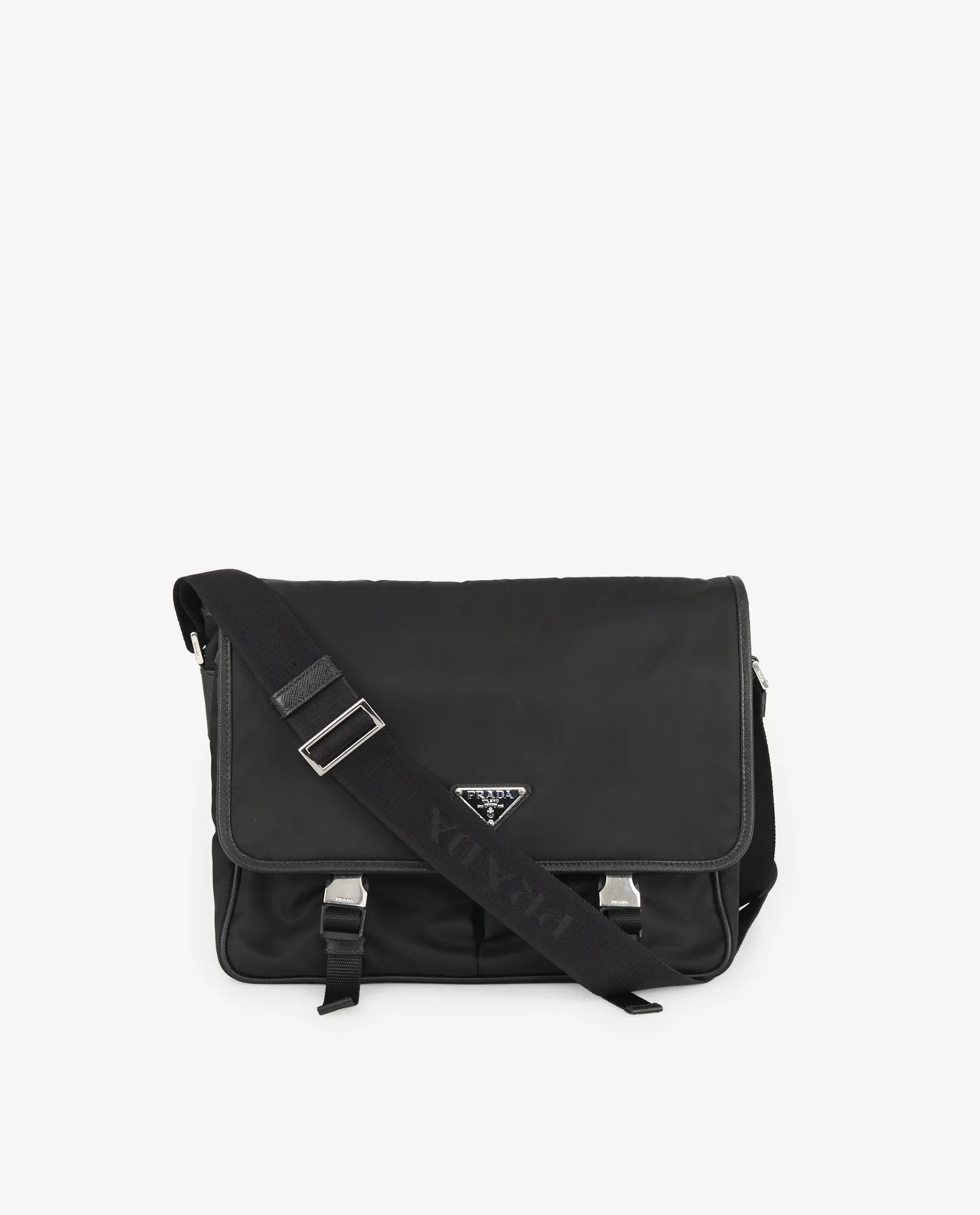 The body of the bag is made of black Re-Nylon with a matte finish, subtly contrasted by Saffiano leather inserts on the edges, sides and finishes. The flap is closed with two rectangular metal buckles engraved with “Prada”, providing an elegant industrial touch. On the back, a large patch pocket provides quick access to essentials. The wide and sturdy Re-Nylon shoulder strap is fully adjustable for cross-body or shoulder carry.