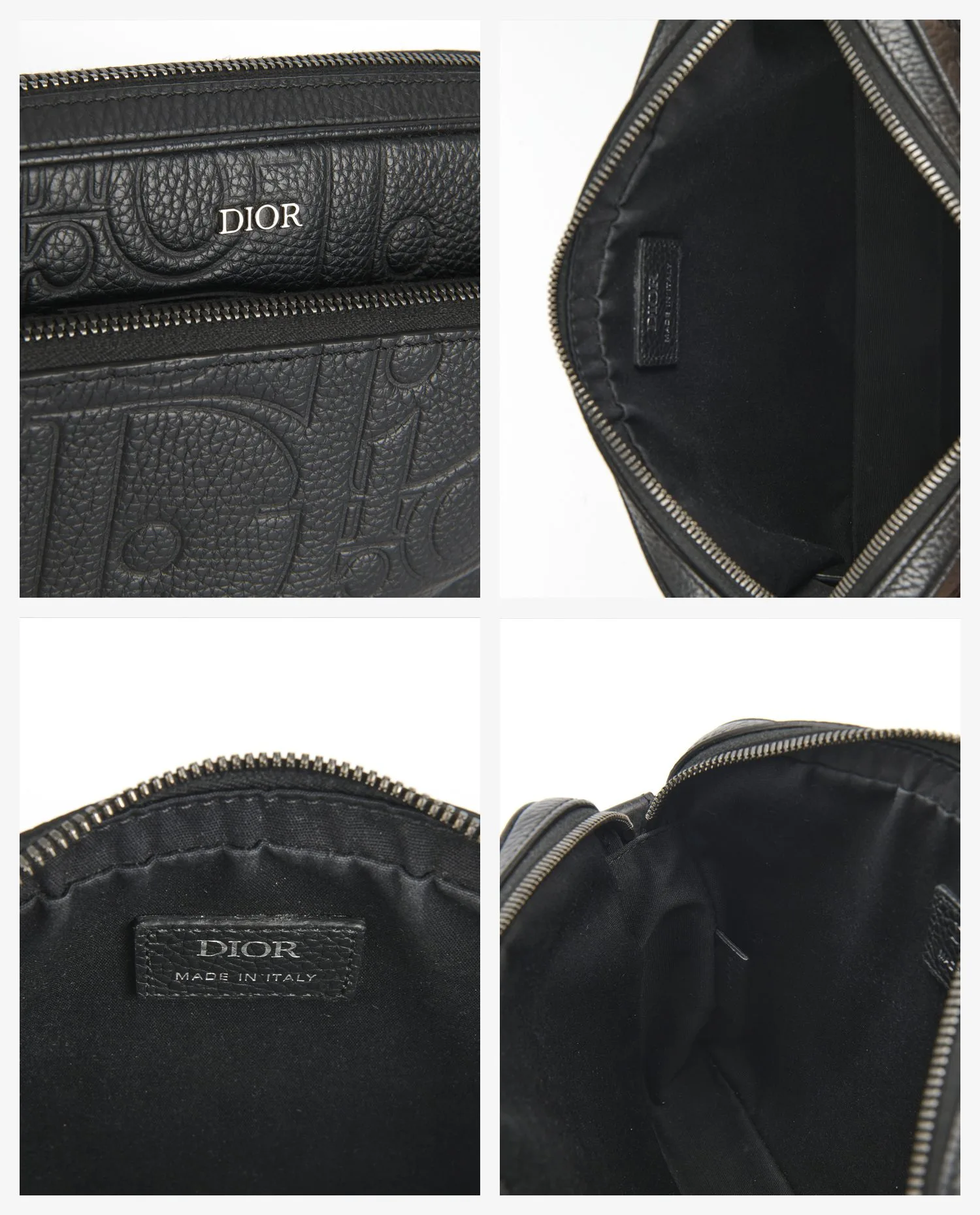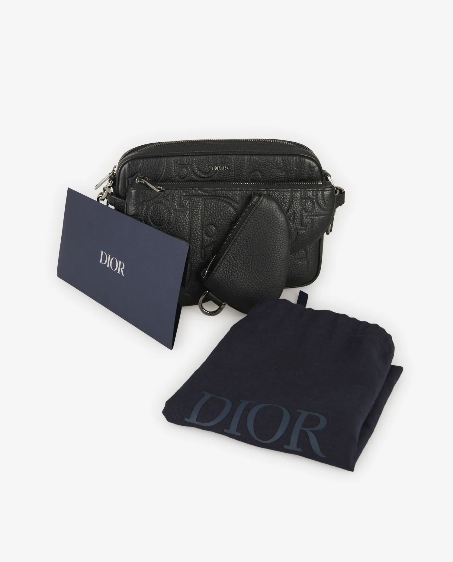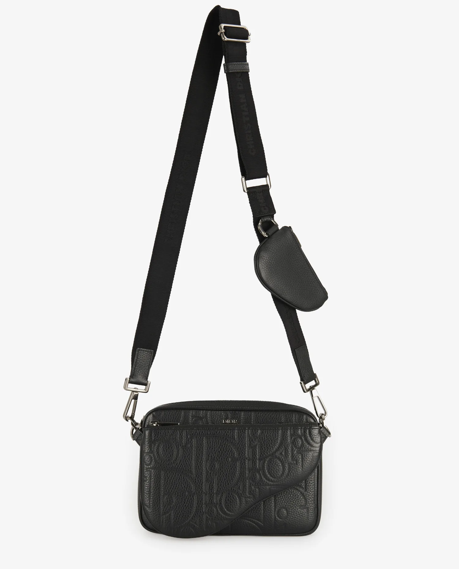 Black grained leather provides a robust, elegant texture, resistant to everyday wear and tear. The Dior monogram is embossed in tone-on-tone relief on the two larger pouches, reinforcing the visual identity of the piece. Metallic finishes in silver palladium provide a discreet yet refined contrast. All three pouches feature sturdy zippers, and metal rings allow them to be modulated at will on the shoulder strap.