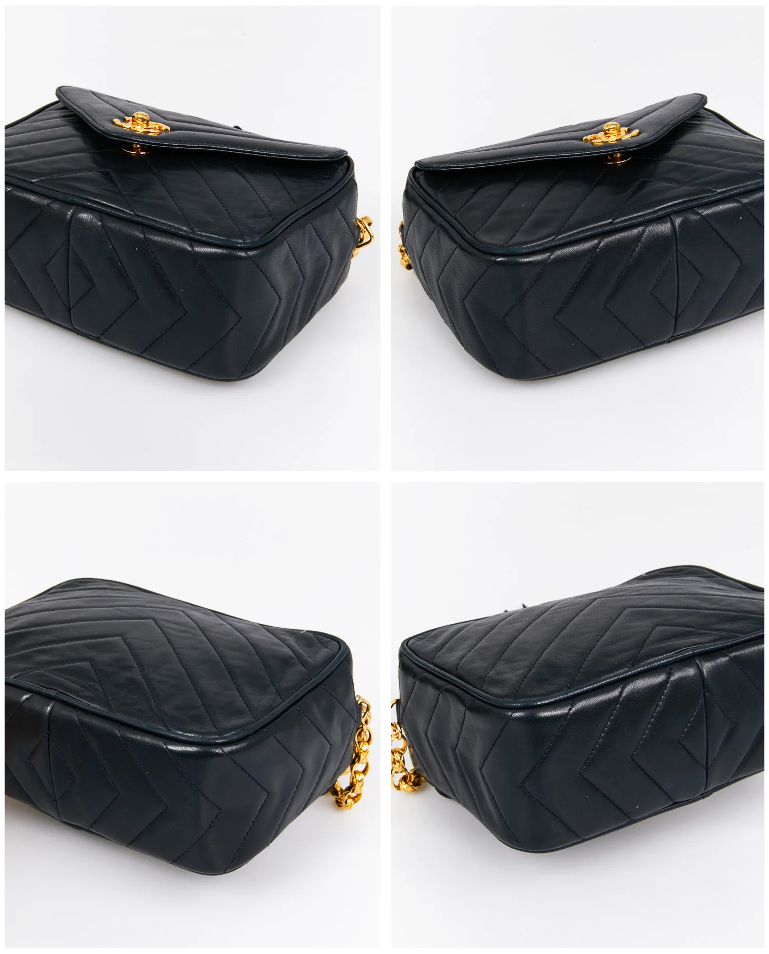 The camera bag is an iconic Chanel creation inspired by the bags used by photographers, combining aesthetics and functionality. Popularized in the ’80s and ’90s under the direction of Karl Lagerfeld, this model has established itself as a women’s wardrobe essential for its modern, practical allure. The navy blue herringbone leather, combined with the 24-carat gold-plated jewelry characteristic of the ’90s, gives this model a strong identity sought after by fans of the house’s vintage pieces.
