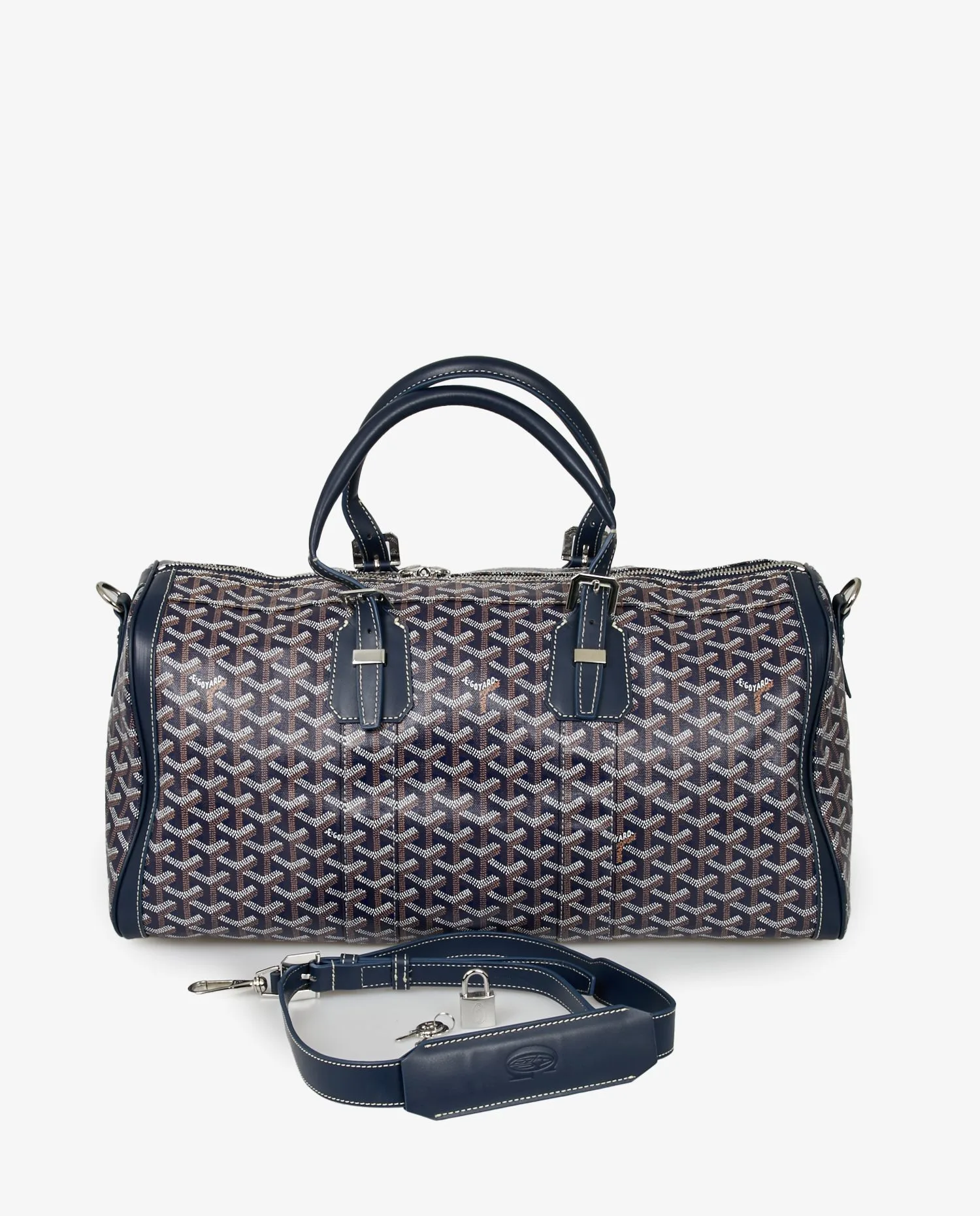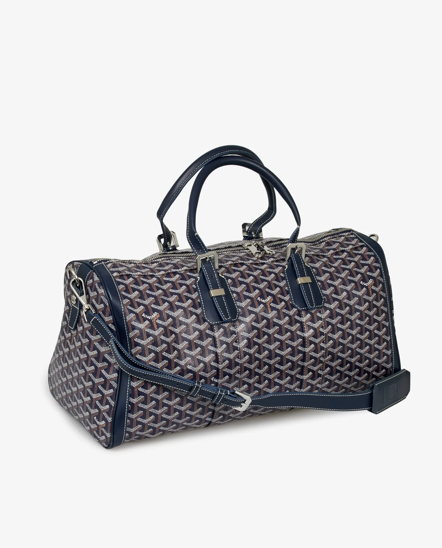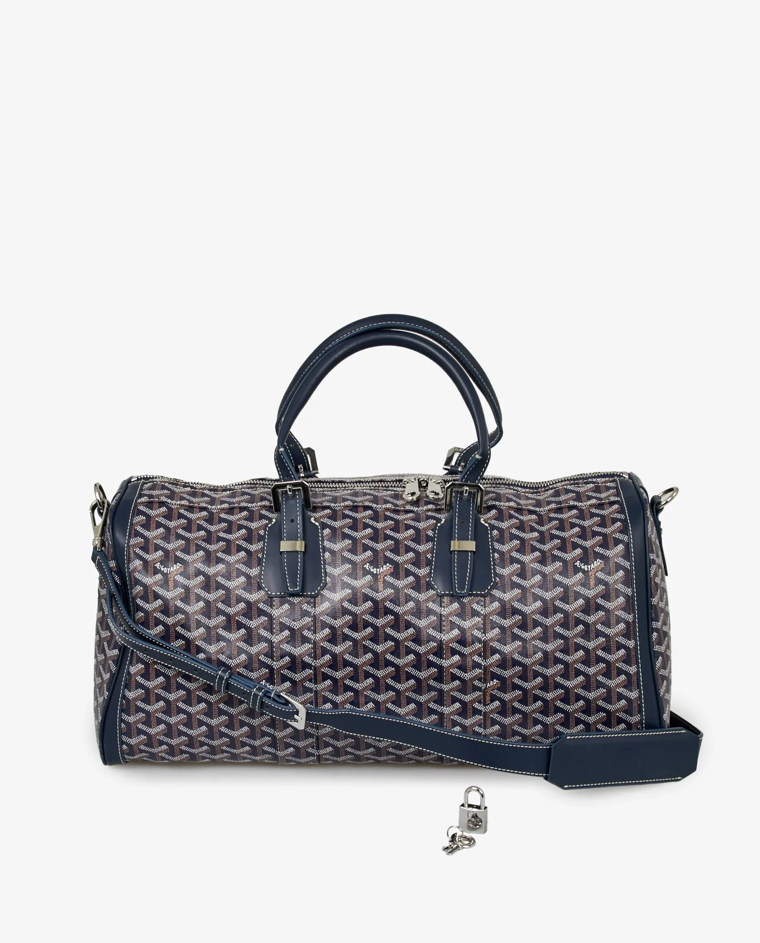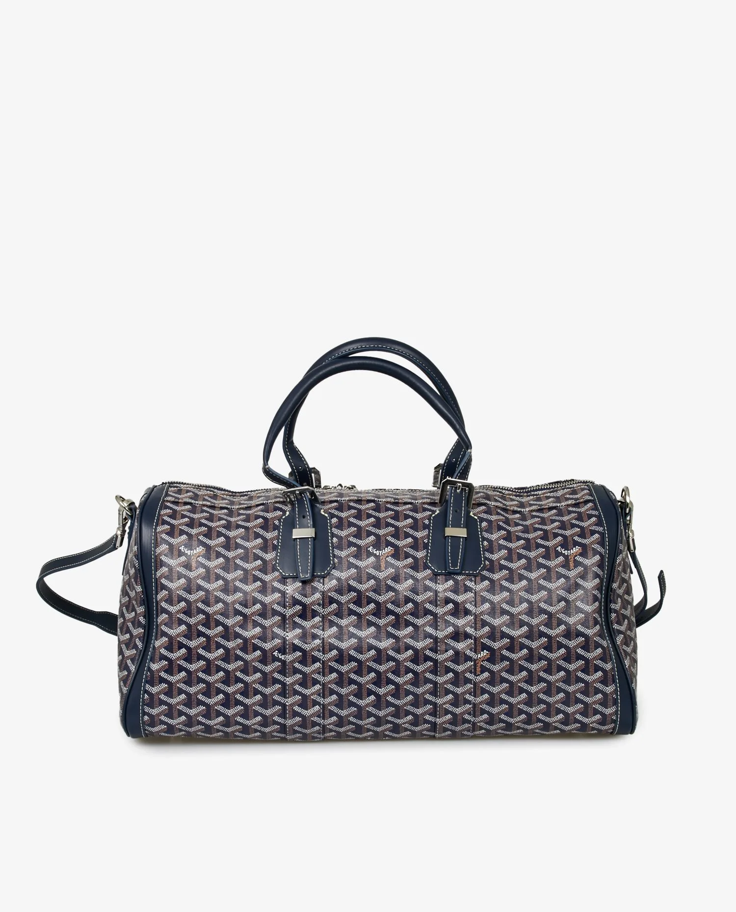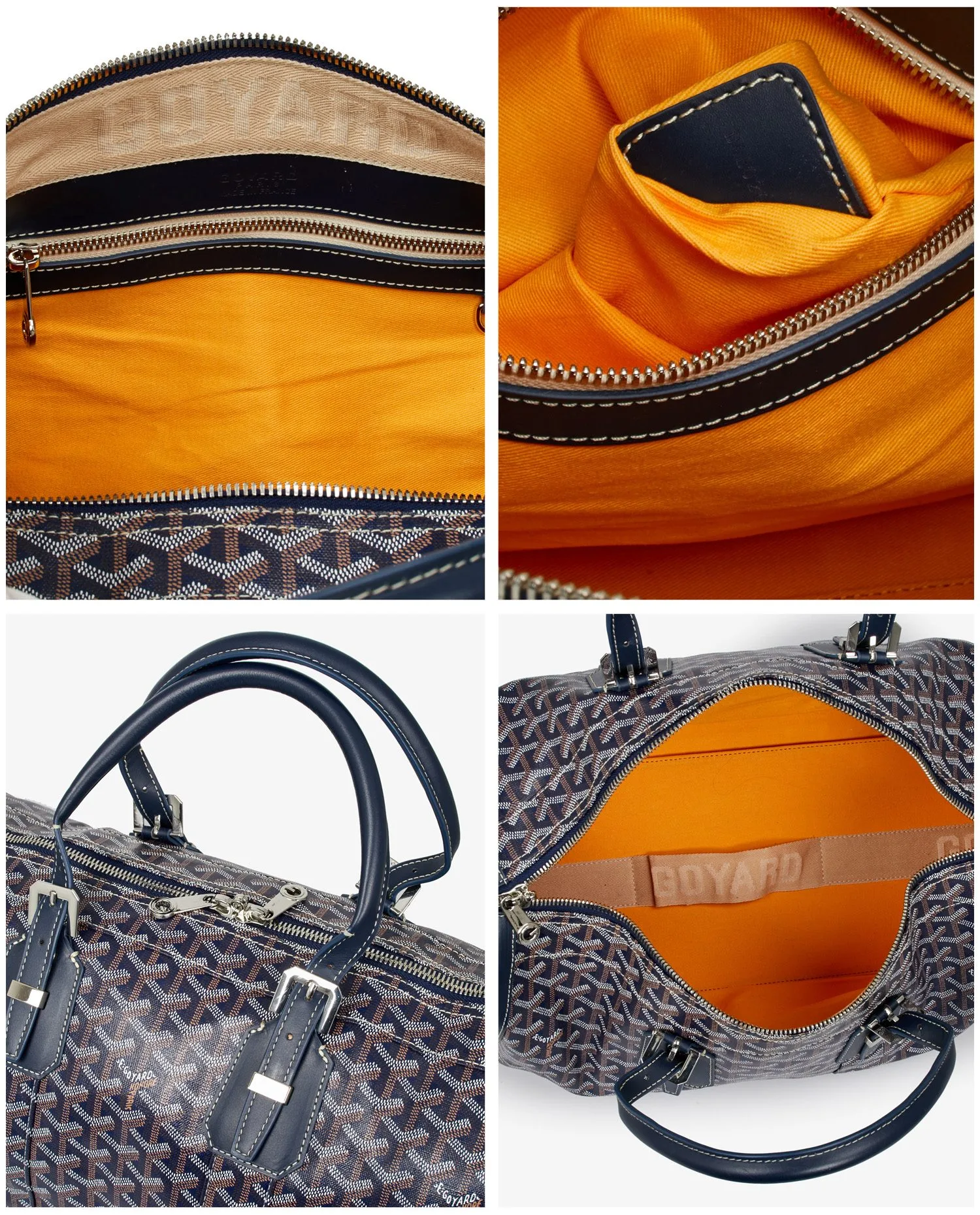 Goyard Boston 45 travel bag in blue canvas. Palladium jewelry. Zipper closure. Carried by hand or on the shoulder/crossbody with an adjustable or removable shoulder strap. The interior is in yellow fabric, emblematic of the Maison Goyard. In very good condition. Public price 3345 euros.