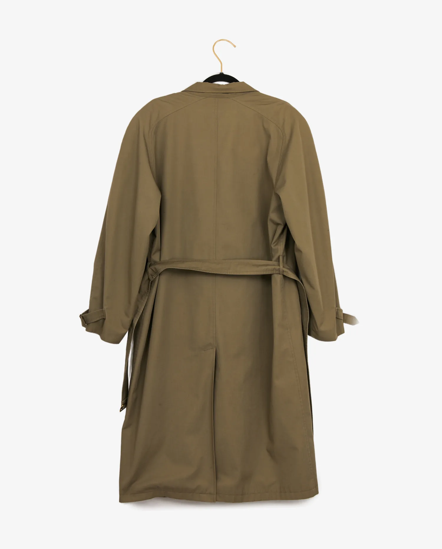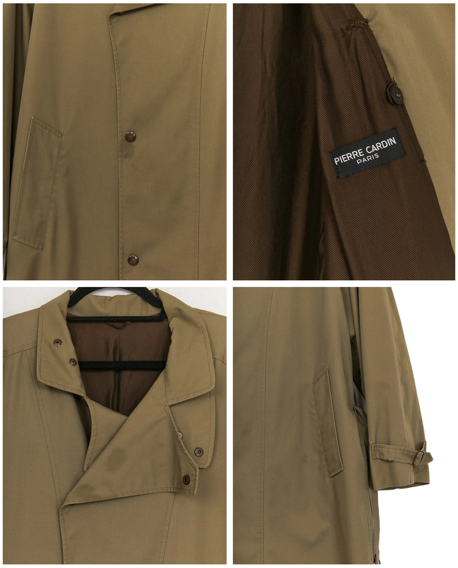 Vintage Pierre Cardin khaki trench coat. Mao collar fastened with press studs. Epaulettes. It has a belt to mark the waist. Size 54. In very good condition.