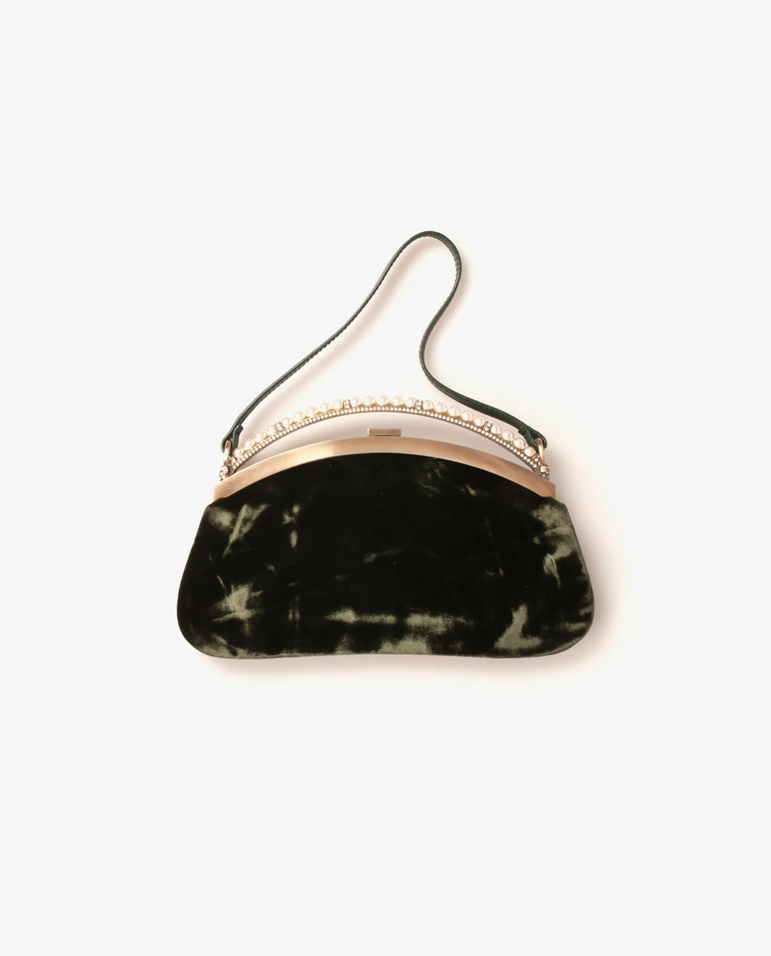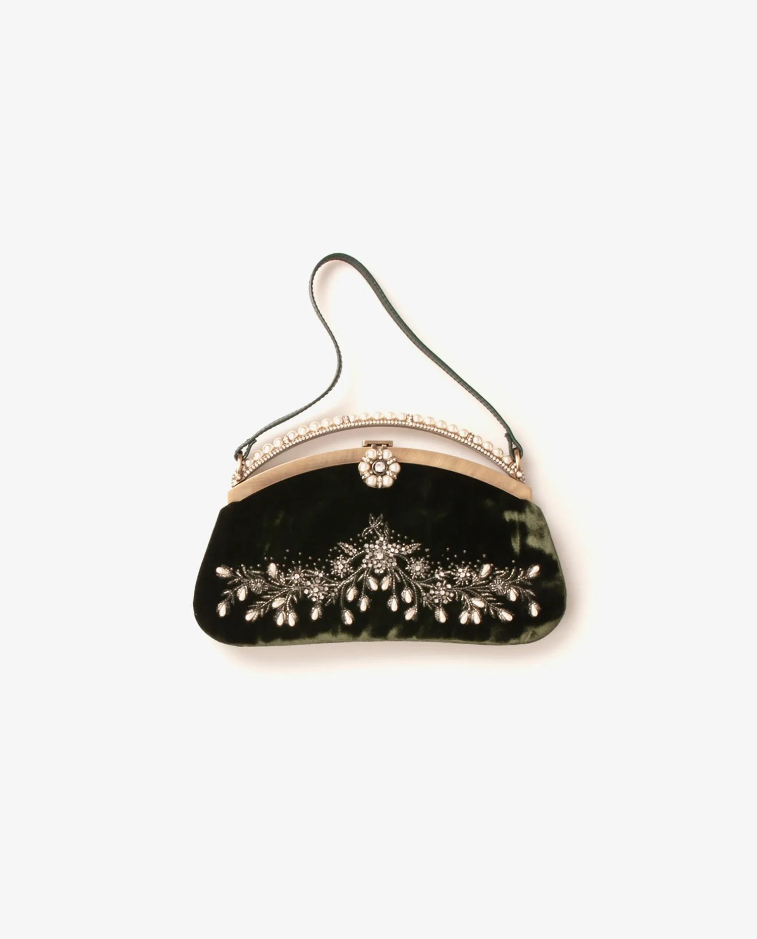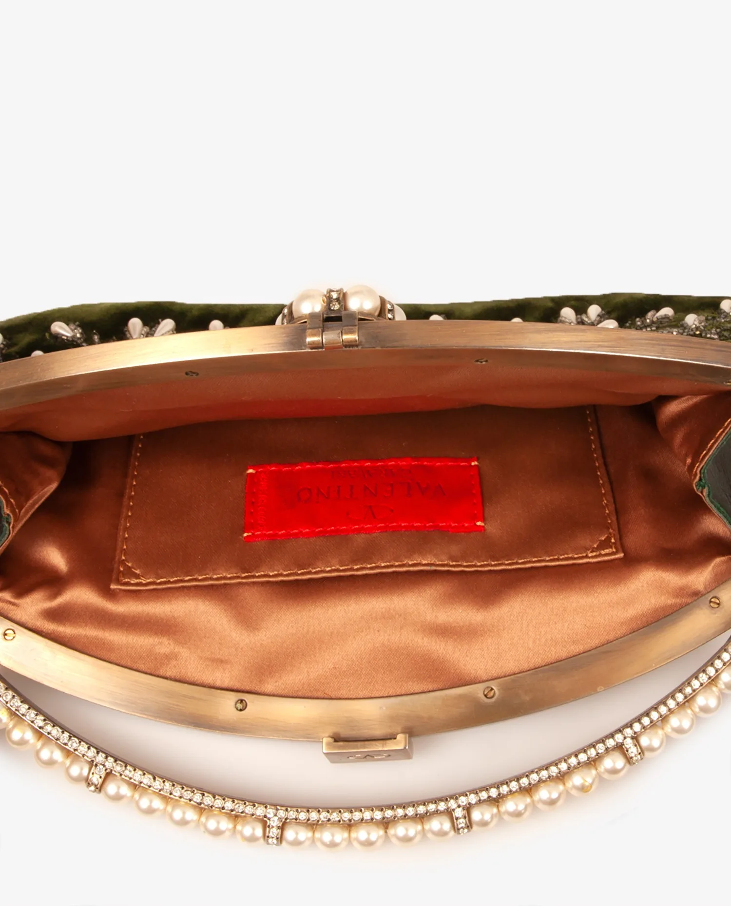 Valentino evening bag in green suede calfskin. It is embroidered with pearls and rhinestones. The interior is in brown satin with a patch pocket. It’s in very good condition, just a small snag on one of the beads.