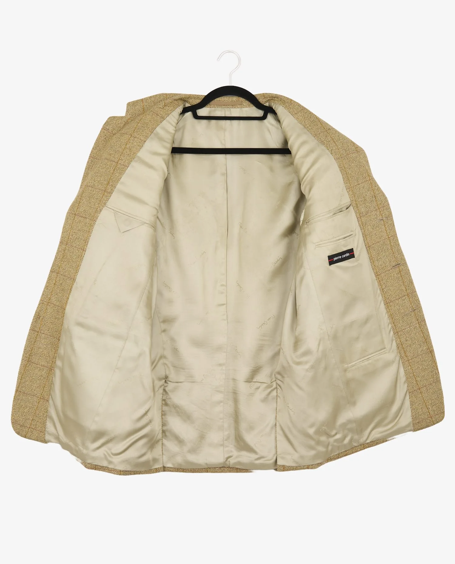 The jacket is fully lined with beige satin printed “Pierre Cardin”. It has several functional interior pockets, including one buttoned. The composition label indicates size 48 and the material is 100% wool. As with many vintage pieces from the 80s and 90s, the words “Made in” are not present, which was common at the time. The typology of the labels and the general quality suggest European production under license, in accordance with the industrial standards of this period.