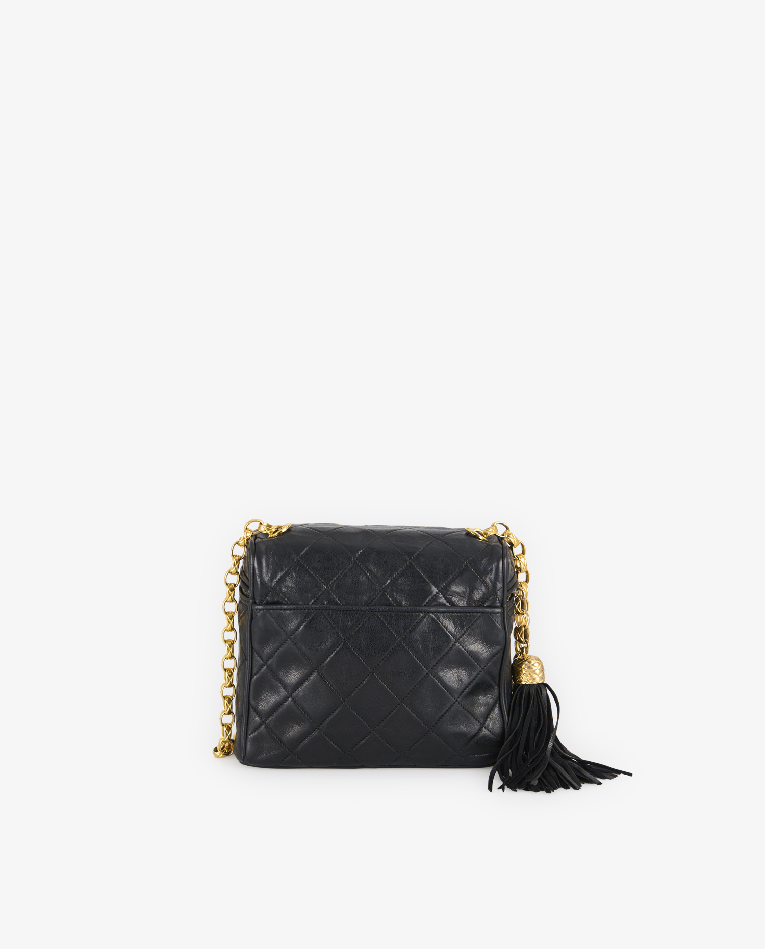 Black lambskin leather features a smooth, supple finish with perfectly aligned diamond quilting. The leather pompom attached to the zip is finished with a textured gold patch stamped with the CC logo, adding an iconic decorative touch. The gold chain shoulder strap, without interwoven leather, lends a sleeker, more luxurious look. The bottom corners are reinforced and slightly rounded for added strength. Approximate dimensions are 17.5 cm wide, 14.5 cm high and 7 cm deep.
