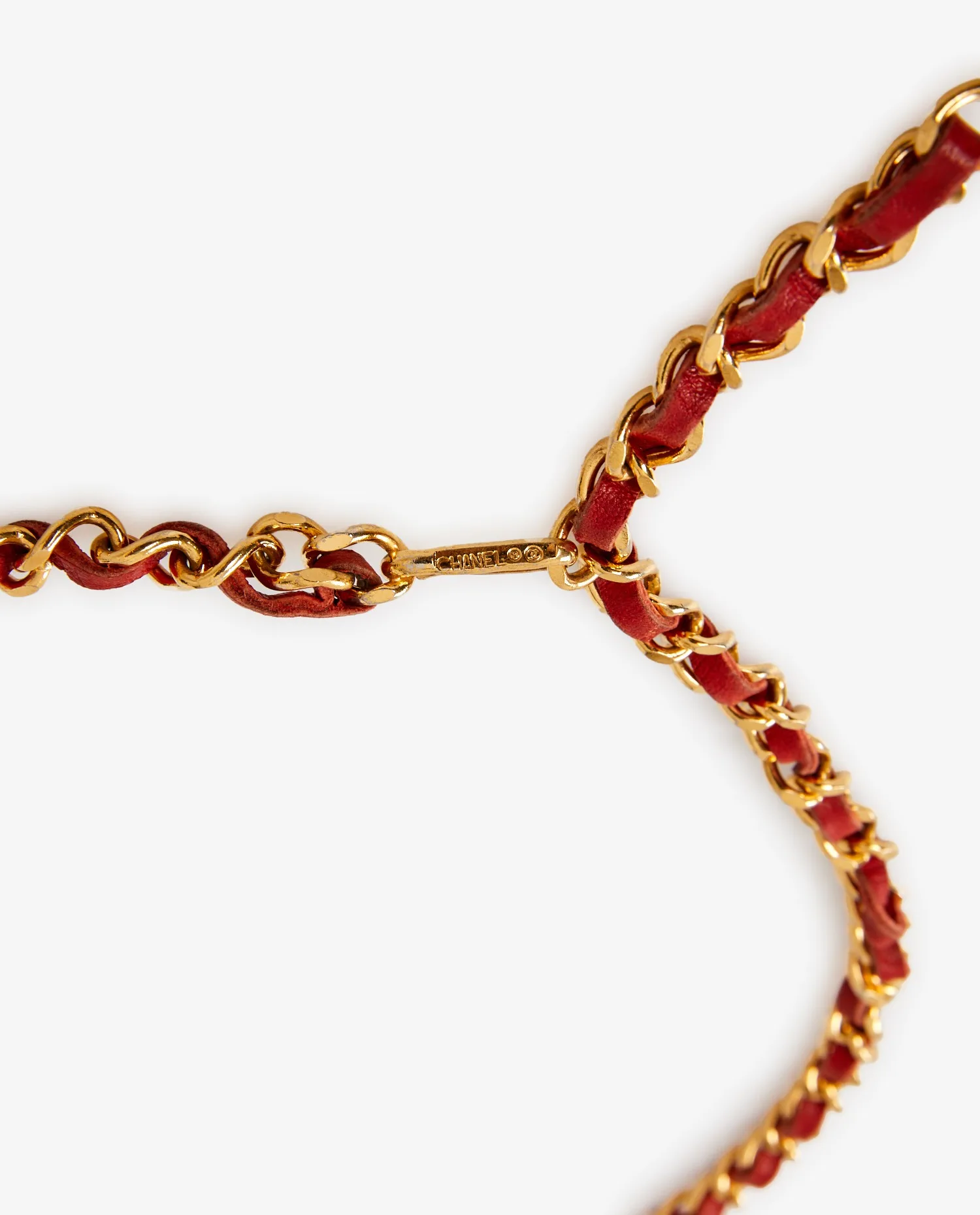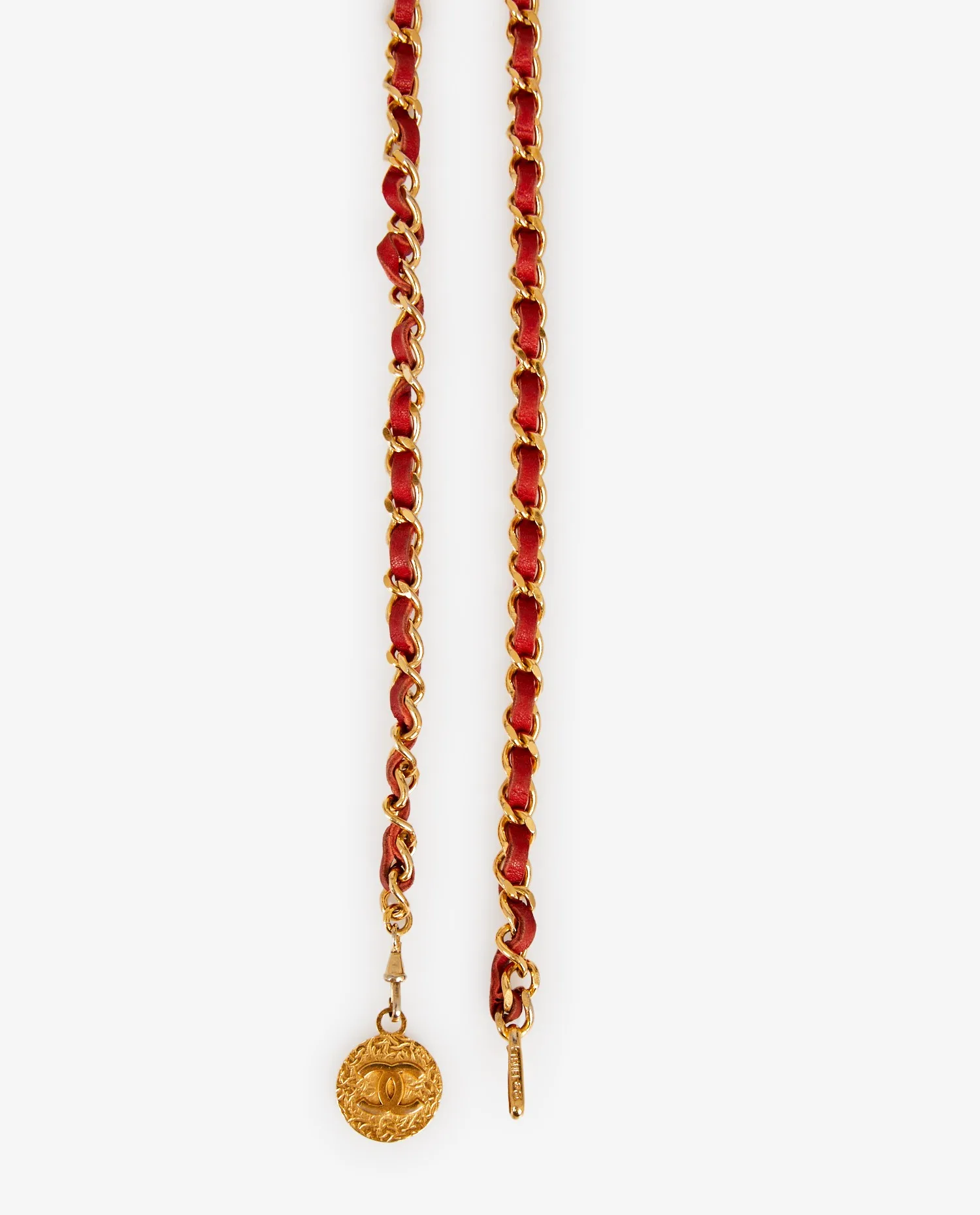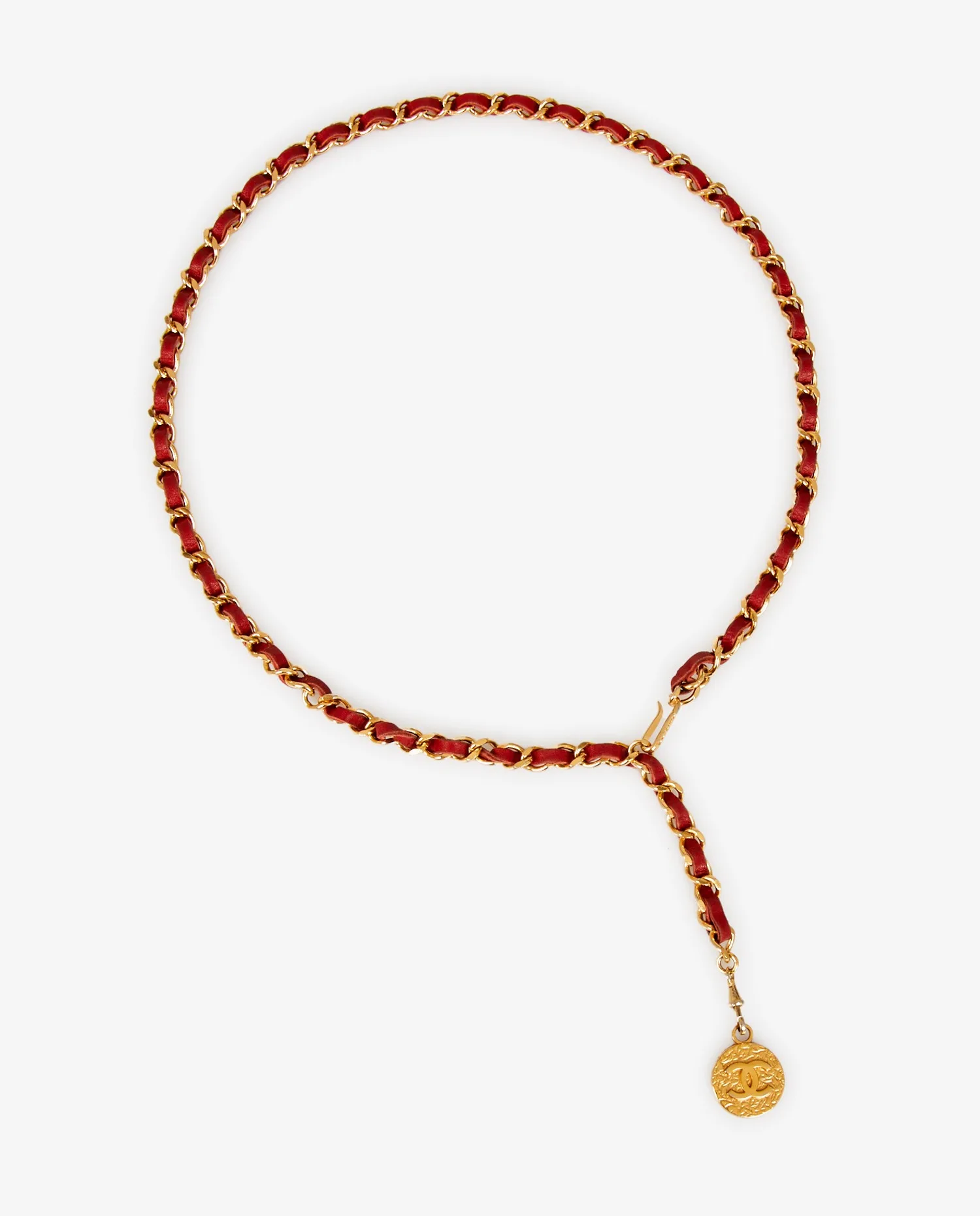 Vintage Chanel red leather and chain belt. In very good condition.