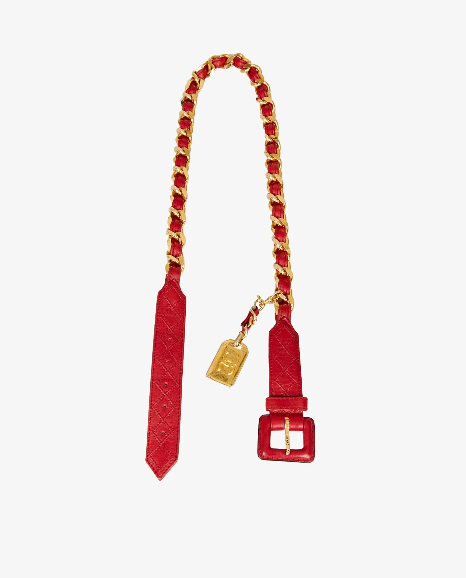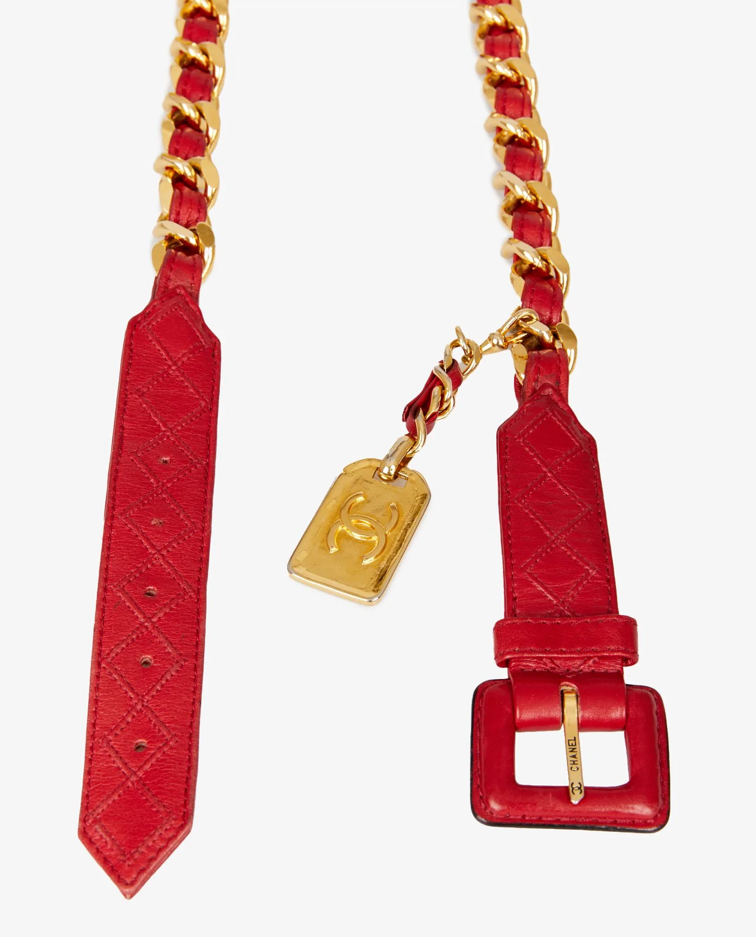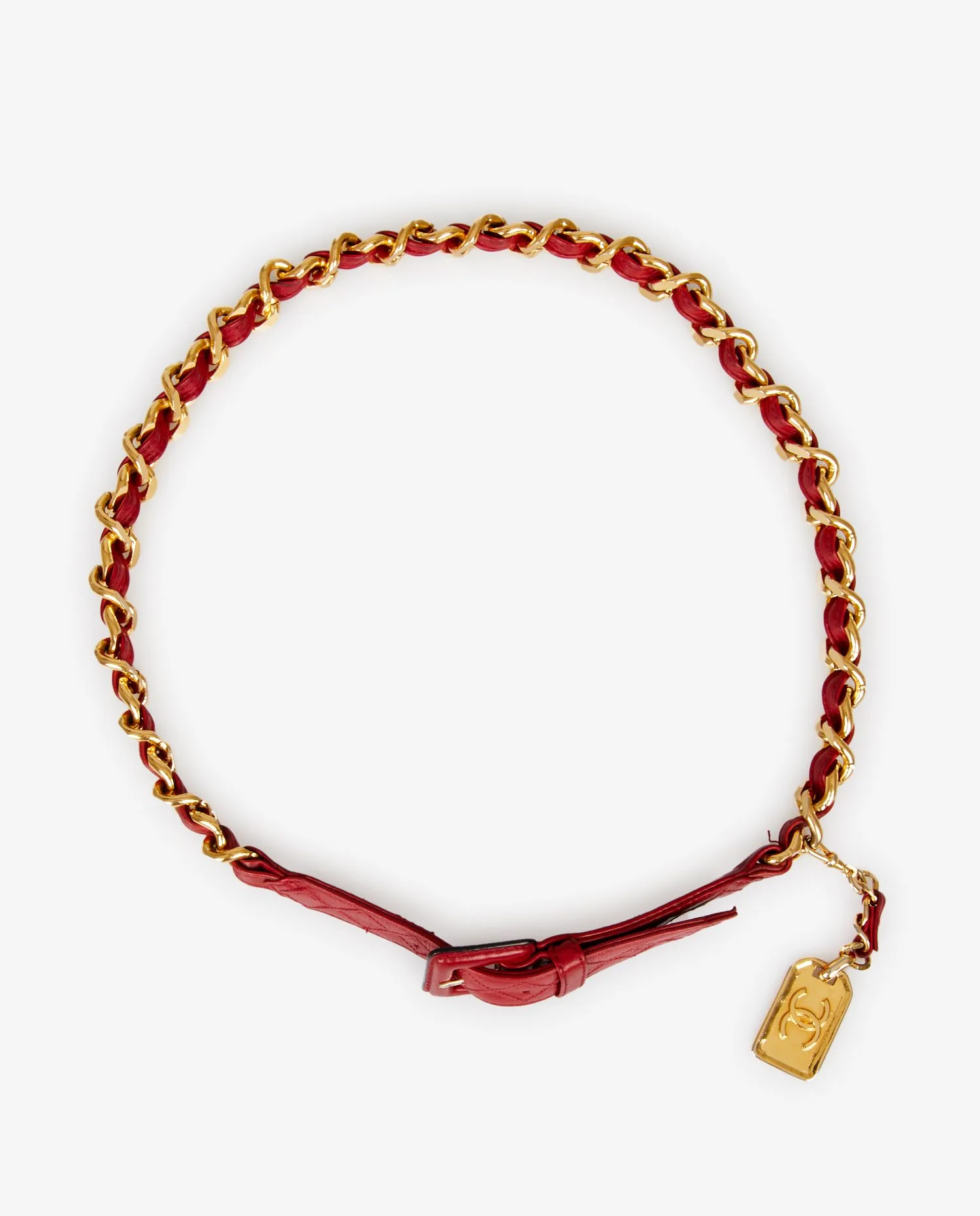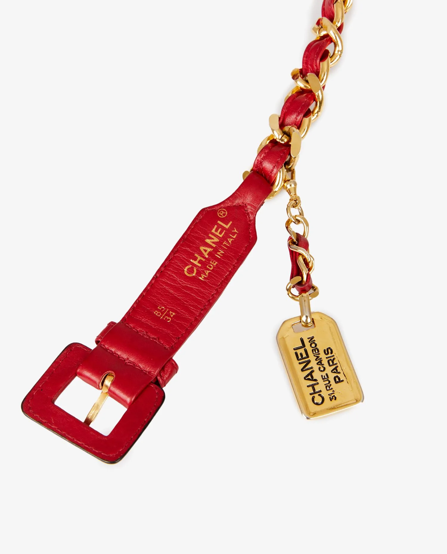 Vintage Chanel red leather and chain belt. Size 85. In very good condition.