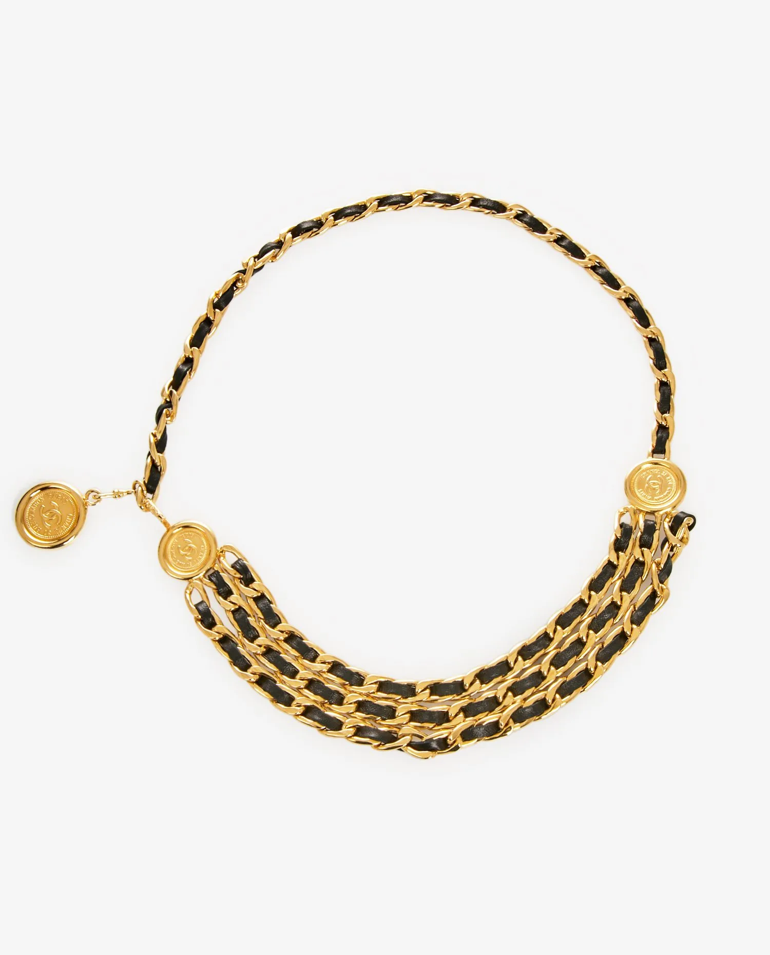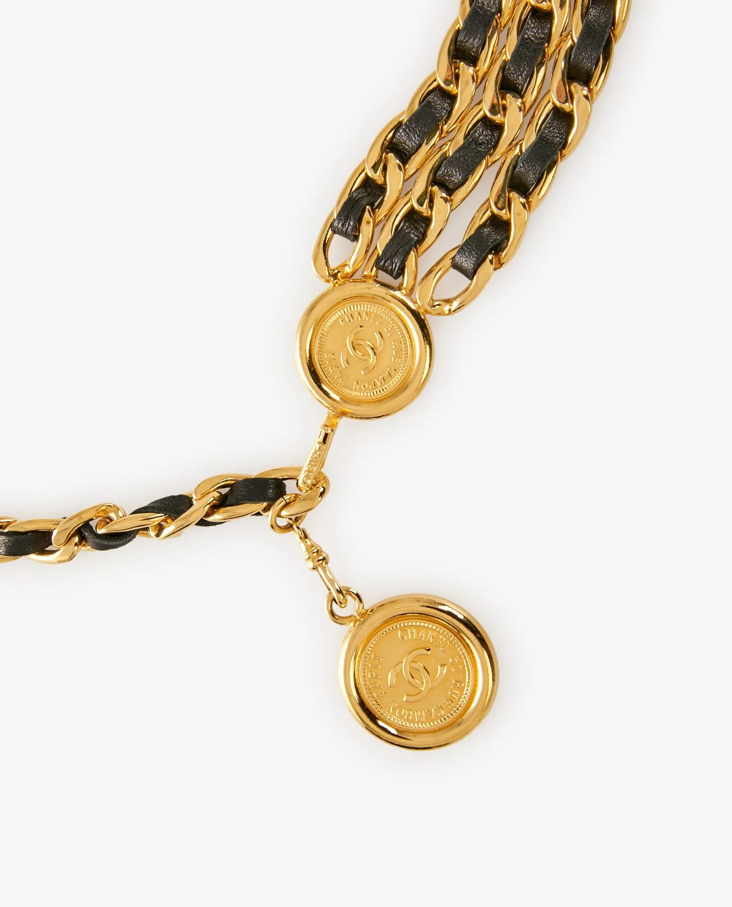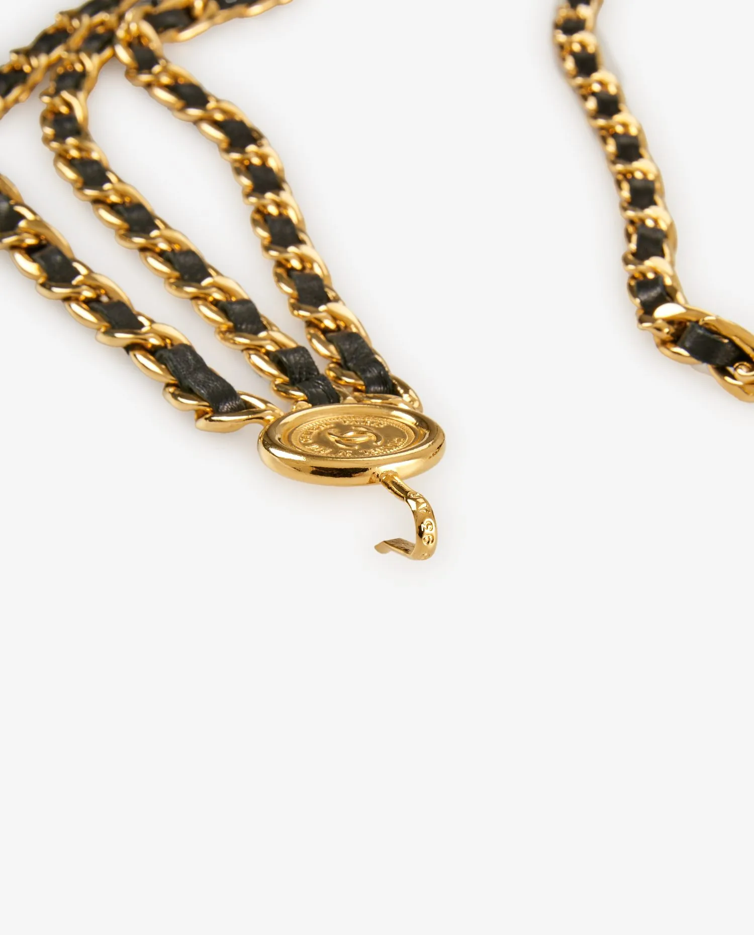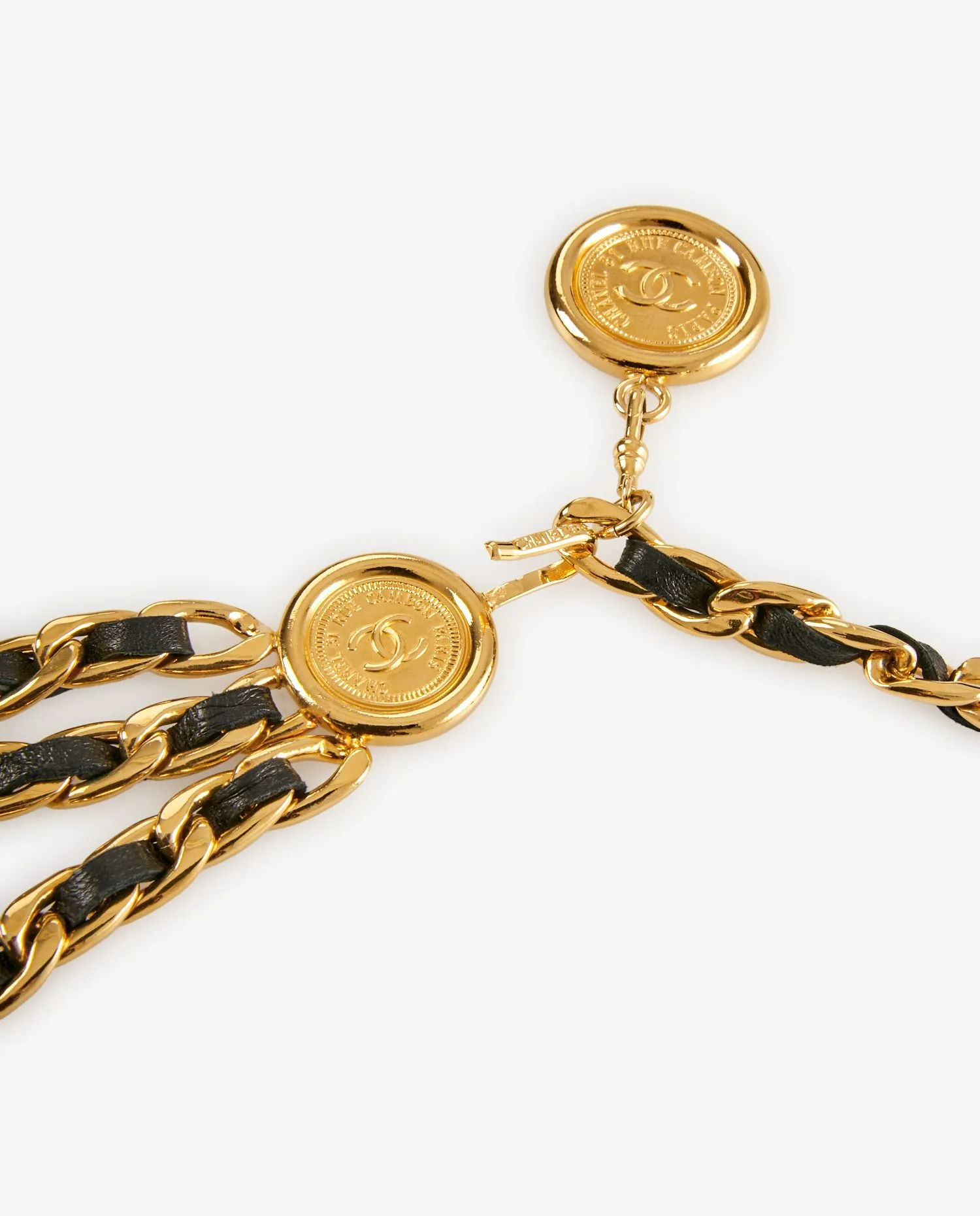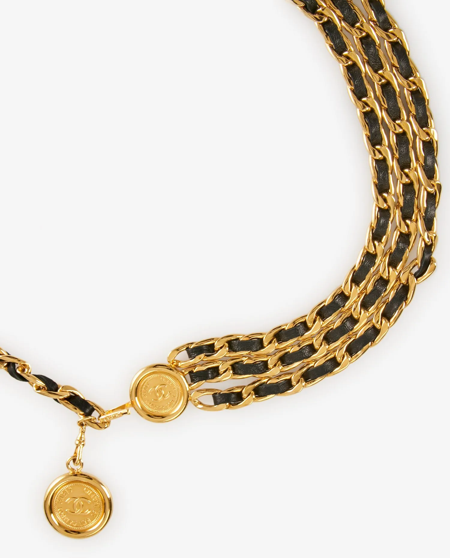 Vintage Chanel triple-row belt in gold chain interwoven with black lambskin leather. Fall 1995 collection, the stamp is visible on the hook. In very good condition.