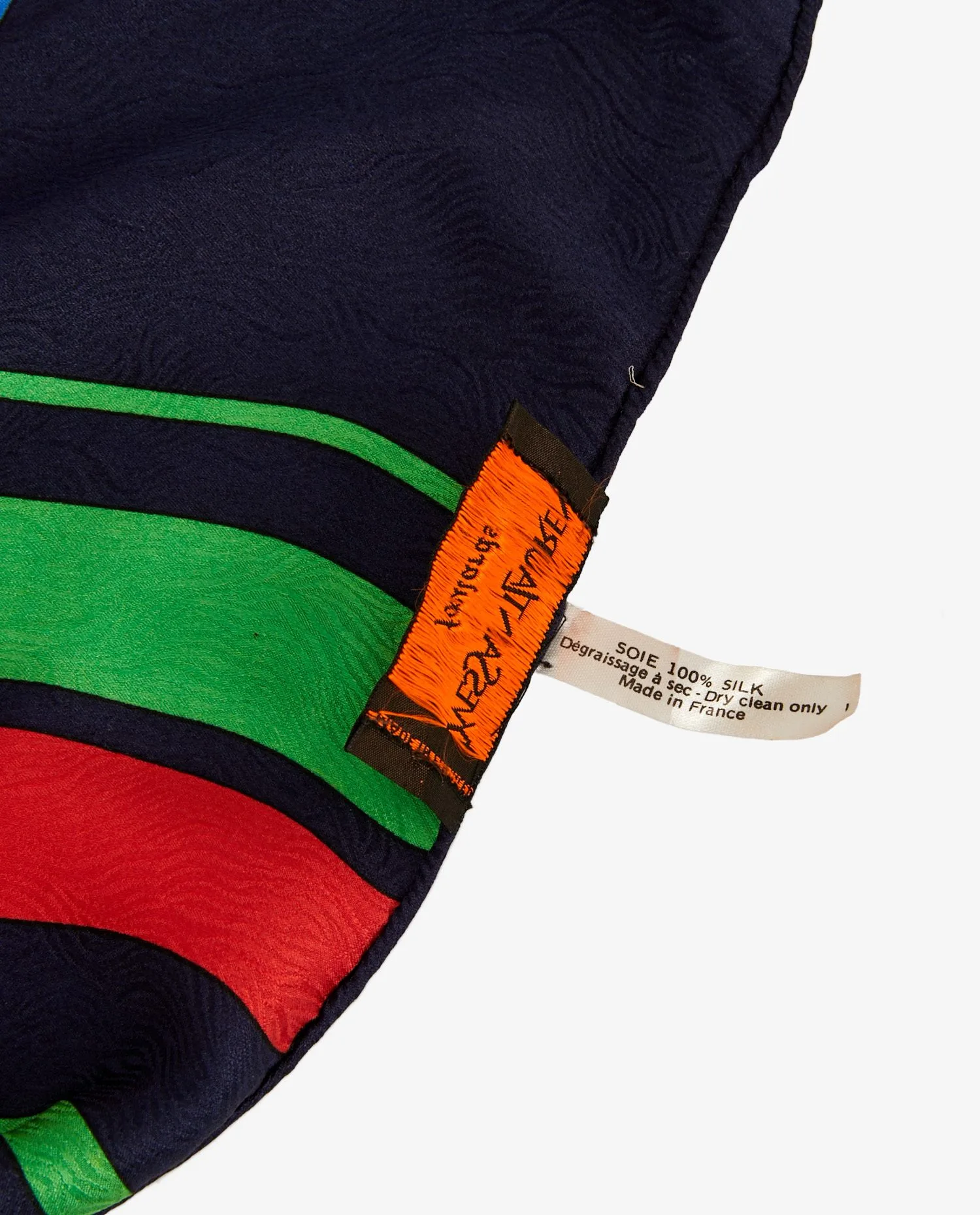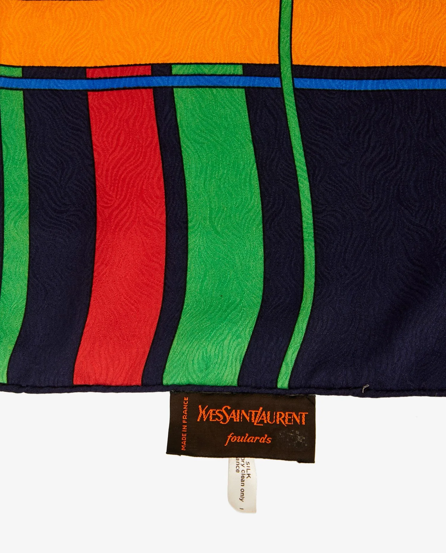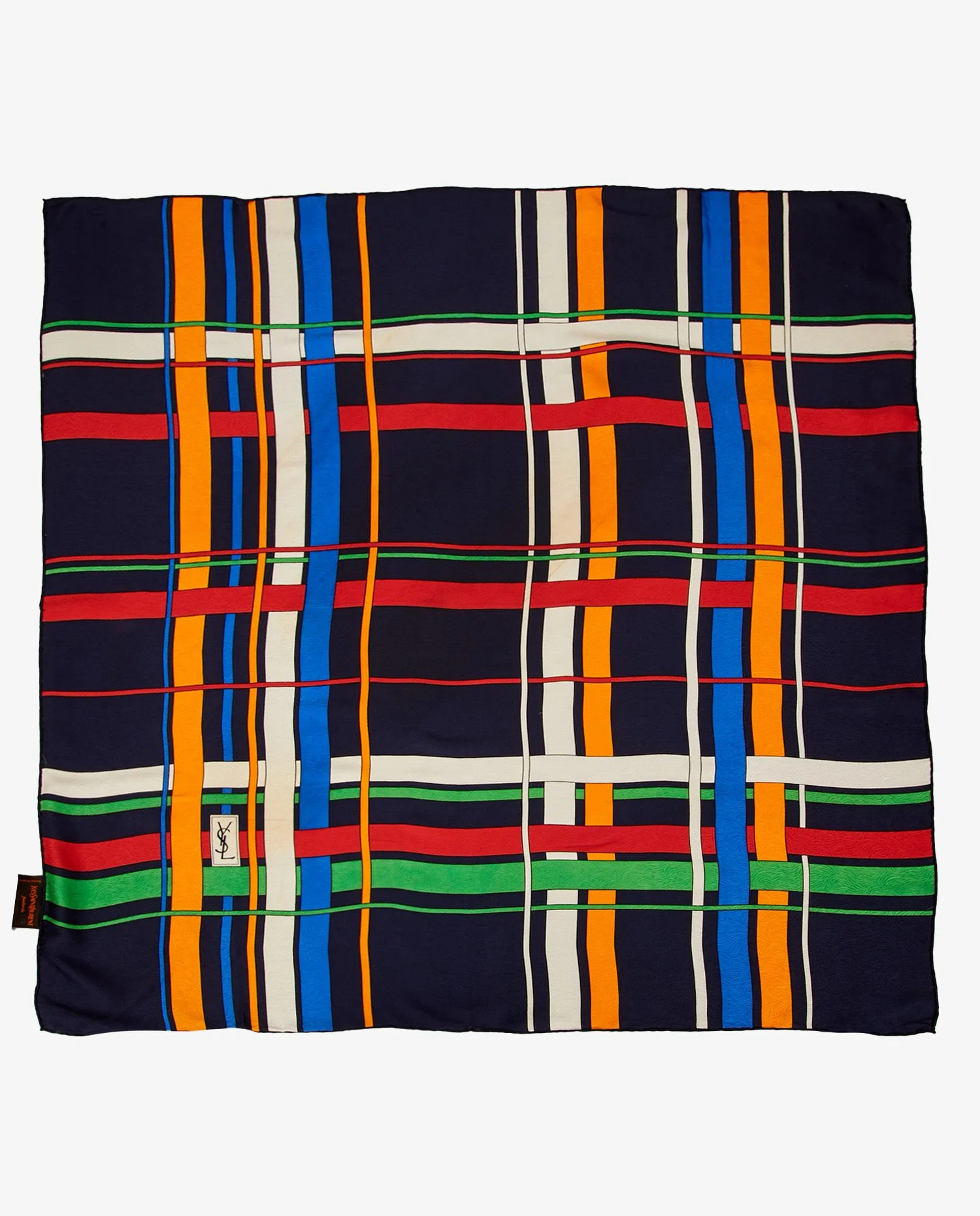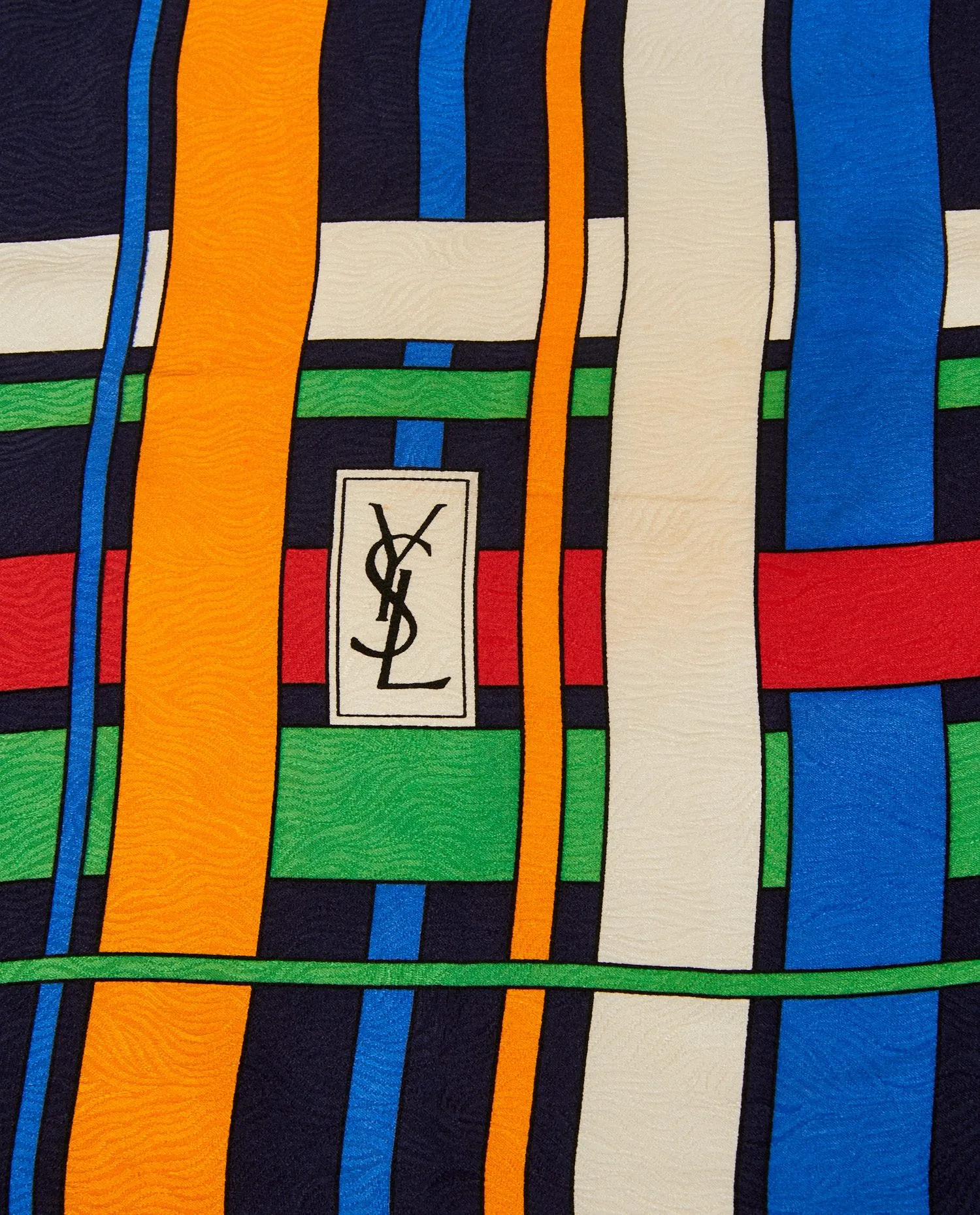 The scarf has a strong visual structure, alternating wide vertical and horizontal stripes in an almost architectural arrangement. The deep navy blue background emphasizes the primary and secondary hues, giving the whole a controlled balance. The woven label “Yves Saint Laurent Foulards – Made in France” is affixed to one corner. Dimensions are generous, around 90 x 90 cm, allowing for ample wear.The material is a silk with an embossed texture, bringing visual depth to the motif. The weave creates a subtle relief effect, reinforcing the fabric’s luxurious look. The hand-rolled finish testifies to the expertise of YSL’s ateliers at the time.