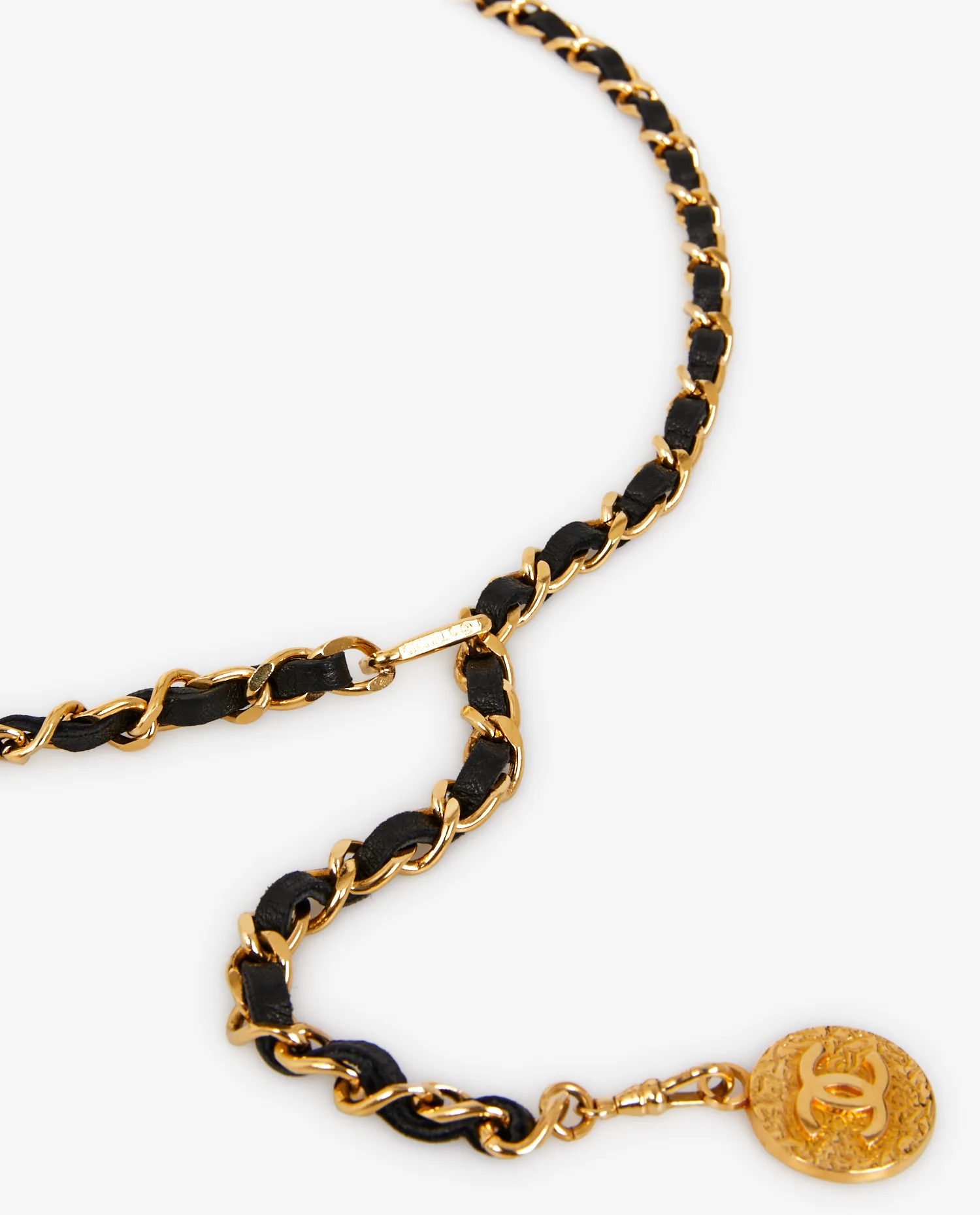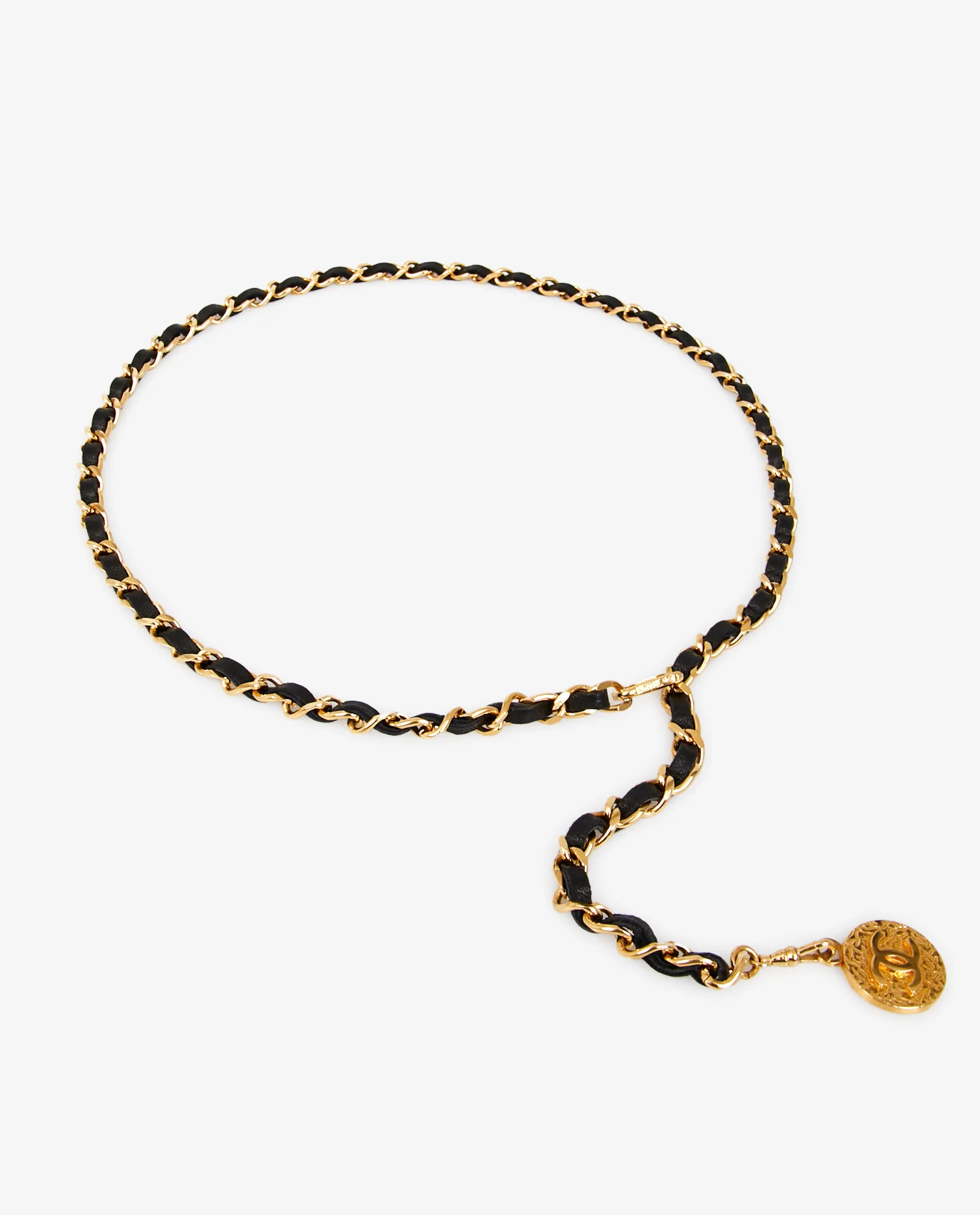 La chaîne est constituée de maillons dorés à l’or fin, robustes mais élégamment torsadés, qui accueillent une lanière de cuir noir souple et lisse, glissée à la main à travers chaque maillon. Le contraste entre la brillance du métal et la profondeur du cuir crée un jeu visuel raffiné, emblématique de l’esthétique Chanel. Le pendentif rond doré, gravé de la double signature de la maison, ajoute une touche finale d’authenticité. Grâce à sa structure modulaire, la ceinture peut être ajustée selon la morphologie et portée de multiples façons : en taille haute, en taille basse, ou même en sautoir improvisé.
