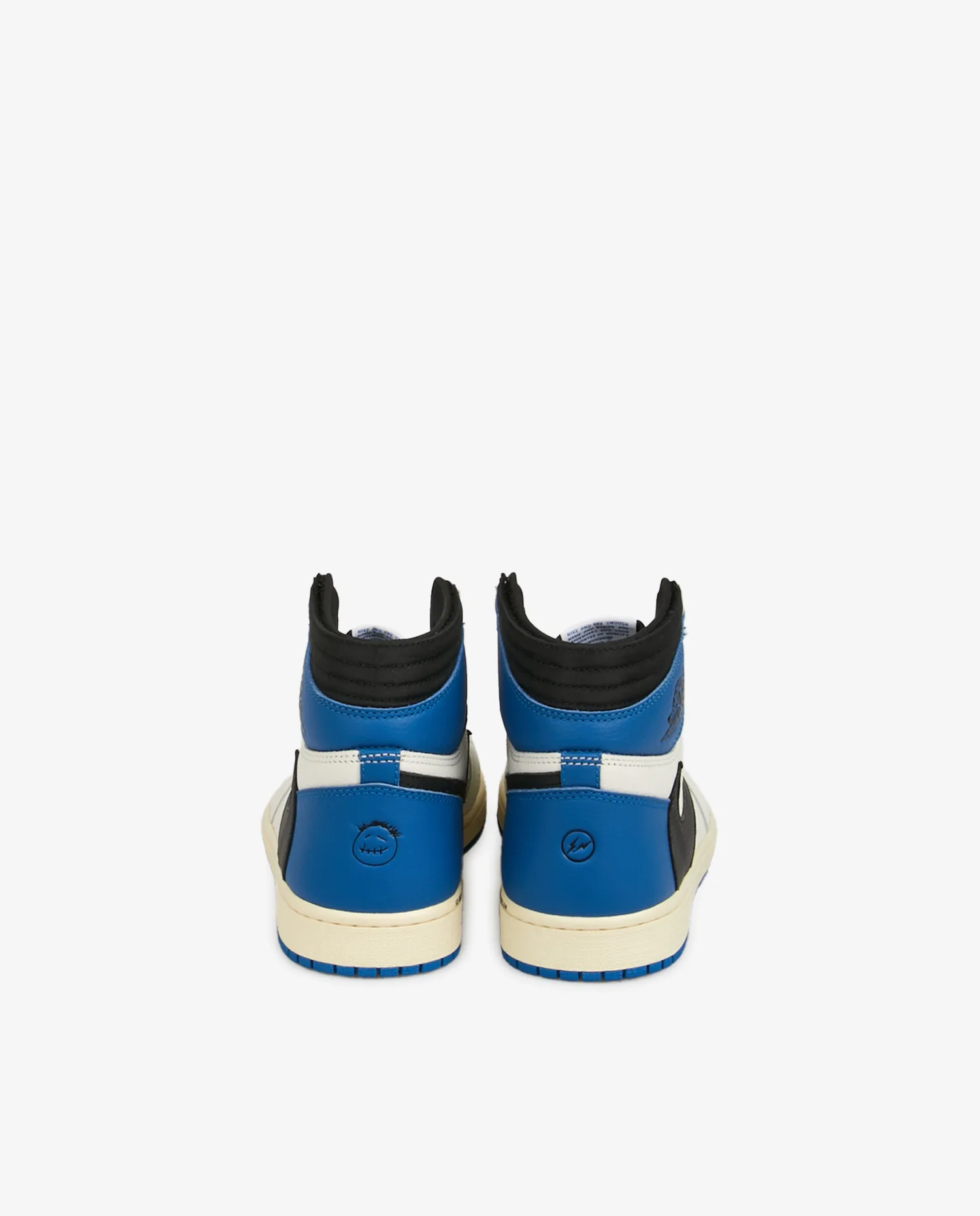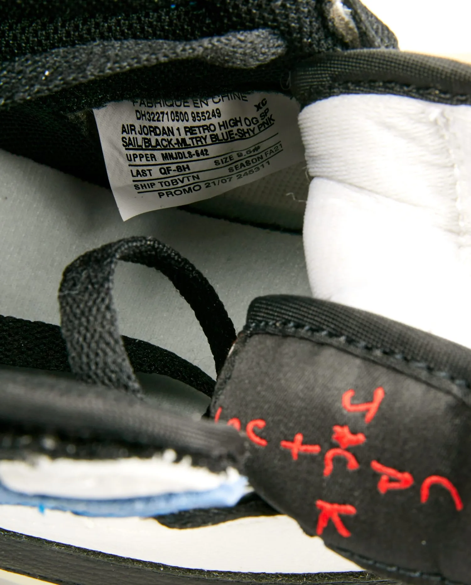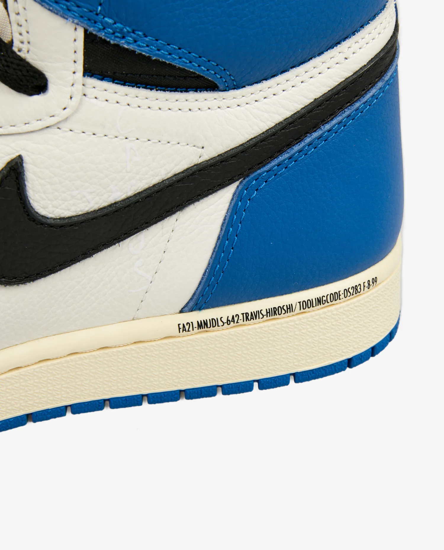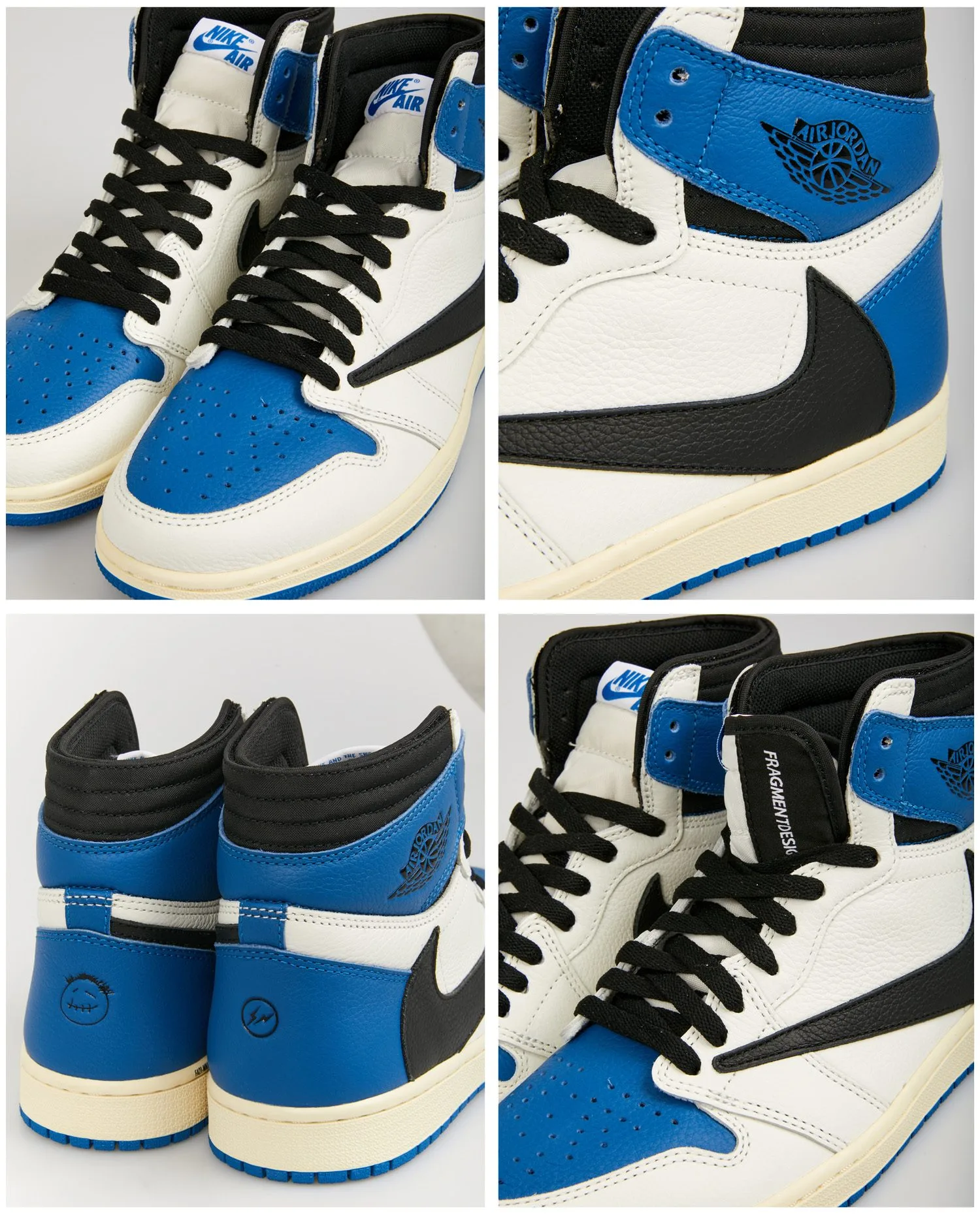 Doté d’une empeigne en cuir foulonné blanc et bleu, la Air Jordan 1 OG SP Fragment Design x Travis scott s’inspire d’une Jordan 1 Royal sortie en 1985. Comme sur les précédents modèles Jordan 1 Travis Scott, les poches secrètes au niveau du col et les swoosh à l’envers emblématiques viennent parachever ce modèle classique. Les logos Cactus Jack de Travis Scott et Fragment sont gravés en noir au niveau du talon. Une midsole vieillie confère à cette paire une esthétique vintage.