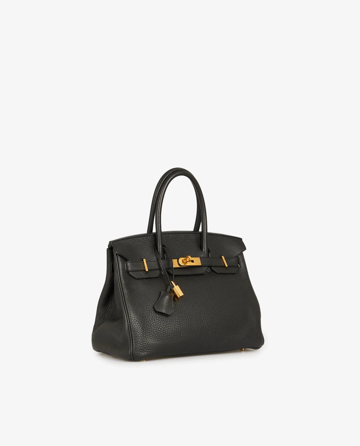 Birkin 30 Hermès cuir taurillon clémence noir. Bijouterie dorée. Tirette, clochette, cadenas et clefs. En très bon état.
