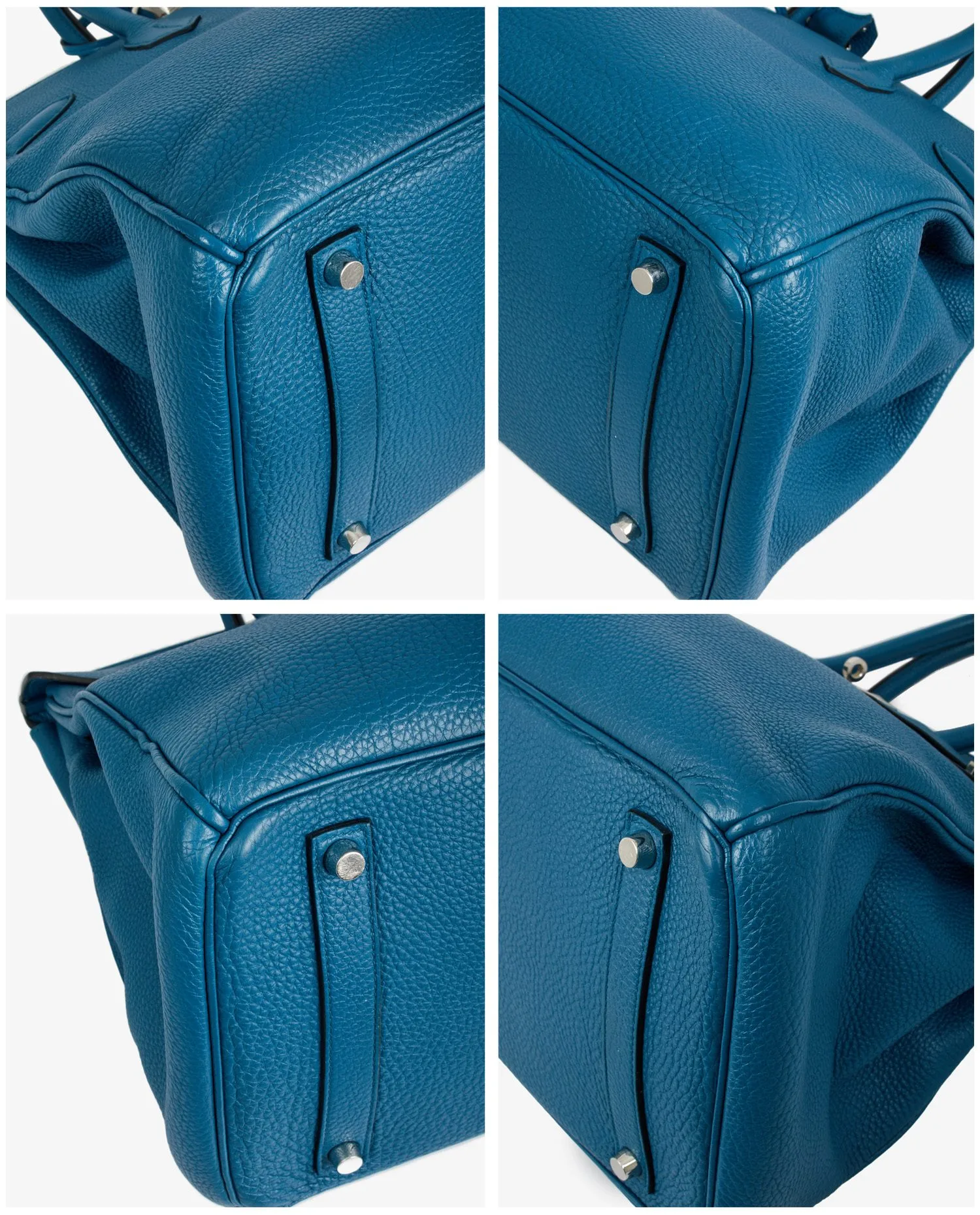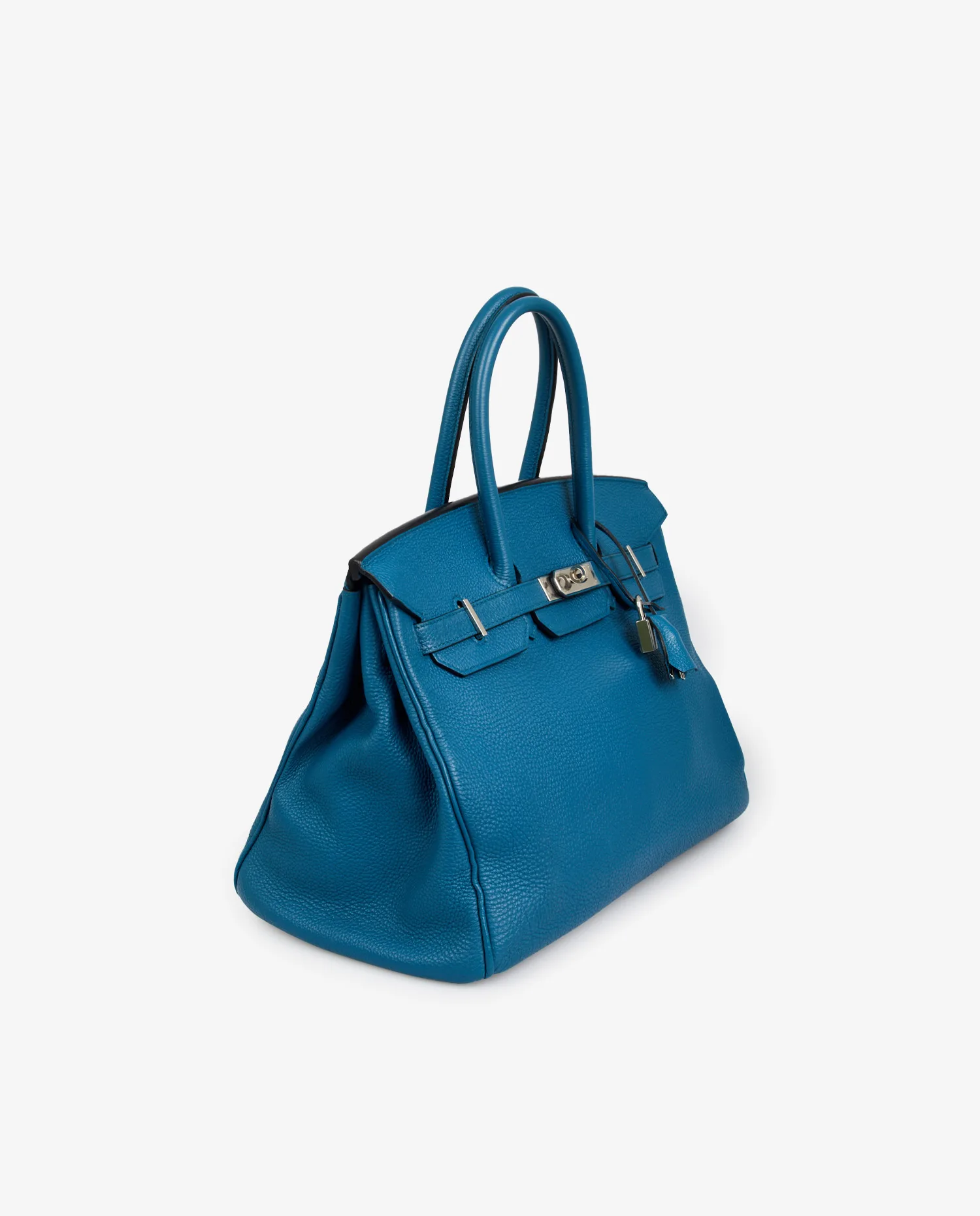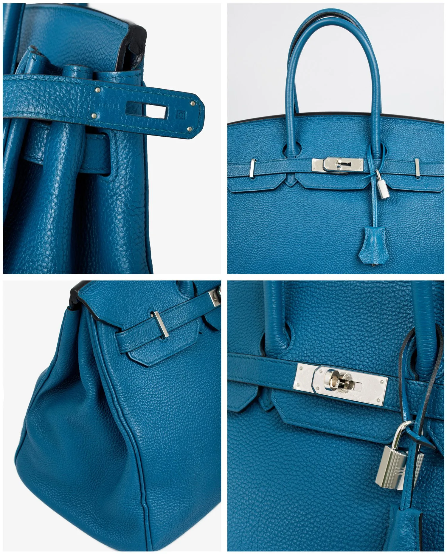 Sac Birkin 35 Hermès cuir togo bleu colvert. Porté main. Bijouterie argent. En très bon état. Le plastique est toujours présent sur la bijouterie du fermoir.