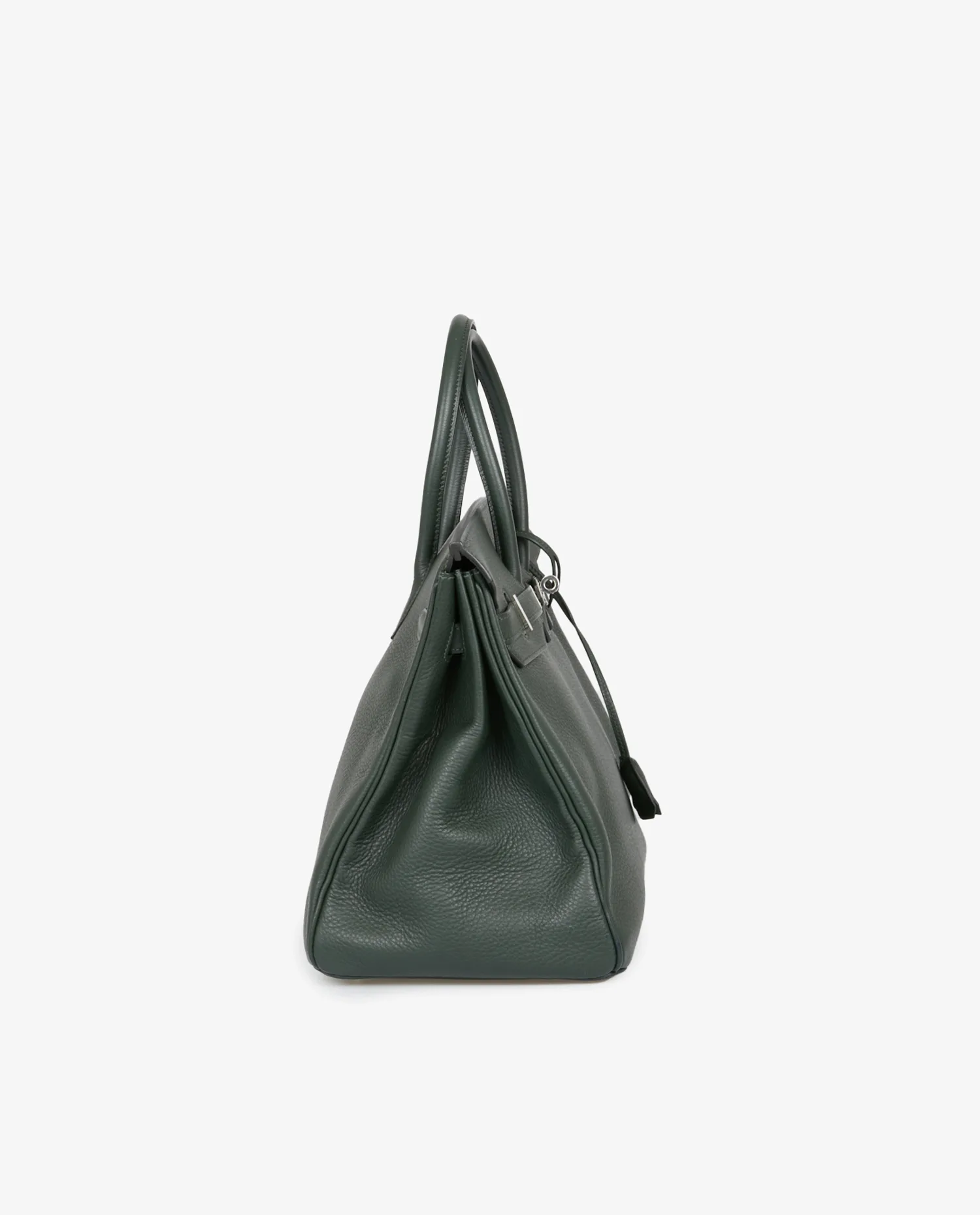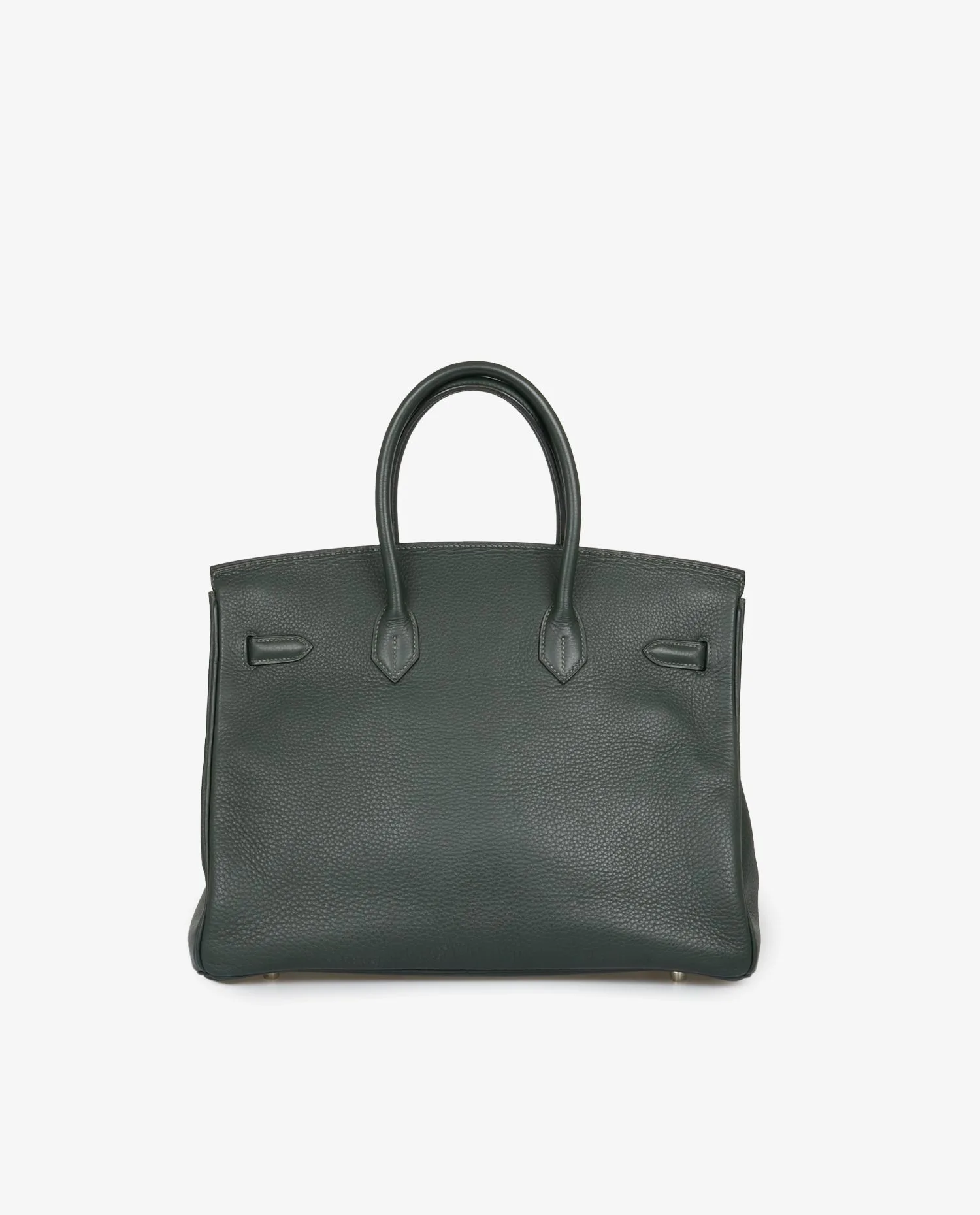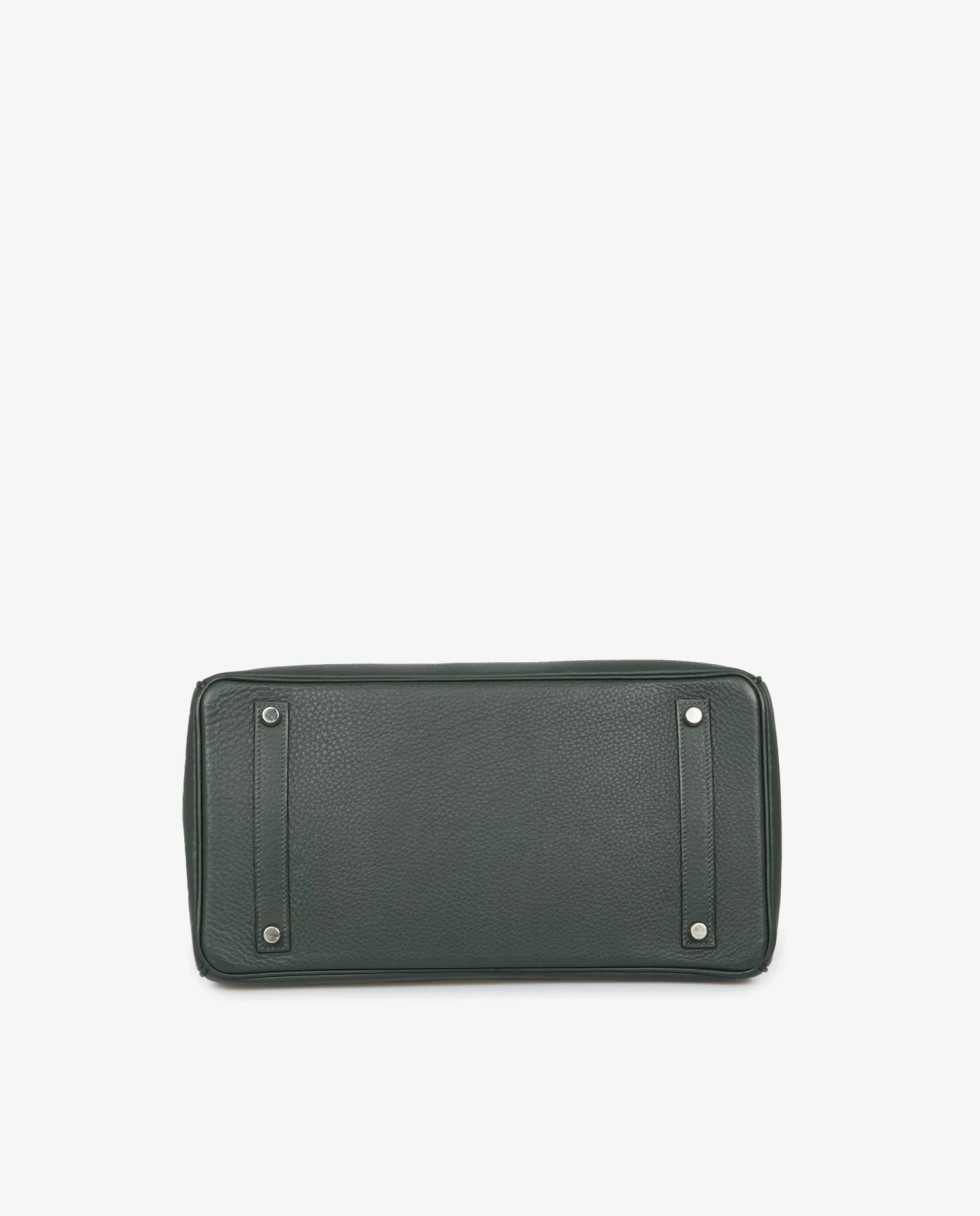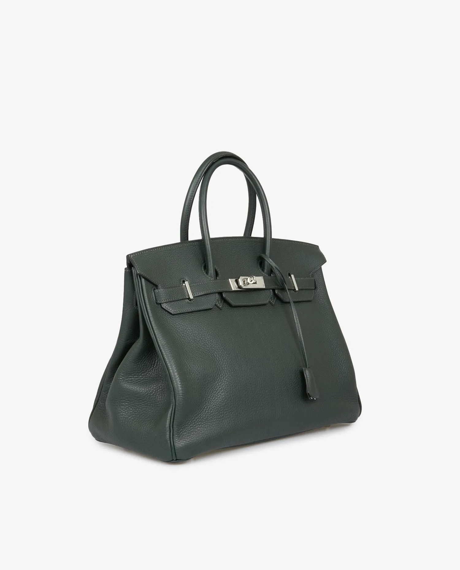 Sac Birkin 35 Hermès cuir togo vert sapin. Bijouterie argent. Tirette, clochette, cadenas et clefs. Lettre F dans un carré, 2002. En très bon état. Légères marques d’usure sur la bijouterie. Voir photos.