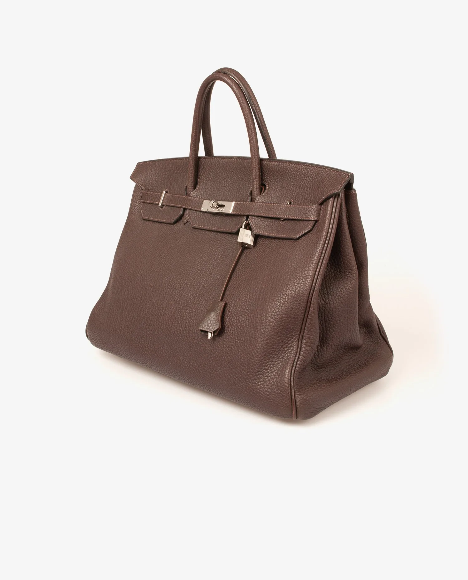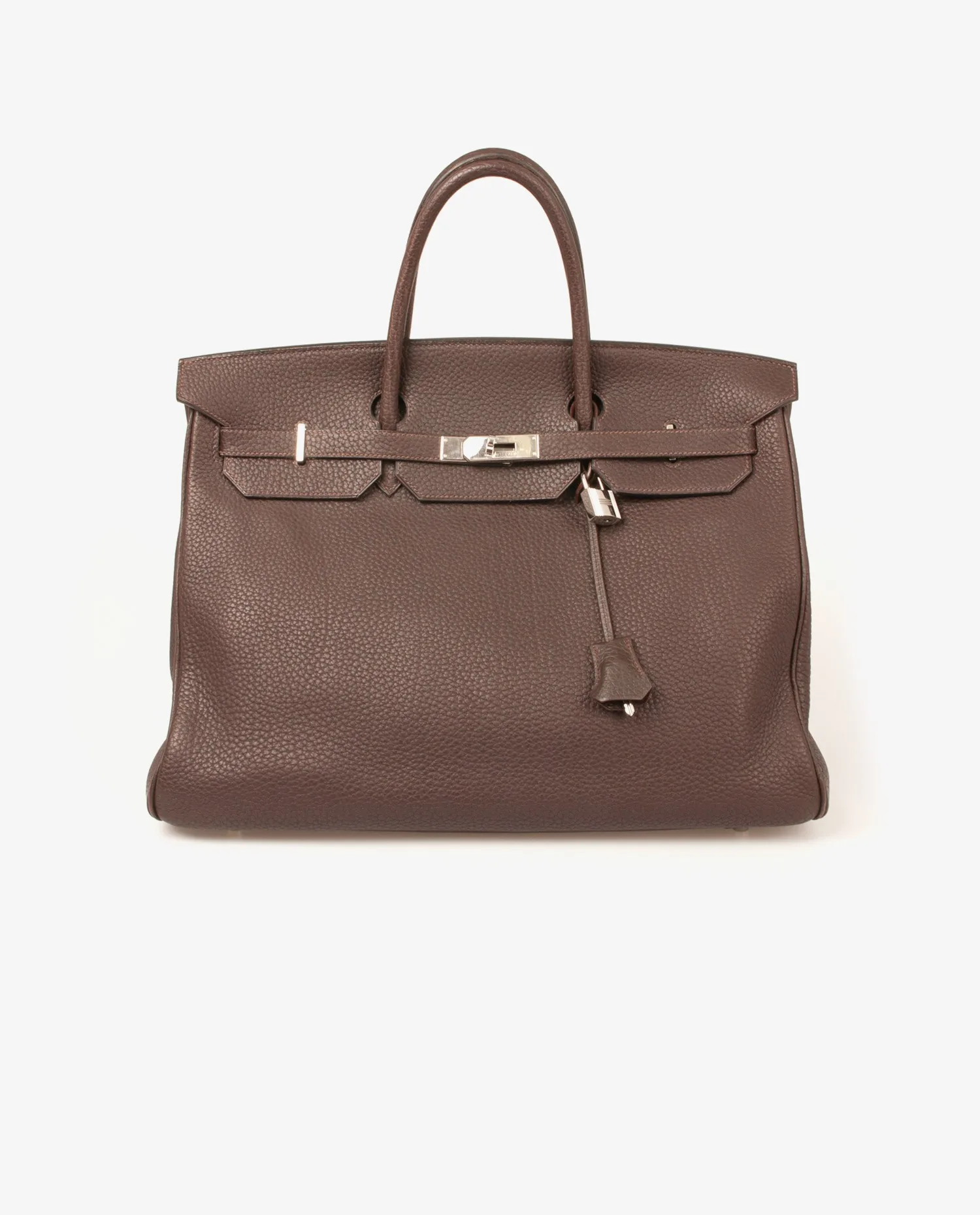 Sac Birkin 40 en cuir fjord marron de la Maison Hermès avec finitions argent. Il se porte à la main. Tirette, clochette et cadenas. A l’intérieur, 2 grandes poches dont 1 zippée.