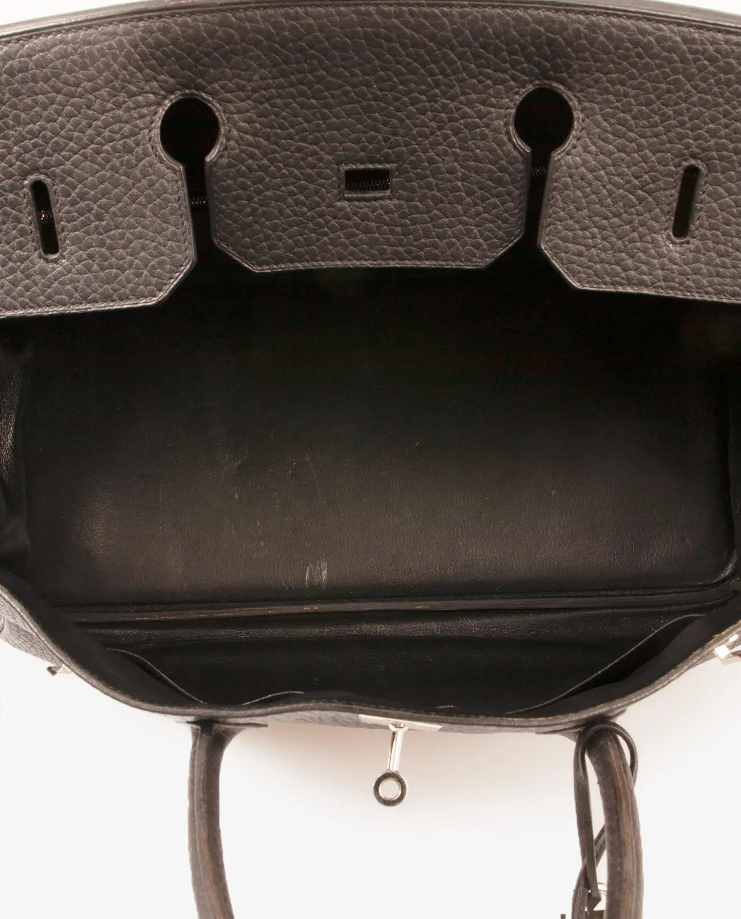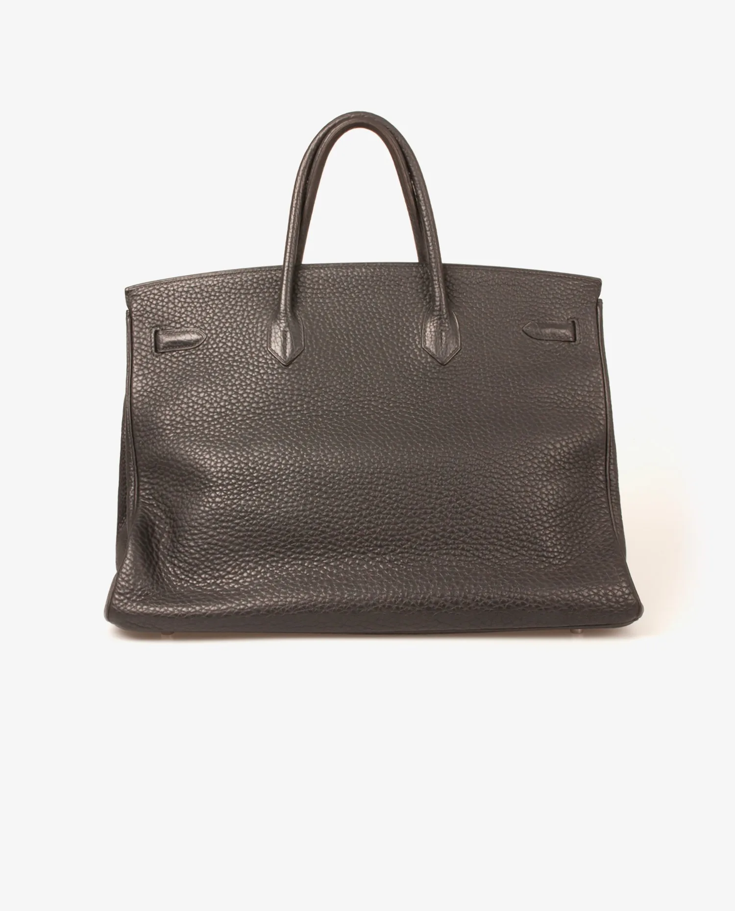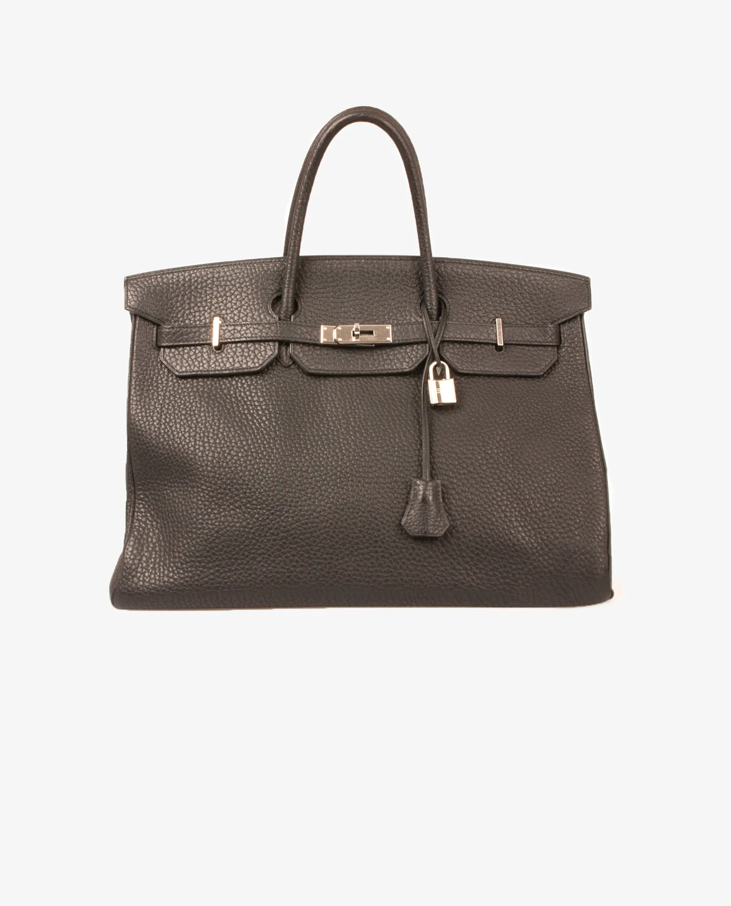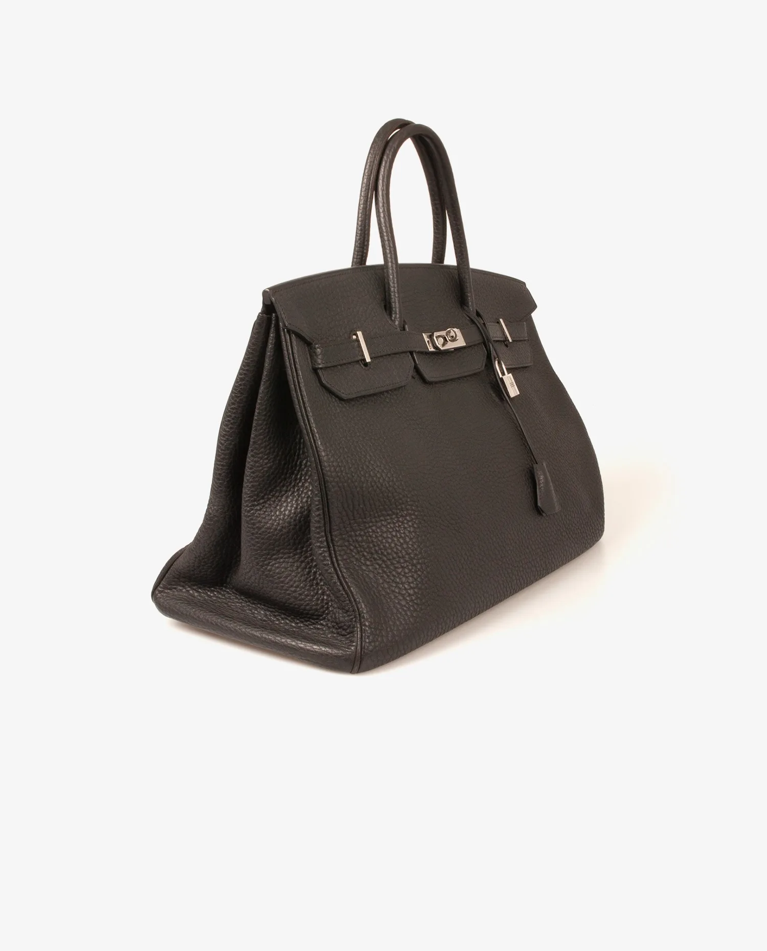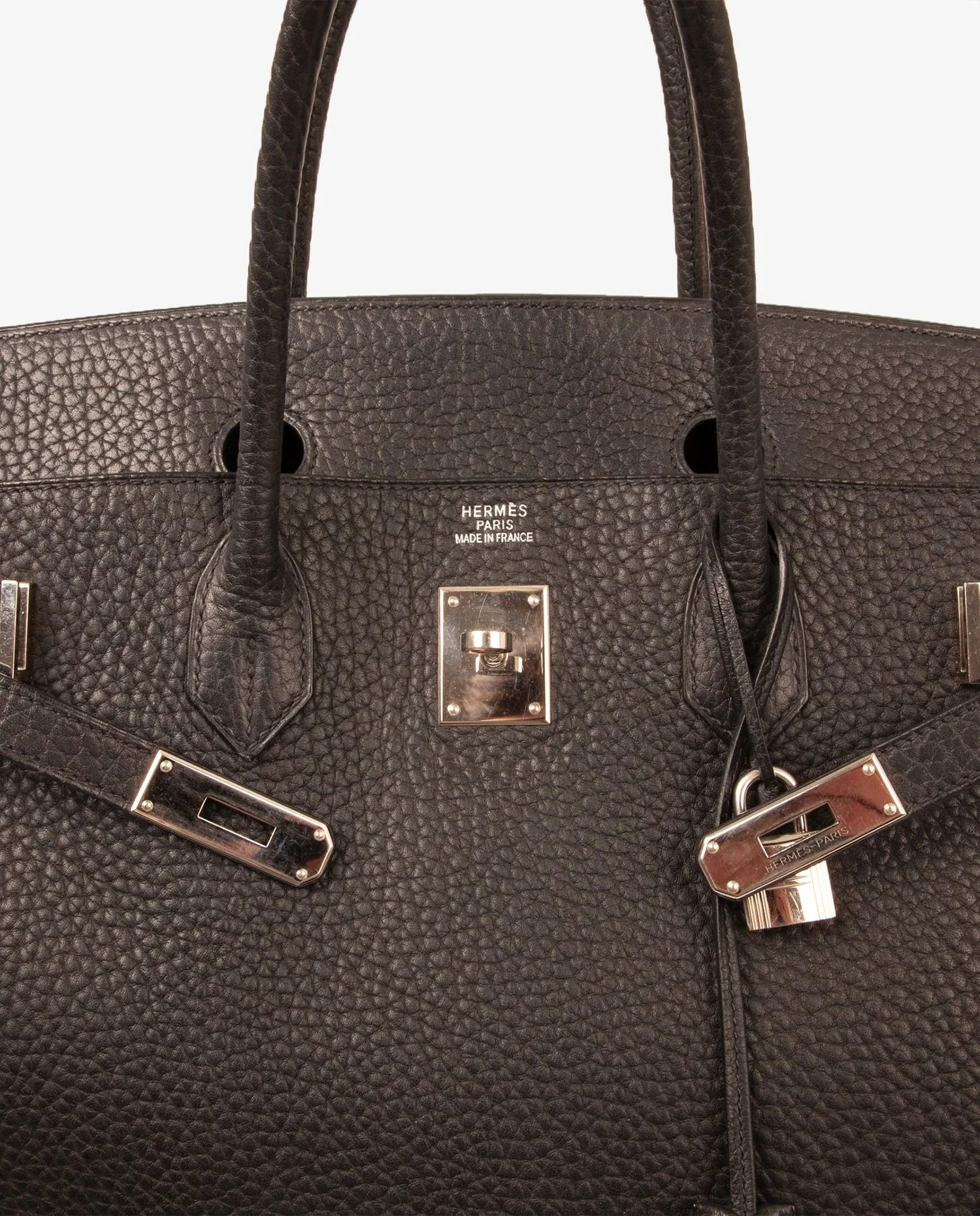 Sac Birkin en cuir Fjord noir de la Maison Hermès avec finitions argent. Il se porte à la main. Tirette, clochette et cadenas. A l’intérieur, 2 grandes poches dont 1 zippée.
