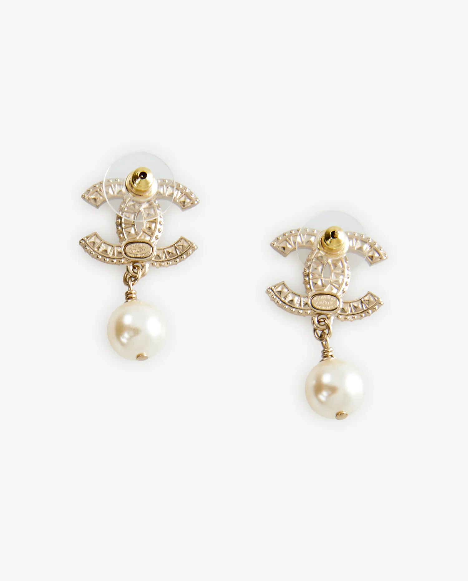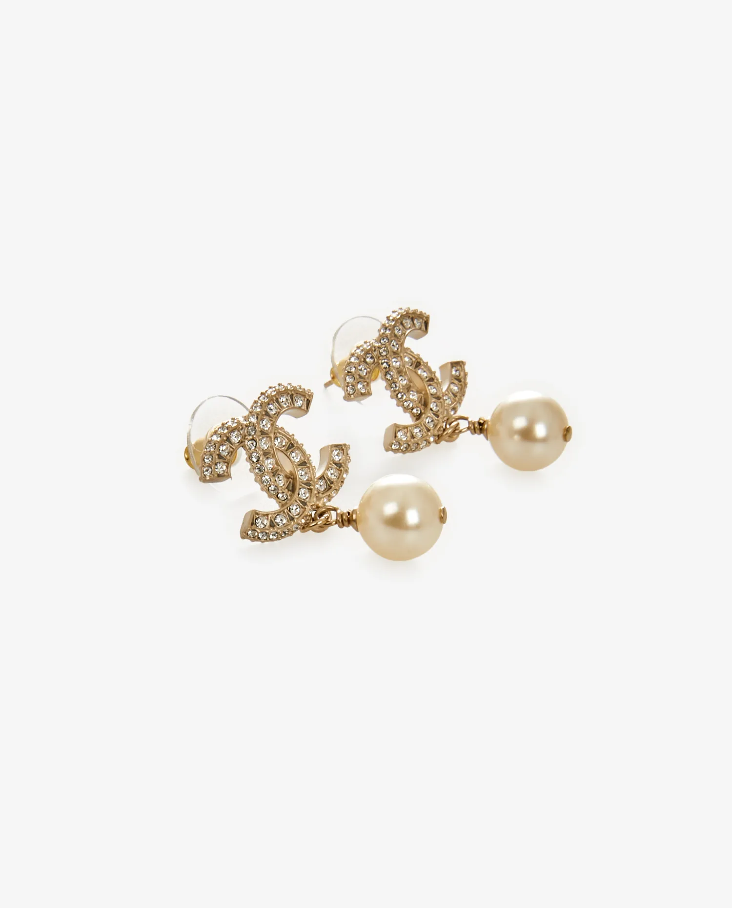 Clous pendants Chanel en métal or pâle, perle et strass. Collection Automne 2018. Jamais porté.