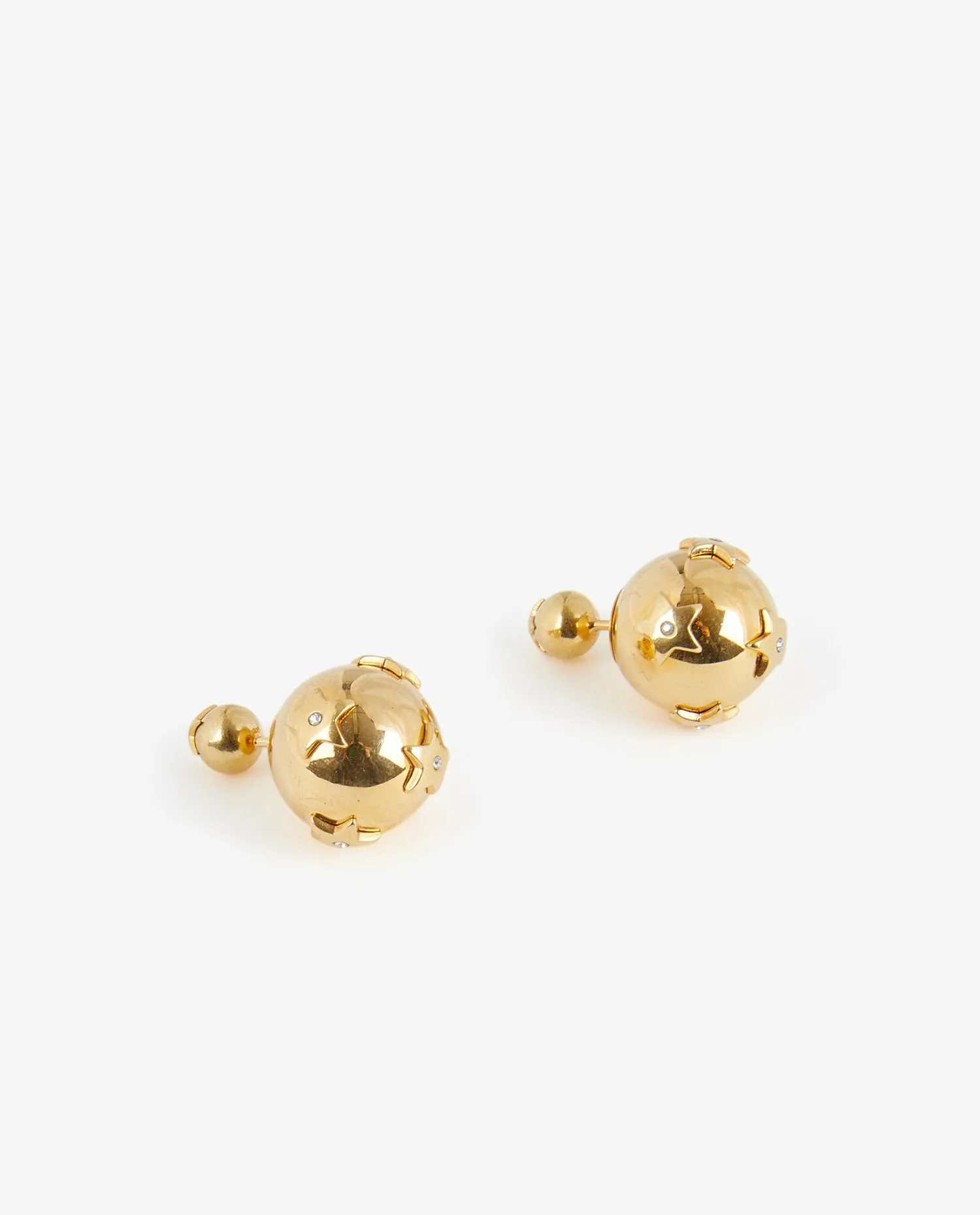 Boucles d’oreilles tribales Dior dorées avec des étoiles et strass au centre. En très bon état. Petites rayures visibles sur l’une. Diamètre de la perle 1,6.