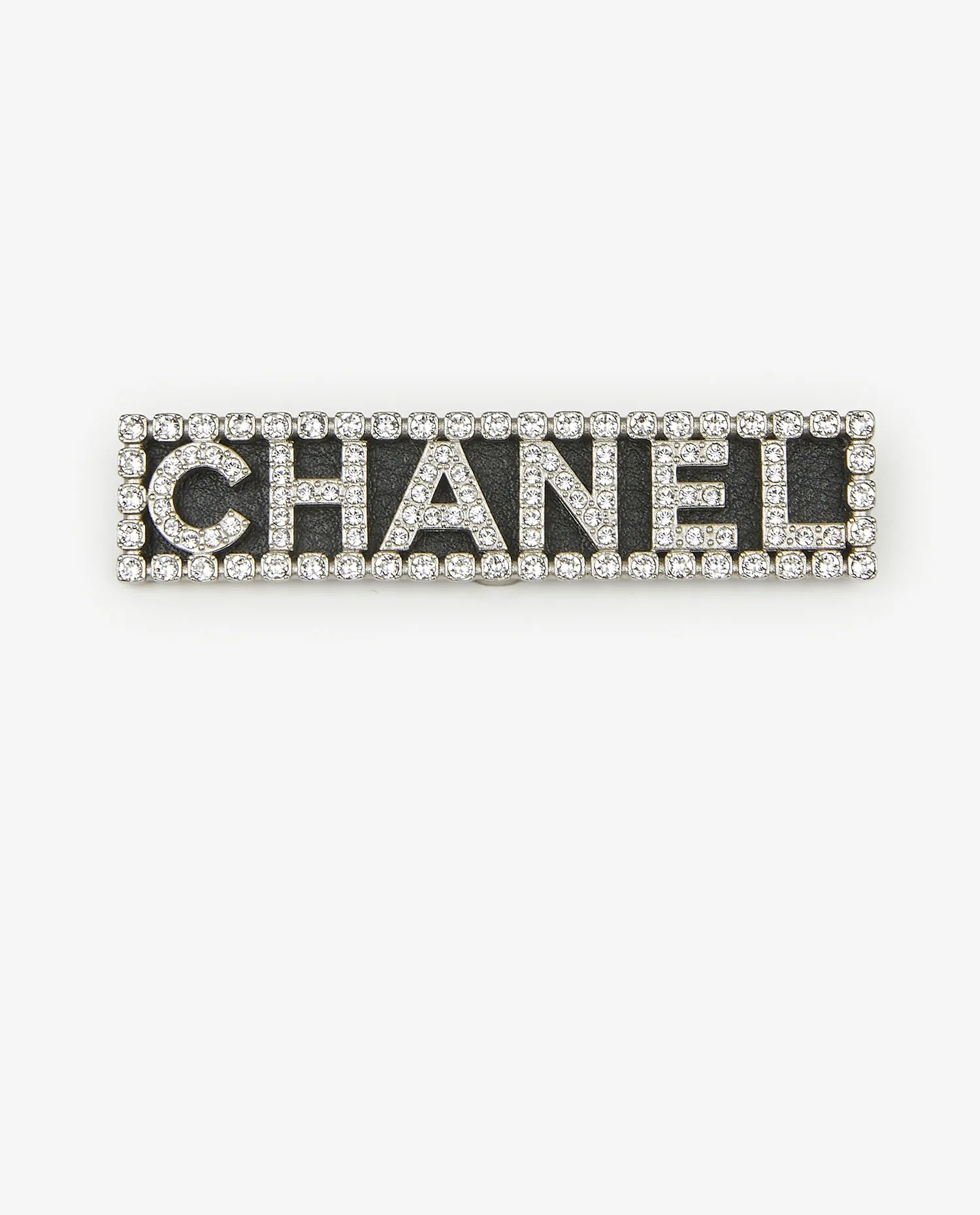 La structure rectangulaire repose sur un métal argenté aux contours nets, encadrant le lettrage « CHANEL » en capitales. Chaque lettre est incrustée de strass translucides, créant un effet scintillant homogène. Le pourtour est également orné de pierres, accentuant l’aspect bijou. Le fond noir mat met en valeur la brillance des éléments. Les dimensions allongées renforcent la lisibilité du logo et facilitent son positionnement sur différents supports textiles.