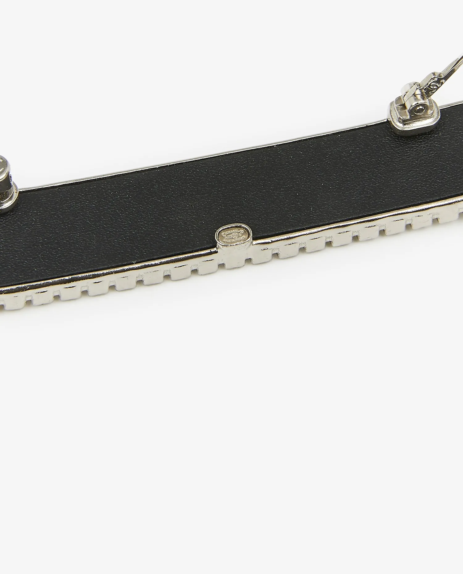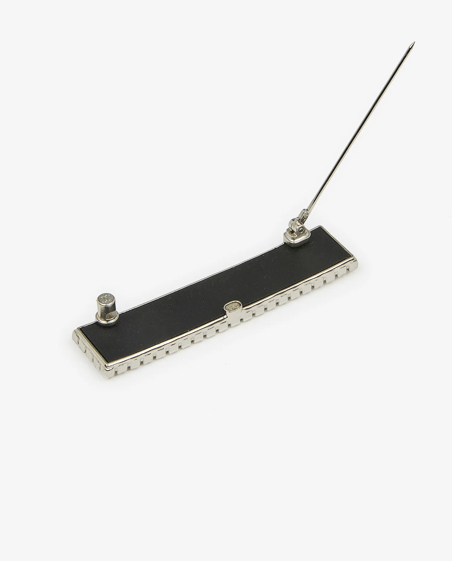 Le revers présente une plaque métallique lisse avec un système d’attache à épingle pivotante, maintenue par un fermoir de sécurité. La construction est robuste, avec une charnière fonctionnelle et bien fixée. On note la présence d’un médaillon central au dos, typique de certaines productions Chanel, pouvant accueillir un marquage ou une signature selon les séries.