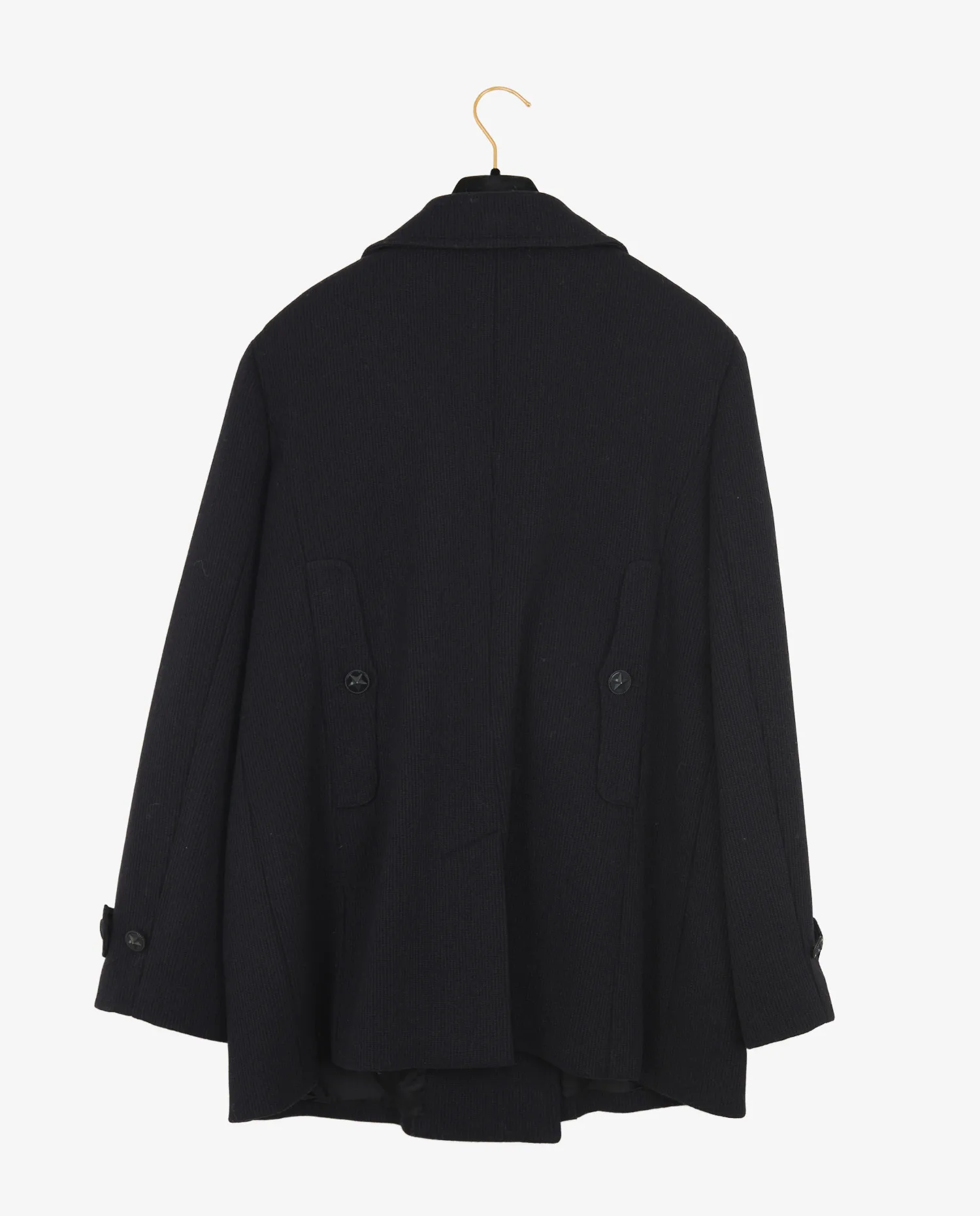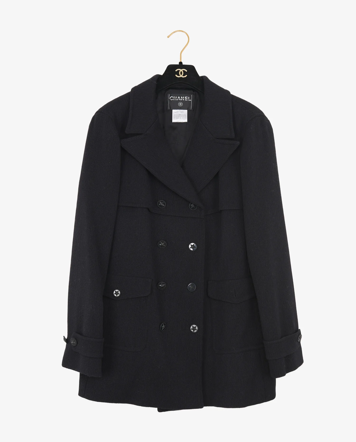 La laine bleu marine présente un tissage discret en relief, apportant une texture visuelle subtile. La coupe est droite, avec un col à larges revers et un double boutonnage croisé typique du caban, orné de boutons métalliques étoilés siglés “CC”. Les quatre poches à rabat cousues sur le devant ajoutent à la fois du volume et de la praticité. Les poignets disposent de pattes boutonnées réglables, renforçant l’inspiration militaire du modèle. Le dos est structuré avec deux découpes verticales prolongées par des pattes décoratives à bouton.