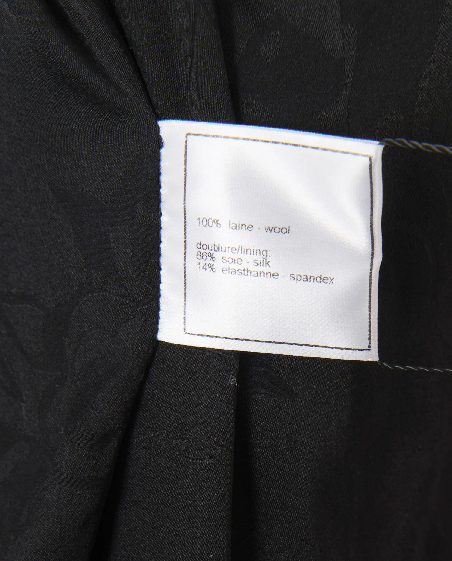 L’intérieur est doublé d’une soie noire à motifs camélias ton sur ton, emblèmes de la maison Chanel. Cette doublure, composée à 86 % de soie et 14 % d’élasthanne, assure confort et souplesse au porter. L’ensemble est entièrement doublé, y compris les manches, garantissant une isolation thermique optimale tout en préservant la ligne fluide du manteau.