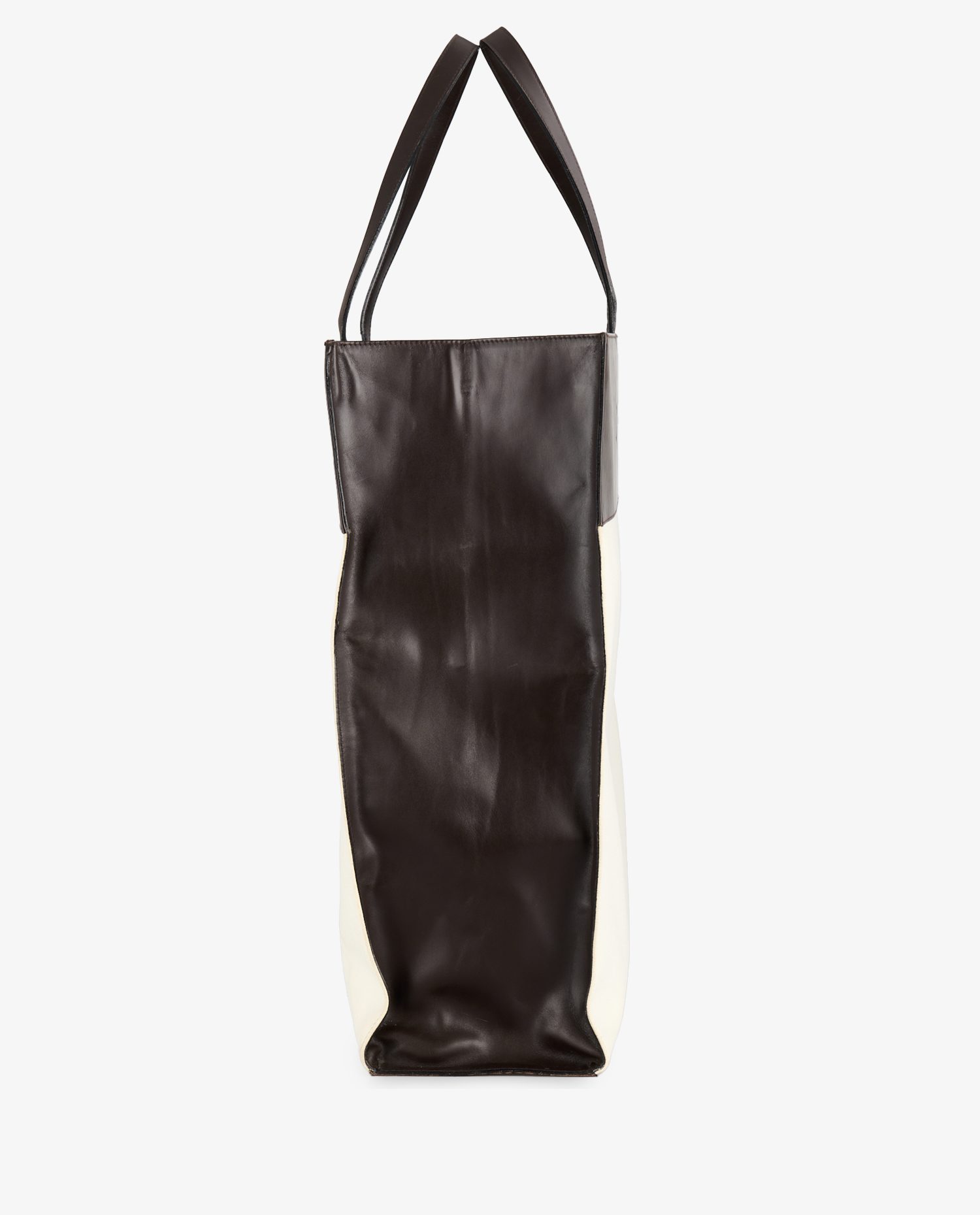 L’extérieur du sac présente un cuir lisse chocolat foncé sur les côtés, les poignées et le bandeau supérieur, subtilement embossé du logo Celine en lettres capitales ton sur ton. Le corps du sac est en cuir blanc texturé, contrastant avec élégance. Les lignes sont nettes, presque graphiques, et le format rectangulaire accentue la pureté du design. Les poignées plates permettent un porté Paule confortable malgré le volume. À noter, deux petites taches légeres orangées sont visibles sur la partie avant du sac ainsi que Quelques signes d’usure visibles sur les coins inférieurs (légères marques et frottements, cohérents avec l’âge du sac et son usage.