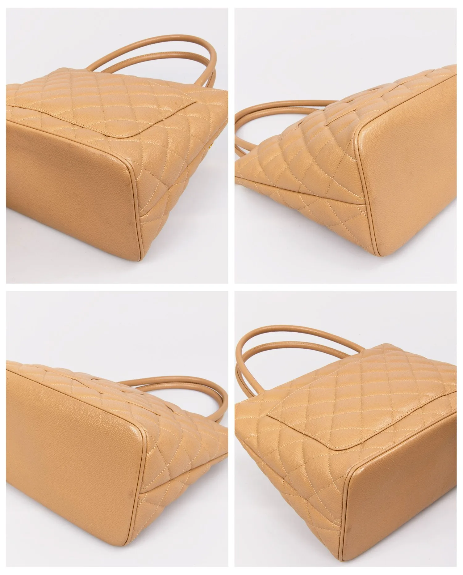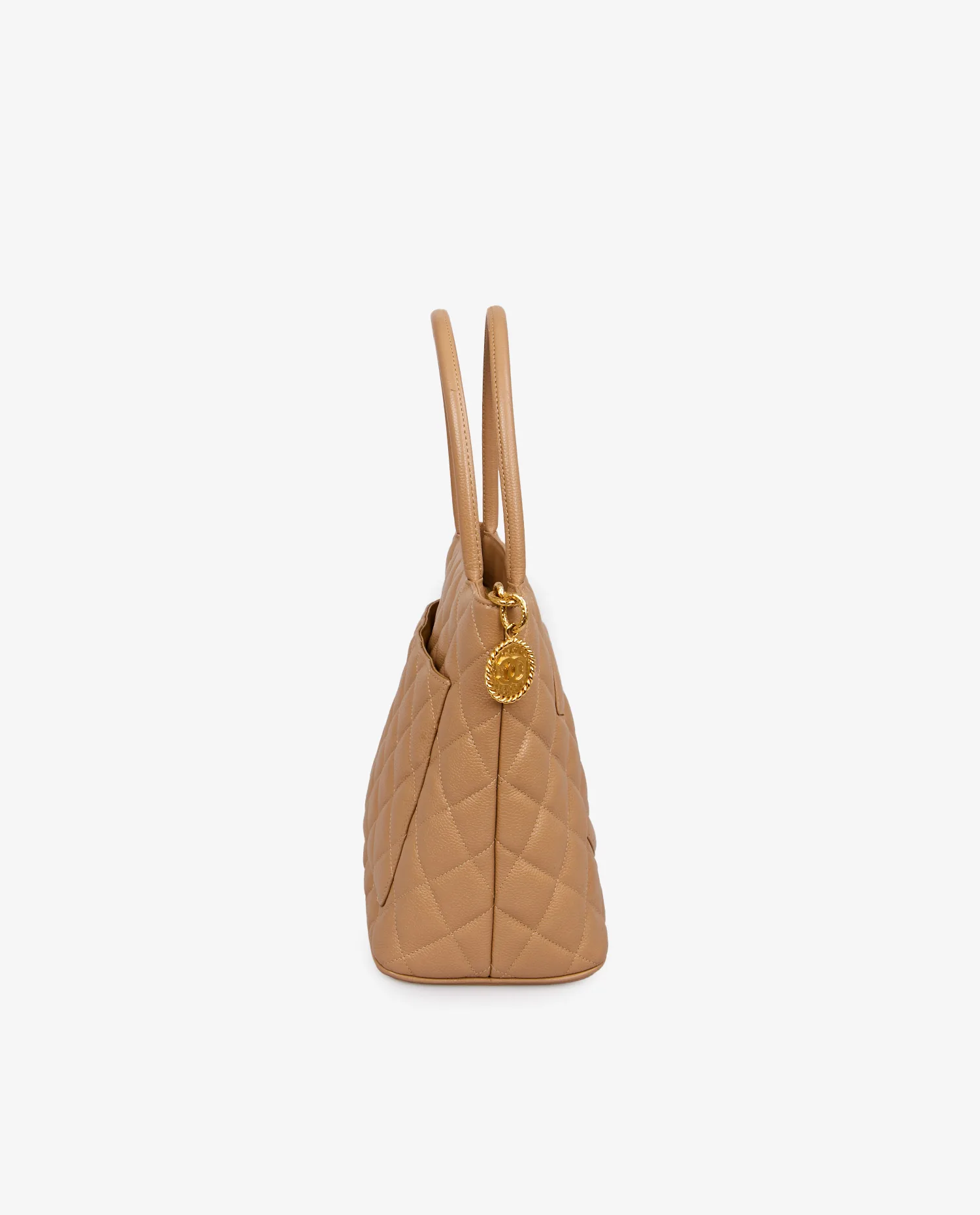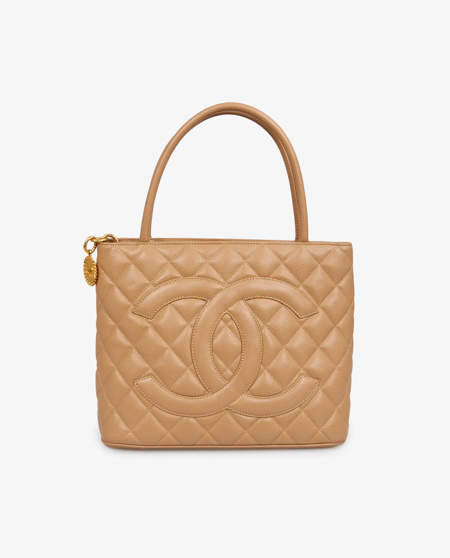 Le cuir caviar, ici décliné dans une teinte beige sable, offre un grain épais et régulier, très résistant à l’usage. Le matelassage en losanges est profond, uniforme, et encadre parfaitement le logo CC oversize brodé sur le devant. Les poignées sont cousues directement sur le corps du sac, sans attache métallique, pour une ligne fluide. La fermeture à glissière dorée sur le dessus est dotée d’un grand médaillon rond avec le logo Chanel en métal doré 24 carats. Aucun détail n’est superflu ; tout dans ce sac reflète un souci d’élégance fonctionnelle.