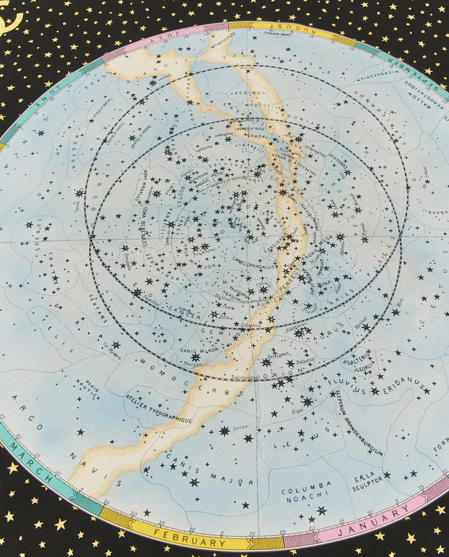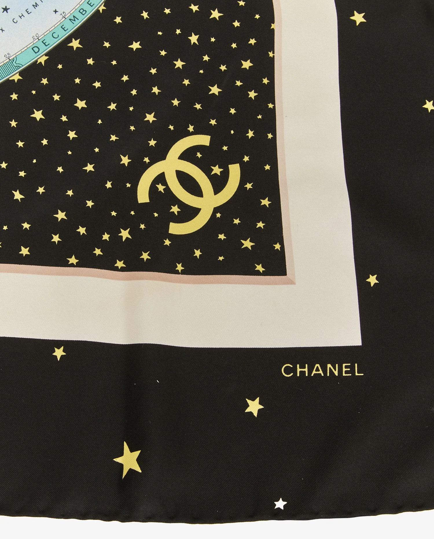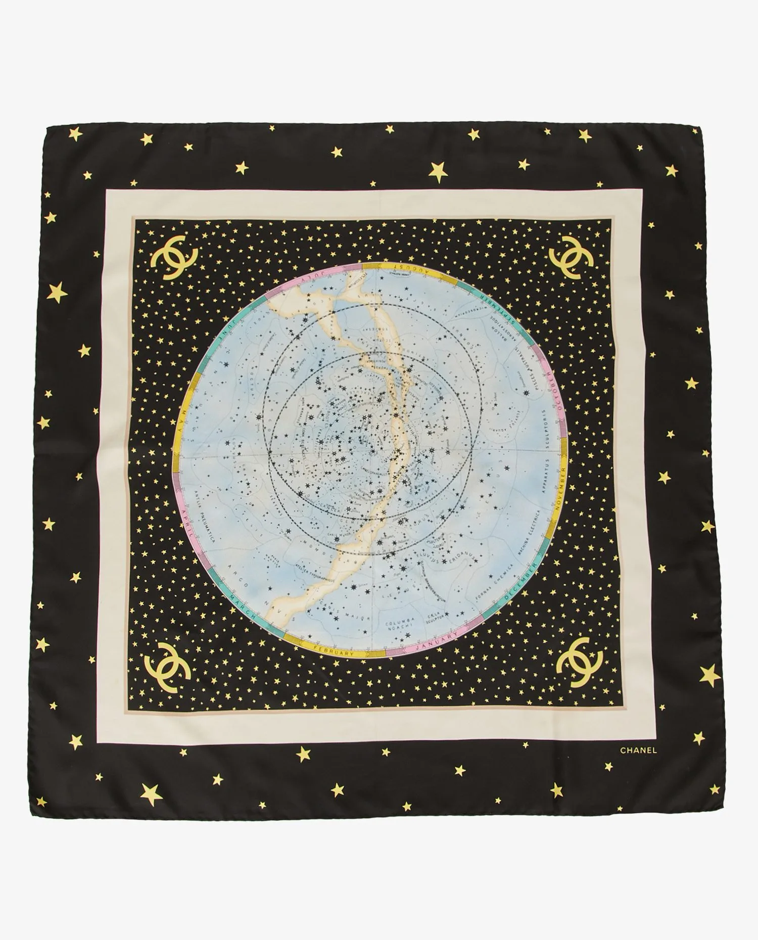 Carré soie Chanel sur le thème astral dans les tons bleu nuit avec des étoiles dorées. Le sigle “CC” se trouve à chaque coin de celui-ci. En très bon état.