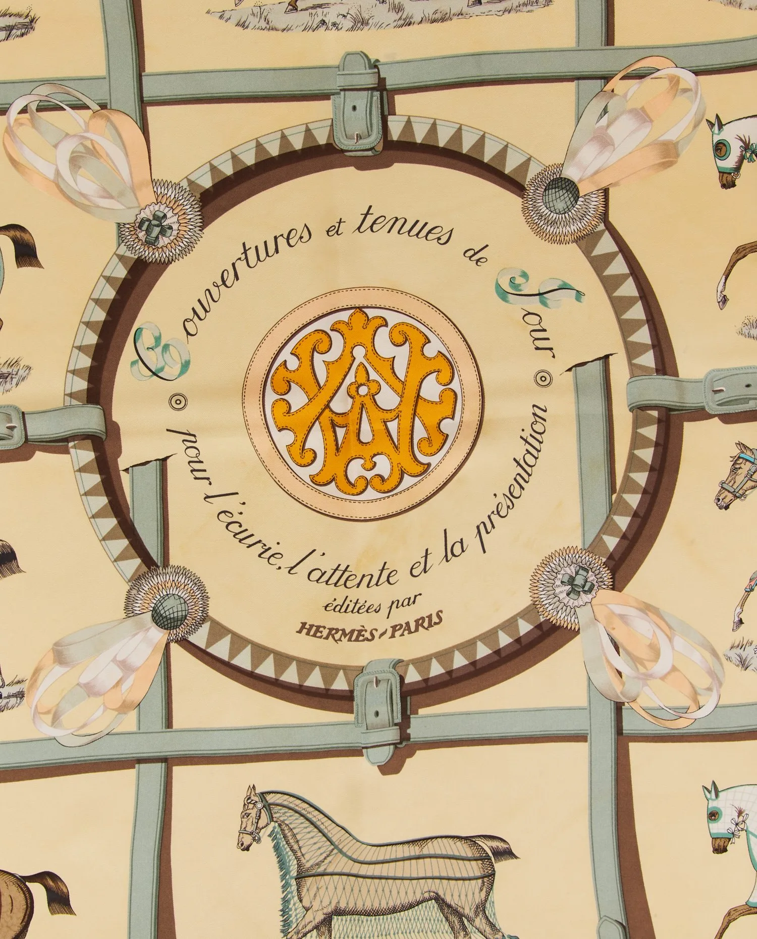 Le carré présente une composition symétrique où neuf chevaux sont représentés portant chacun une couverture distincte, entourés de lanières, brides et décorations équines. La bordure jaune doré encadre l’ensemble et met en valeur les motifs aux couleurs sobres et élégantes. La signature Hermès Paris figure intégrée dans le dessin aux côtés de celle de Jacques Eudel.