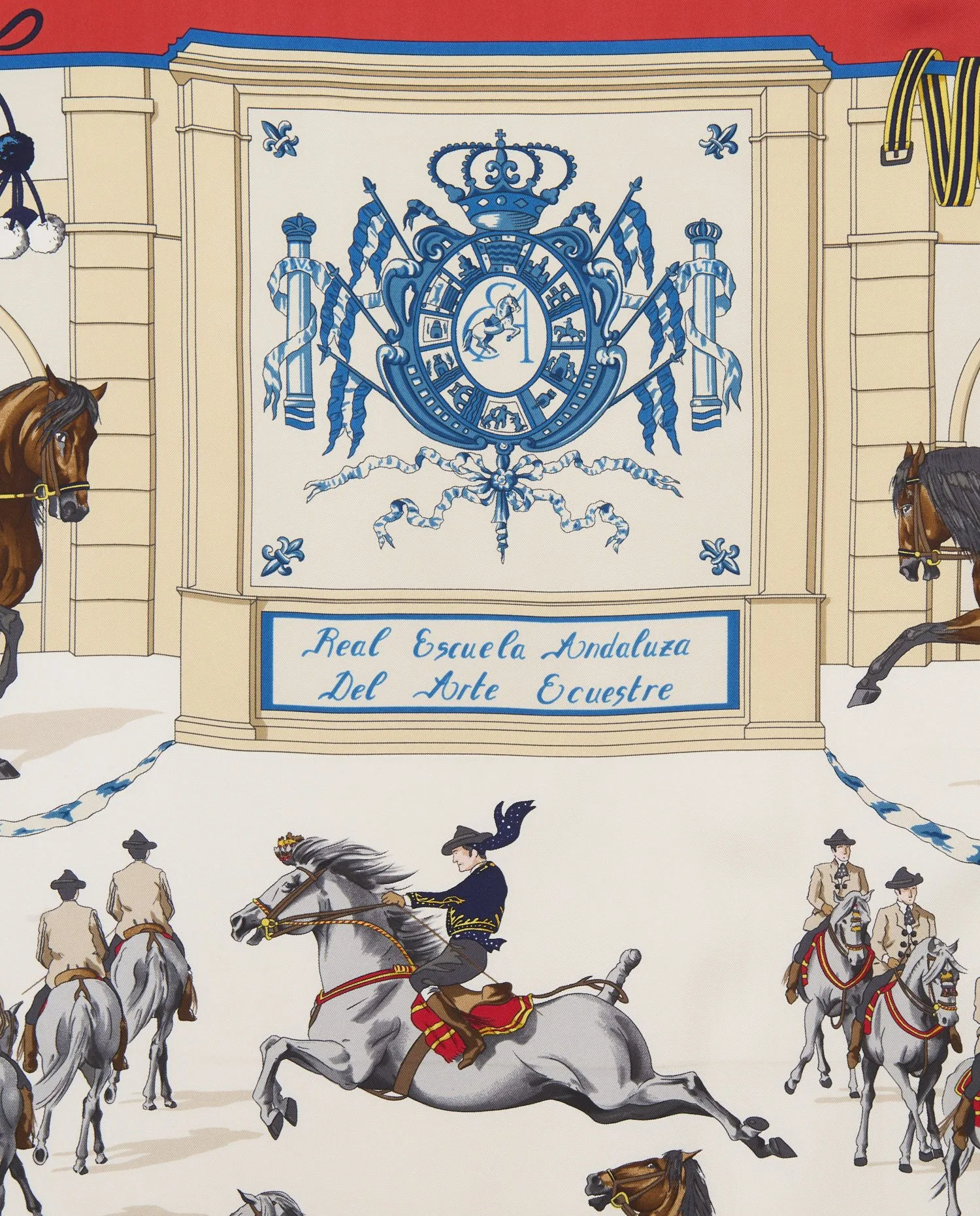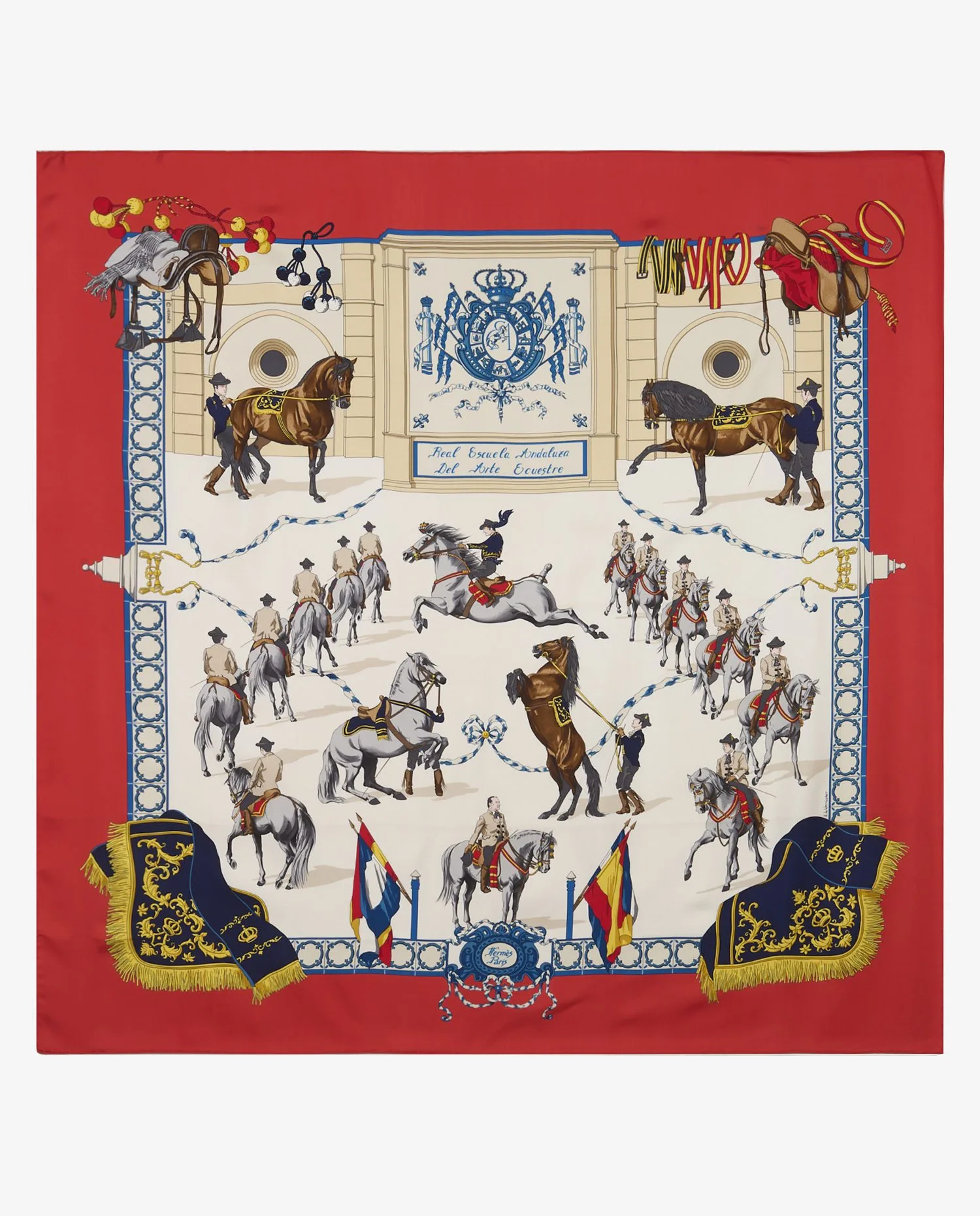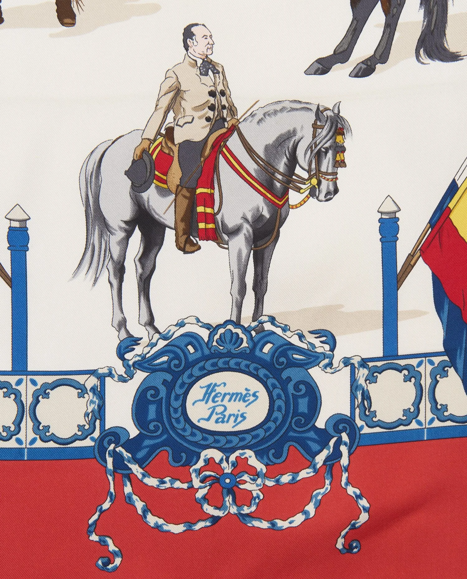 L’élément décoratif central du carré est une scène animée représentant cavaliers et chevaux andalous en action, capturant des mouvements classiques tels que la levade, le passage et le cabriole. Autour de cette scène principale, un riche encadrement graphique évoque les ornements architecturaux et les tapisseries andalouses : des bordures stylisées aux motifs répétitifs bleu et crème, des guirlandes et cordages évoquant la chorégraphie des reprises équestres, ainsi que des éléments inspirés des décors hispano‑mauresques qui ponctuent les lieux historiques de l’école. L’inscription « Hermès Paris » s’intègre dans un cartouche orné d’arabesques et de motifs baroques en bas du carré, ajoutant une signature élégante à l’ensemble visuel. La soie de finition « twill » est typique des carrés Hermès, offrant une texture douce au toucher et un tombé fluide. Les ourlets roulottés, réalisés à la main, témoignent du savoir‑faire artisanal de la maison. La qualité de l’impression garantit une restitution précise des détails — du pelage des chevaux aux plis des uniformes des cavaliers — faisant de ce carré non seulement un accessoire de mode, mais une véritable miniature picturale.