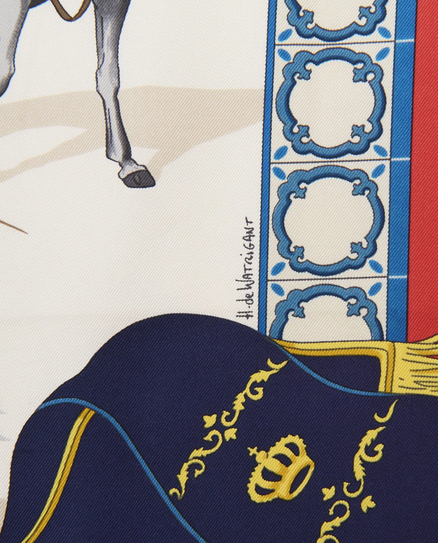 Ce carré Hermès a été édité vers 1996-1997, période durant laquelle la maison intensifiait ses créations autour du thème équestre, un des motifs emblématiques de la marque depuis ses origines liées aux arts du cheval et de la sellerie. Le dessin est signé de H. de Watrigant, un artiste reconnu pour ses compositions inspirées du monde hippique, souvent sollicité par Hermès pour traduire la noblesse du cheval et la tradition équestre dans des motifs soyeux. Cette œuvre s’inscrit dans la tradition Hermès de créer des carrés qui racontent une histoire visuelle, ici celle de la Real Escuela Andaluza del Arte Ecuestre, une institution fondée en 1973 à Jerez de la Frontera en Espagne, dédiée à la préservation et à l’excellence de l’art équestre andalou. La maison royale espagnole accorde à cette école son statut « real » depuis 1987, renforçant son prestige international et son lien culturel avec les arts du cheval.