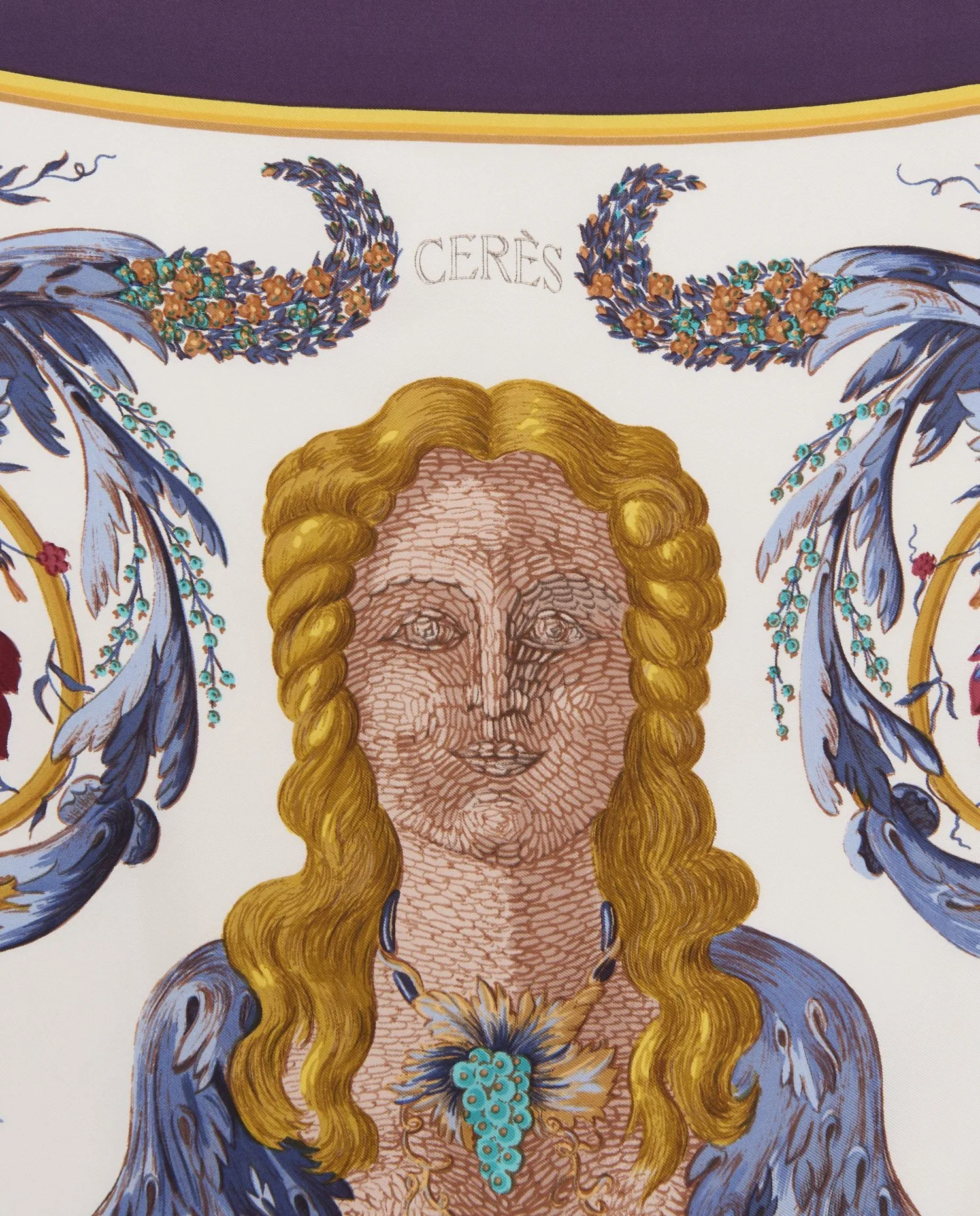 Créé par Françoise Faconnet, l’une des illustratrices les plus prolifiques de l’histoire d’Hermès, Cerès fait partie des carrés à sujet mythologique produits dans les années 1960, à une époque où la maison multiplie les références aux civilisations antiques, à la nature et aux arts décoratifs. La première édition de ce motif date de 1967, une période marquée par une grande liberté graphique dans la conception des foulards. Le thème de la fertilité, des récoltes et de la beauté naturelle y est traité avec un sens du détail proche de la miniature, dans un style évoquant l’ornementation des manuscrits anciens ou des fresques classiques. Hermès n’ayant pas confirmé de réédition officielle récente de ce dessin, les exemplaires disponibles aujourd’hui sont le plus souvent issus des premières séries ou d’éditions anciennes restées fidèles à la création d’origine.