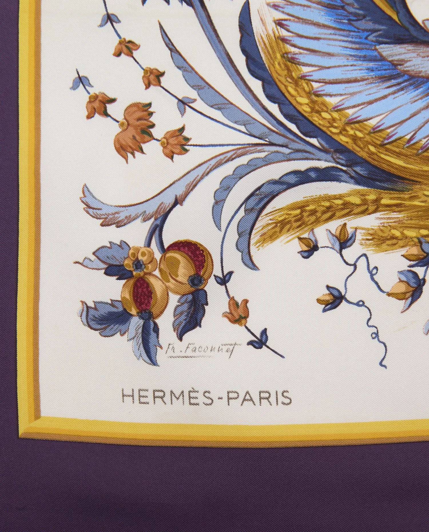 Ce carré mesure environ 90 x 90 cm. Le dessin est centré autour d’une figure féminine aux allures de déesse, dont le corps est fusionné à des éléments végétaux et ailés. Des oiseaux colorés — pinsons, hérons, alouettes — animent les coins de la composition, parmi des arabesques stylisées de feuillages, d’épis de blé et de grappes dorées. Les teintes sont subtiles mais vibrantes : le bleu cobalt répond à un violet profond, le jaune doré s’équilibre par des touches de bordeaux et de turquoise, tandis que les beiges, bruns et orangés apportent chaleur et contraste. La signature de l’artiste et le marquage Hermès-Paris sont discrètement apposés dans le bas du foulard. La matière est un twill de soie 100 %, reconnaissable à son tissage finement strié, qui assure souplesse, luminosité et tenue impeccable. Les bords sont roulottés à la main, selon la tradition Hermès. La soie est dense, fluide, agréable à porter et facile à nouer. Aucun défaut de structure ni de trame n’est à noter.