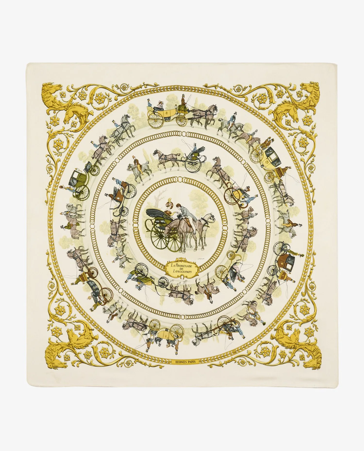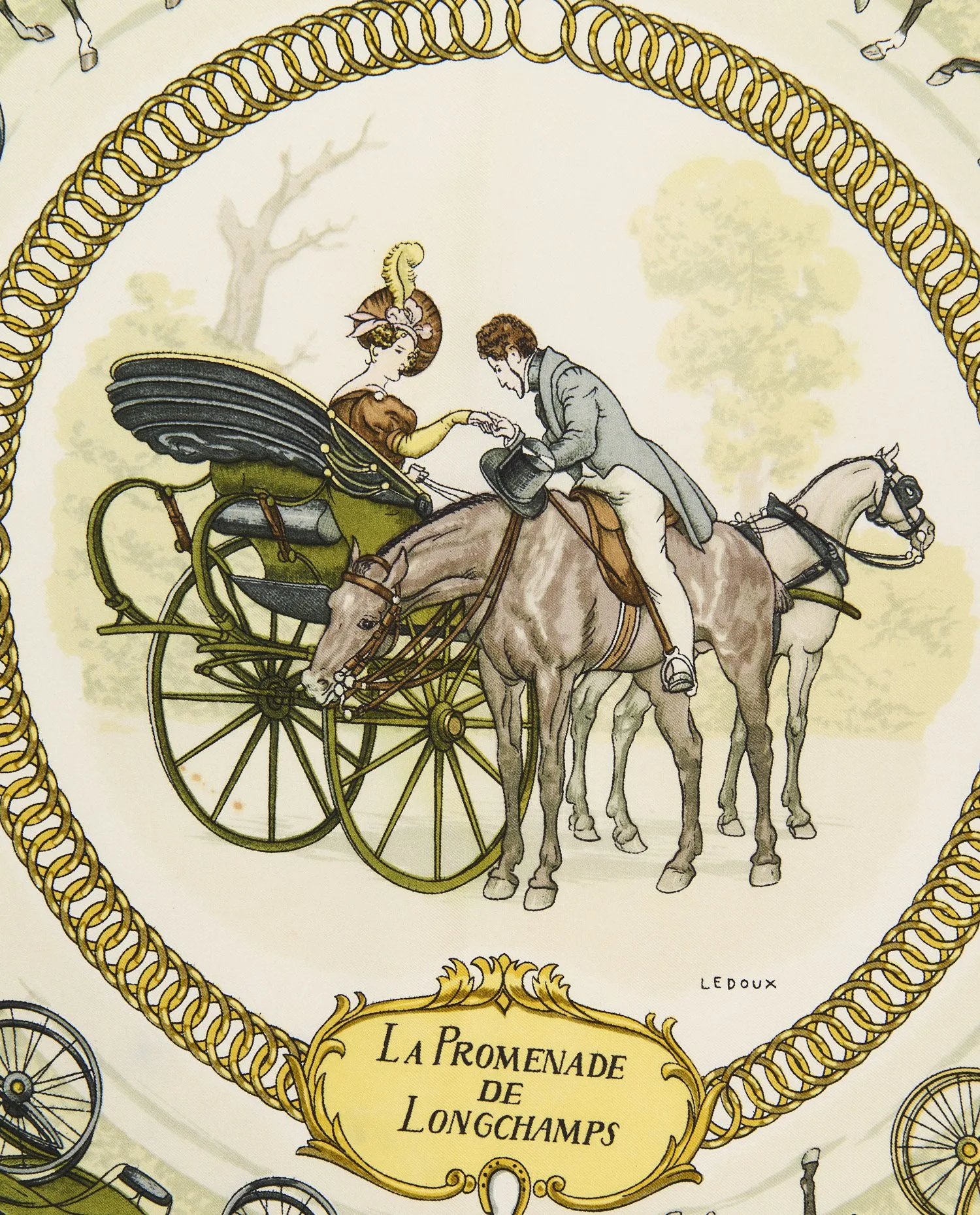 Créé par Philippe Ledoux, artiste emblématique de la maison Hermès actif dès les années 1950, « La Promenade de Longchamps » s’inscrit dans la tradition des carrés à thème équestre qui ont forgé l’identité de la maison fondée en 1837 comme atelier de harnachement. Le motif rend hommage aux défilés mondains du Bois de Boulogne, où l’aristocratie et la grande bourgeoisie parisienne exposaient équipages et tenues raffinées. Le carré Hermès 90×90, lancé en 1937, est devenu une référence internationale dans l’univers du foulard de luxe. Les créations signées Ledoux sont aujourd’hui particulièrement recherchées sur le marché du carré Hermès vintage pour la précision documentaire de leurs scènes et leur richesse narrative.
