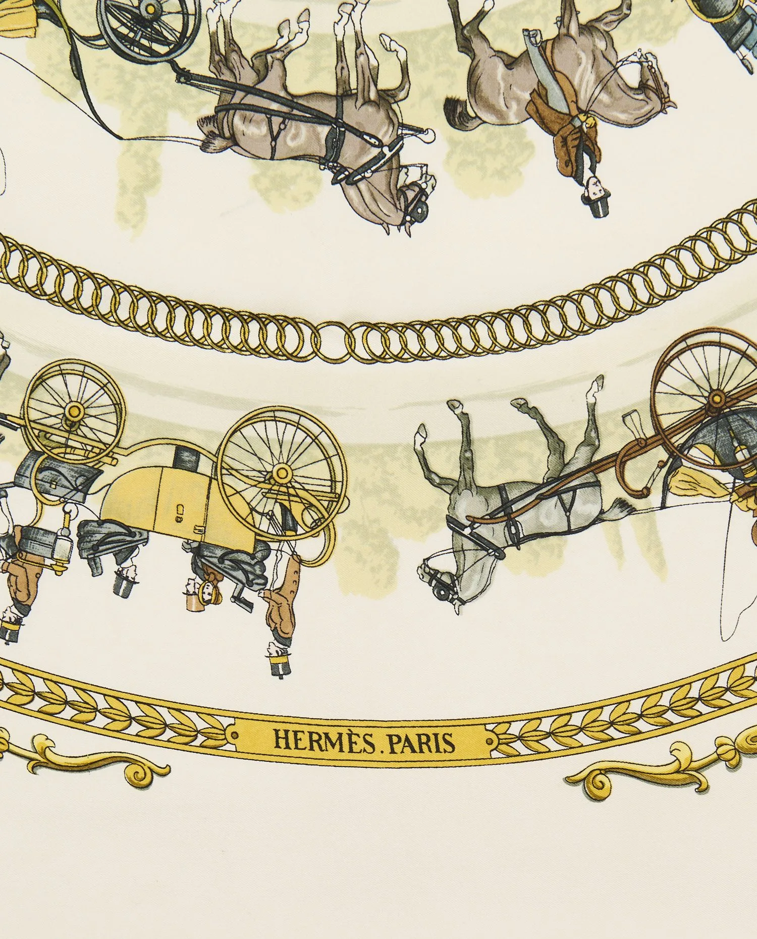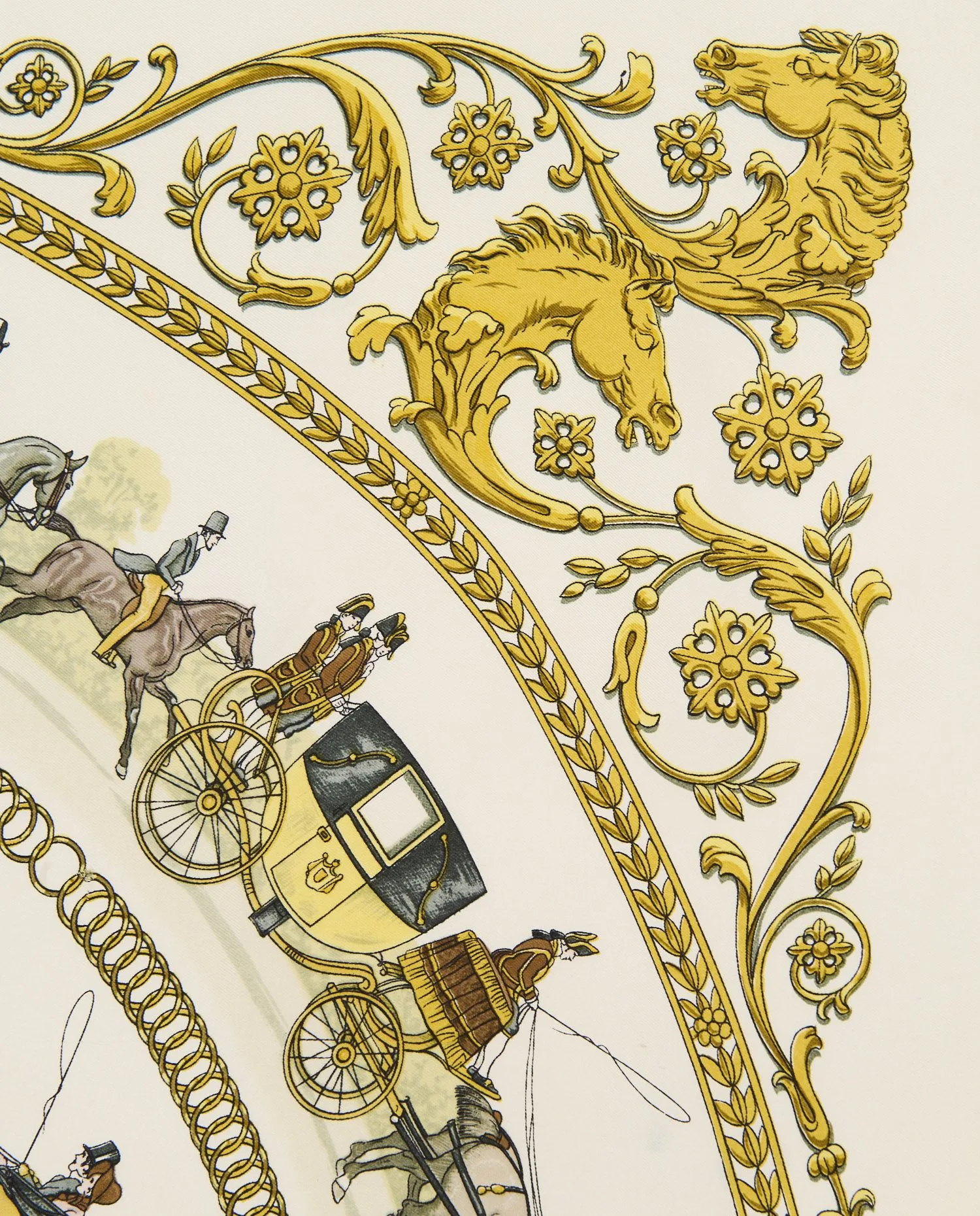 Confectionné en twill de soie 100 %, ce foulard adopte le format iconique 90×90 cm. La composition s’articule en médaillons concentriques représentant différentes scènes d’attelages : cabriolets, voitures hippomobiles et cavaliers en habit d’époque. La bordure est ornée de rinceaux dorés, de chevaux stylisés et de motifs floraux inspirés de l’ornementation classique. L’inscription « Hermès Paris » apparaît en bas du carré, intégrée dans un cartouche décoratif, tandis que la signature « Ledoux » figure près de la scène centrale. Les ourlets roulottés main vers l’endroit témoignent du savoir-faire artisanal propre aux foulards Hermès vintage.