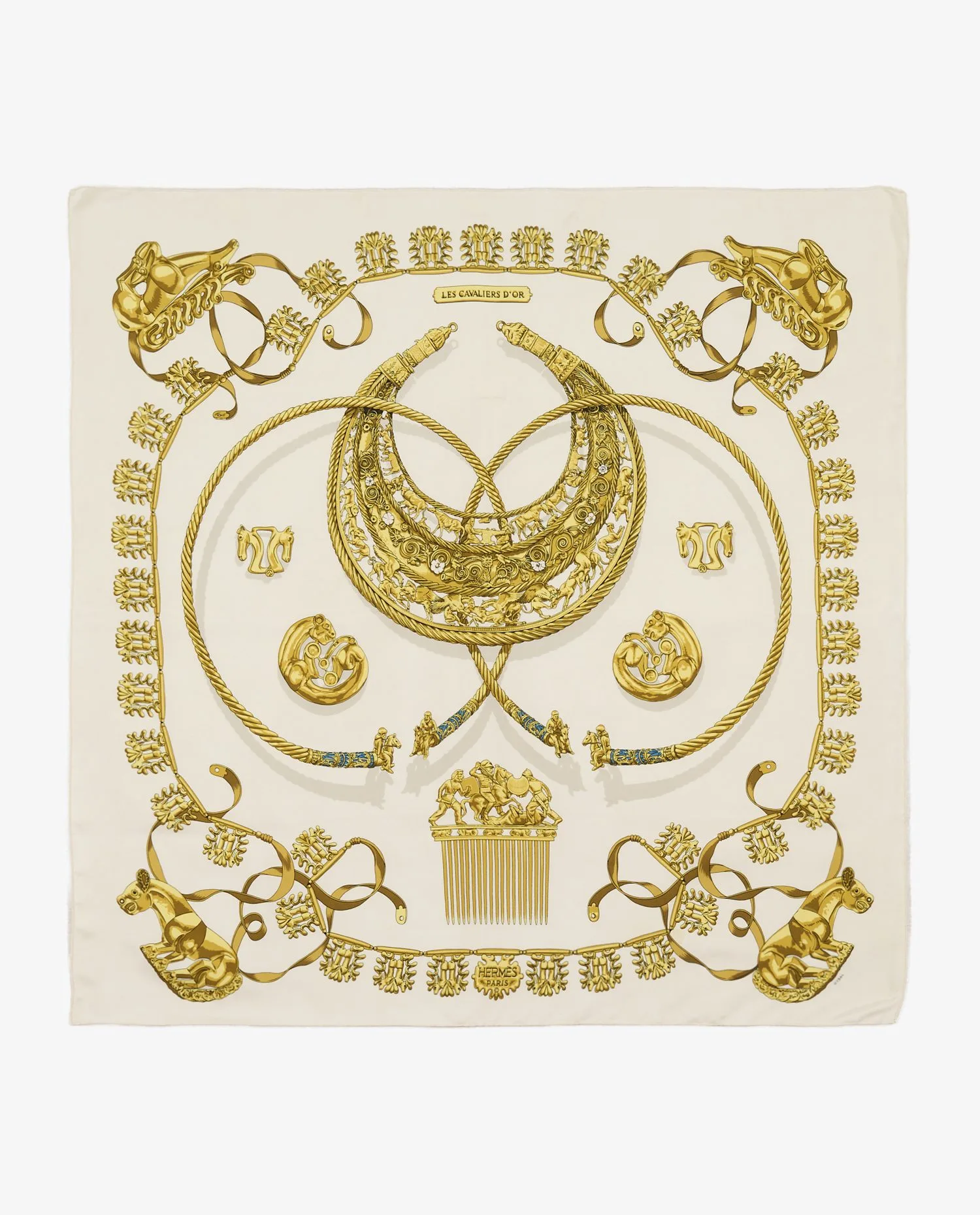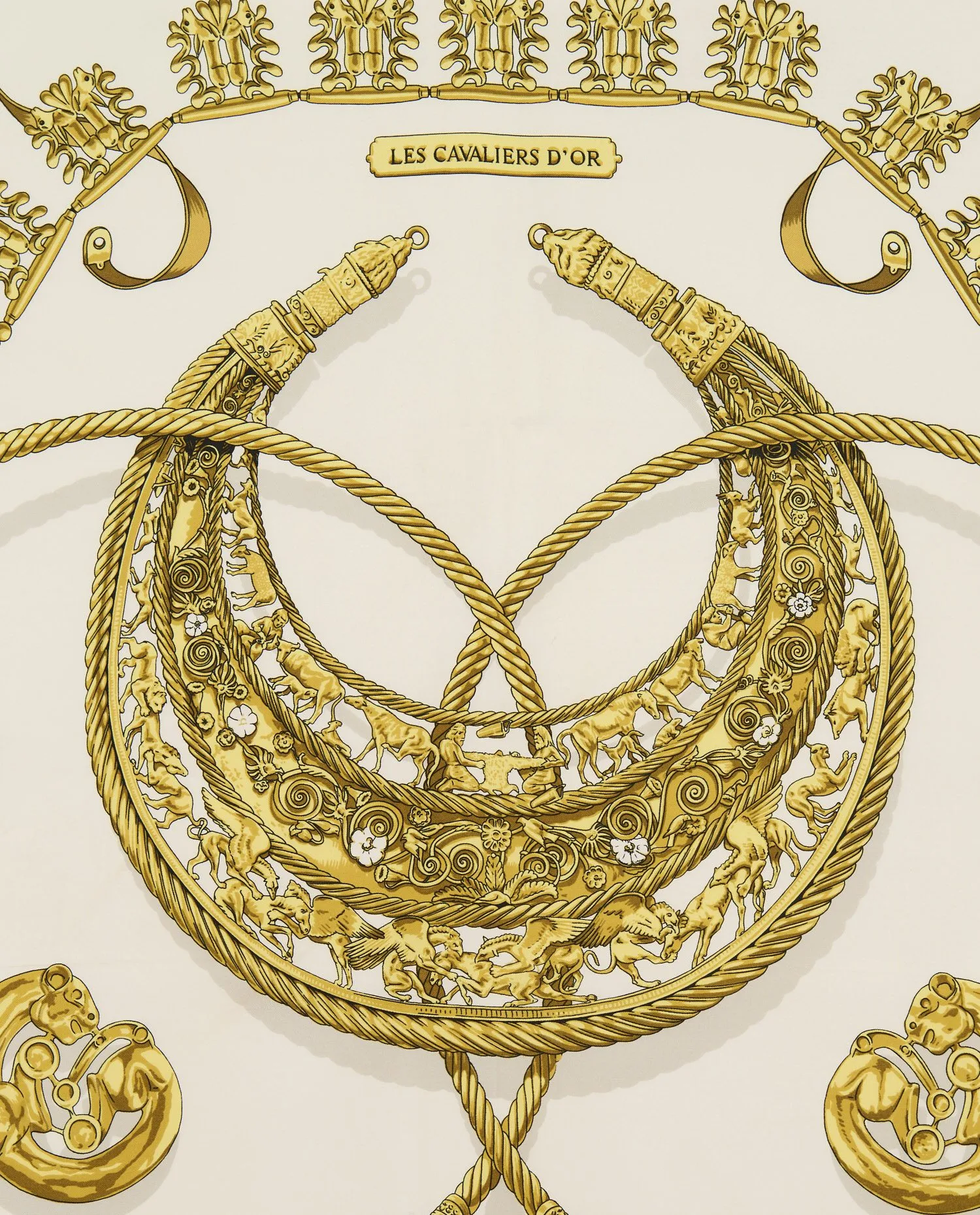 Le carré adopte le format iconique 90 x 90 cm en twill de soie, signature des foulards Hermès depuis 1937. La construction est parfaitement symétrique. Deux grands anneaux richement décorés s’entrelacent au centre, reliés par des cordages torsadés finement dessinés. Une frise périphérique composée de motifs répétitifs structure l’espace et encadre la scène principale. Aux angles figurent des éléments sculpturaux dorés inspirés de l’ornementation antique. Le cartouche supérieur mentionne « Les Cavaliers d’Or », tandis que la signature « Hermès Paris » apparaît en partie inférieure. Les ourlets roulottés main vers l’endroit attestent d’une fabrication française artisanale.