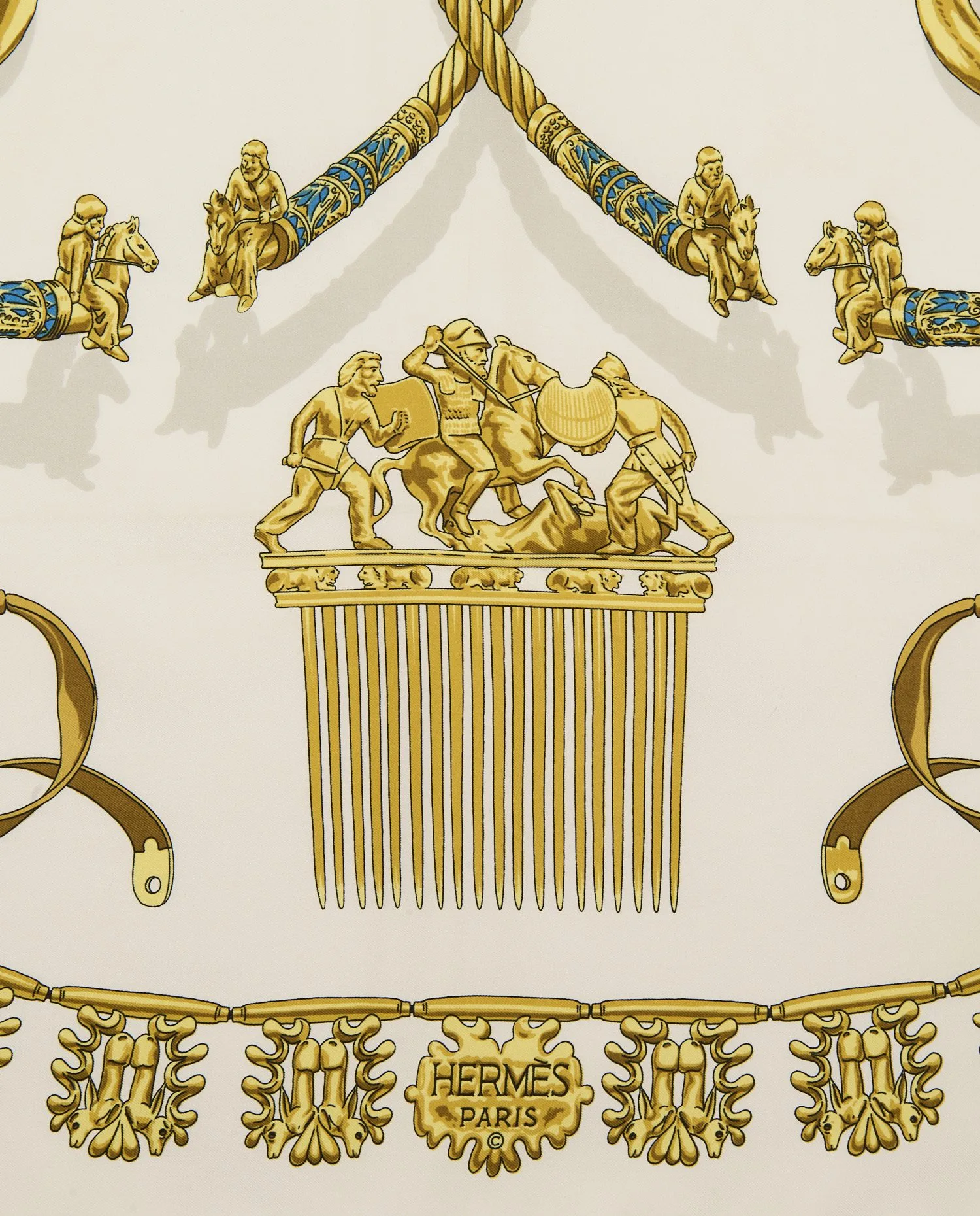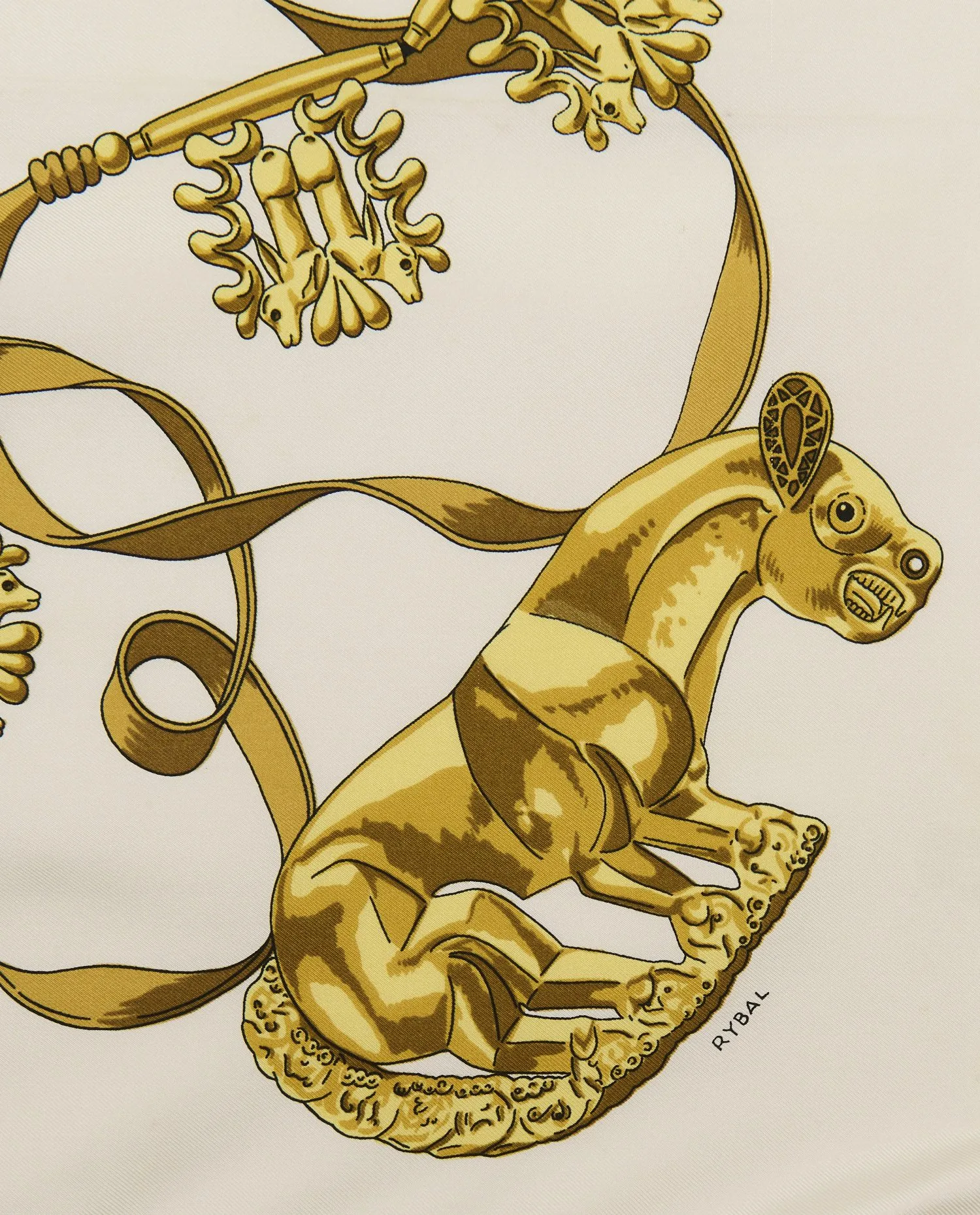 Créé en 1975 par Dimitri Rybaltchenko, « Les Cavaliers d’Or » s’inscrit dans une période où Hermès développe des carrés aux compositions érudites, inspirées de l’histoire, de l’archéologie et des arts décoratifs. Rybaltchenko, formé aux Beaux-Arts, est l’un des artistes majeurs ayant marqué l’esthétique de la maison au XXe siècle. Son approche se distingue par une construction rigoureuse du motif, une grande précision du trait et une recherche iconographique approfondie.