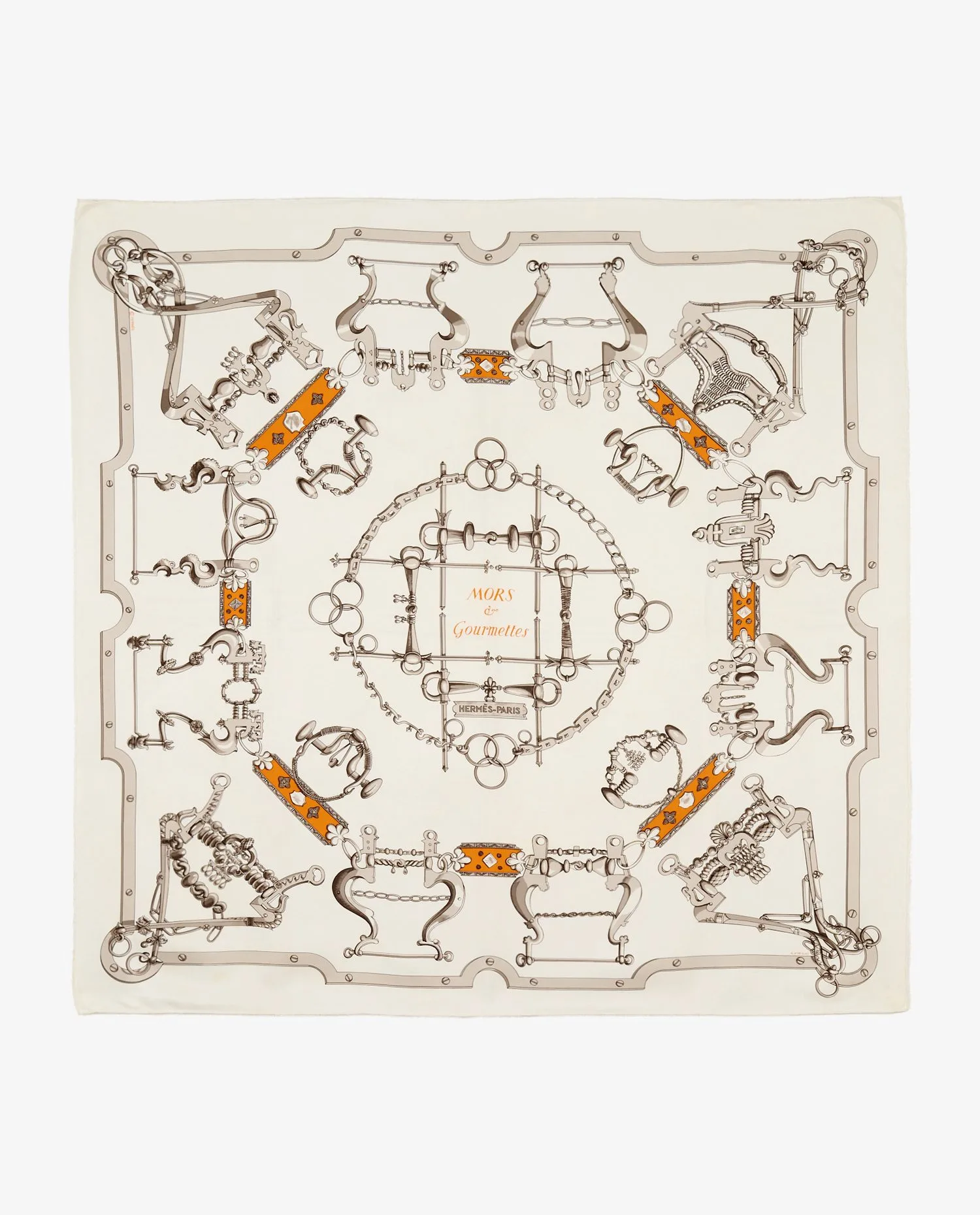 Créé en 1961 par Henri d’Origny, « Mors et Gourmettes » s’inscrit dans la tradition équestre fondatrice de la maison Hermès, établie en 1837 comme atelier de harnachement. Le dessin illustre avec précision des éléments techniques du monde du cheval, transformés en composition graphique structurée. Réédité à plusieurs reprises, ce modèle fait partie des classiques du carré Hermès vintage, apprécié pour son équilibre visuel et son ancrage dans l’héritage sellier de la marque. Il témoigne de la continuité stylistique d’Hermès, où le patrimoine équestre devient un langage décoratif durable.